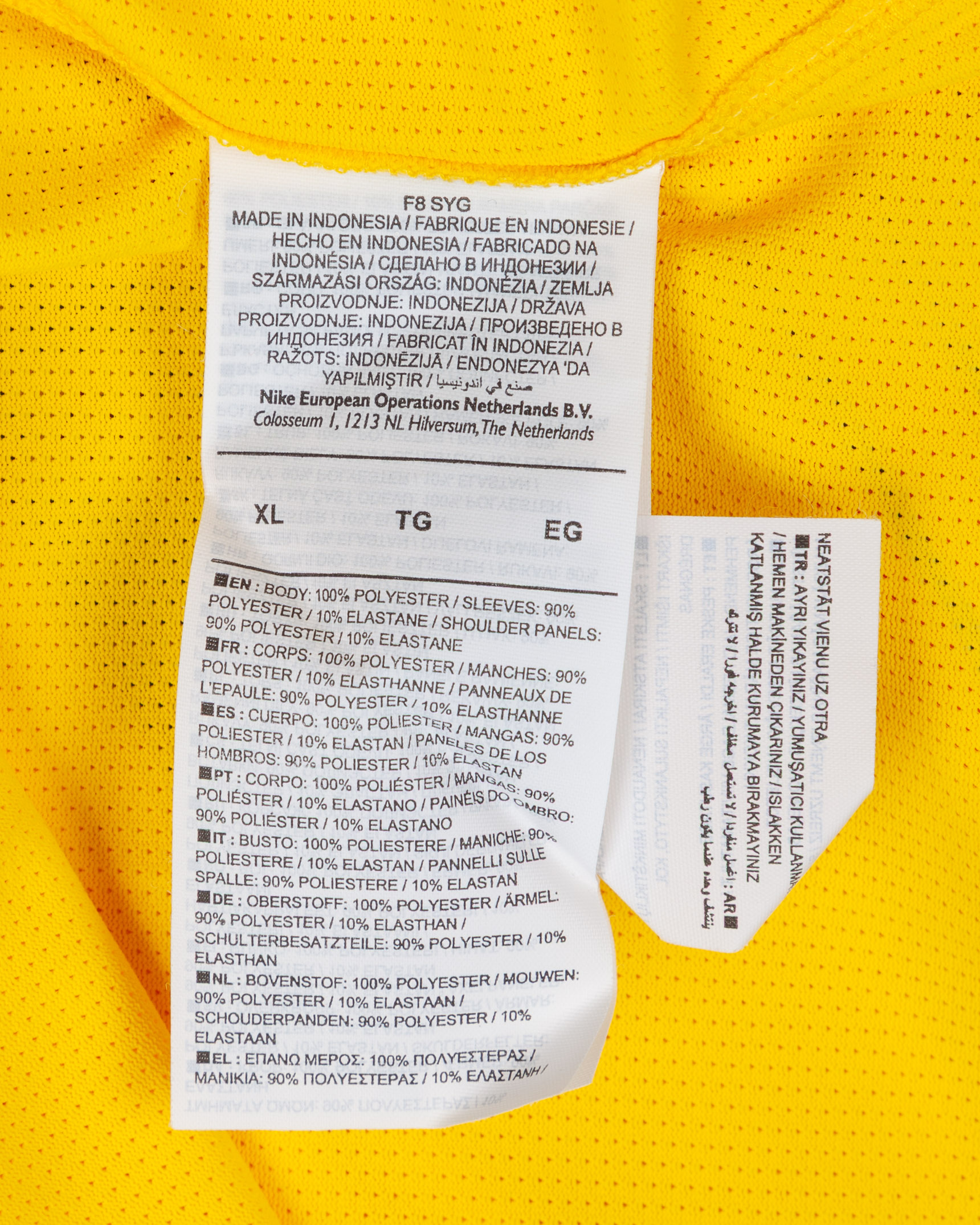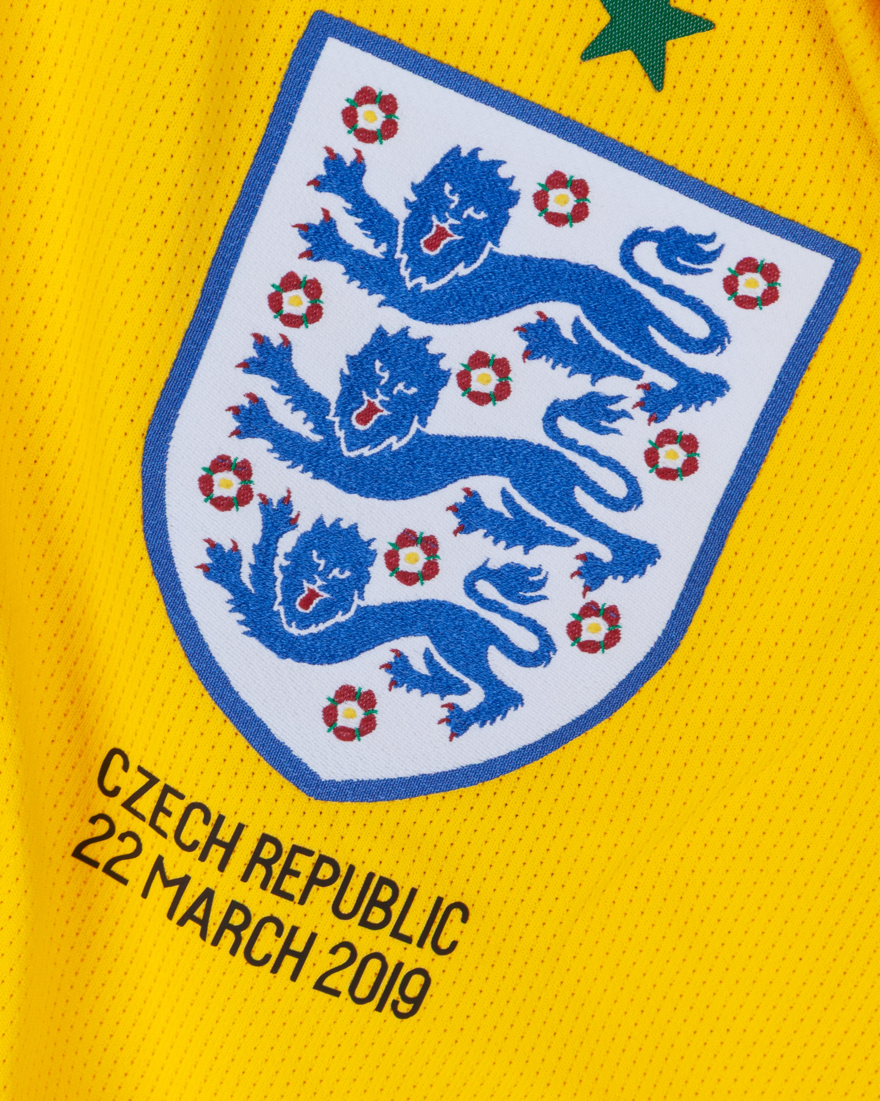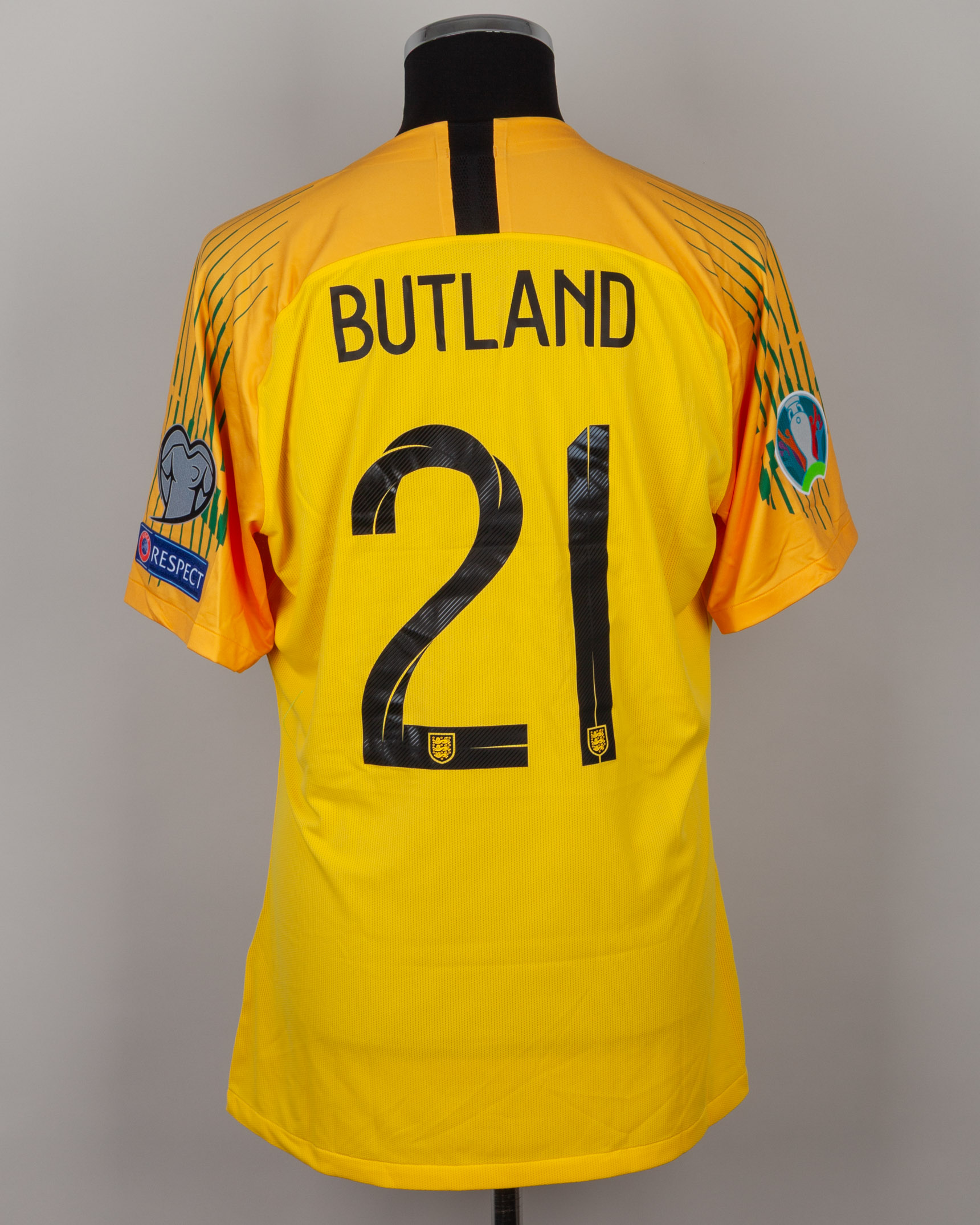Jack Butland yellow and green No.21 England v. Czech Republic short-sleeved shirt, 2019, Nike, XL, with v-neck collar and printed badge, with CZECH REPUBLIC 22 MARCH 2019 decal, the reverse lettered BUTLAND, the right sleeve with Euro 2020 flash and the left sleeve with respect flash
