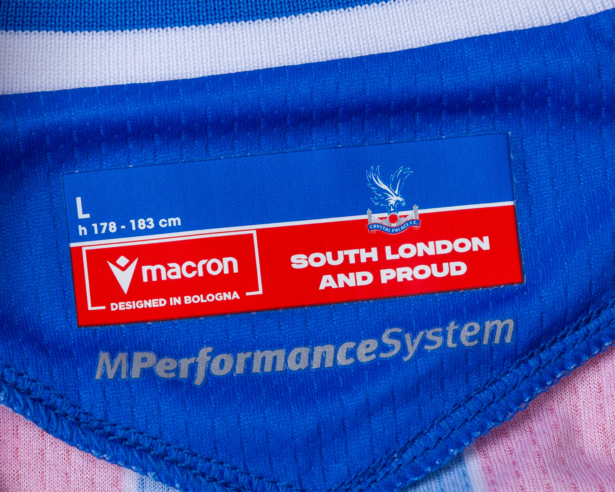 Jean-Pililppe Mateta red and blue No.14 Crystal Palace v. Dynamo Kyiv match worn shirt, UEFA Conference League 2025, Macron, with crew-neck collar and printed badge, the reverse lettered MATETA, the right sleeve with UEFA flash