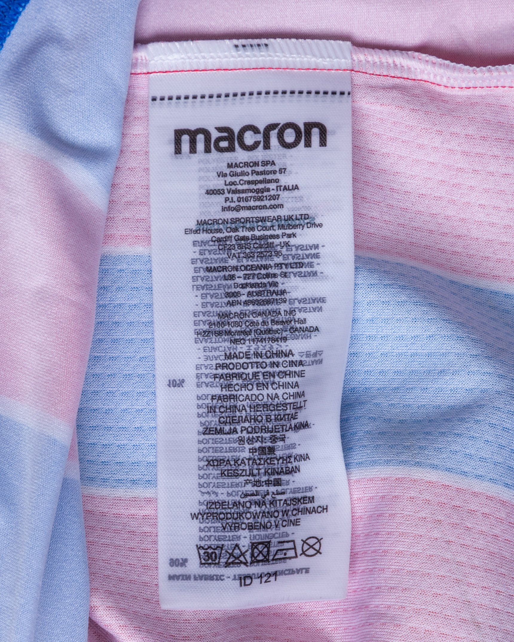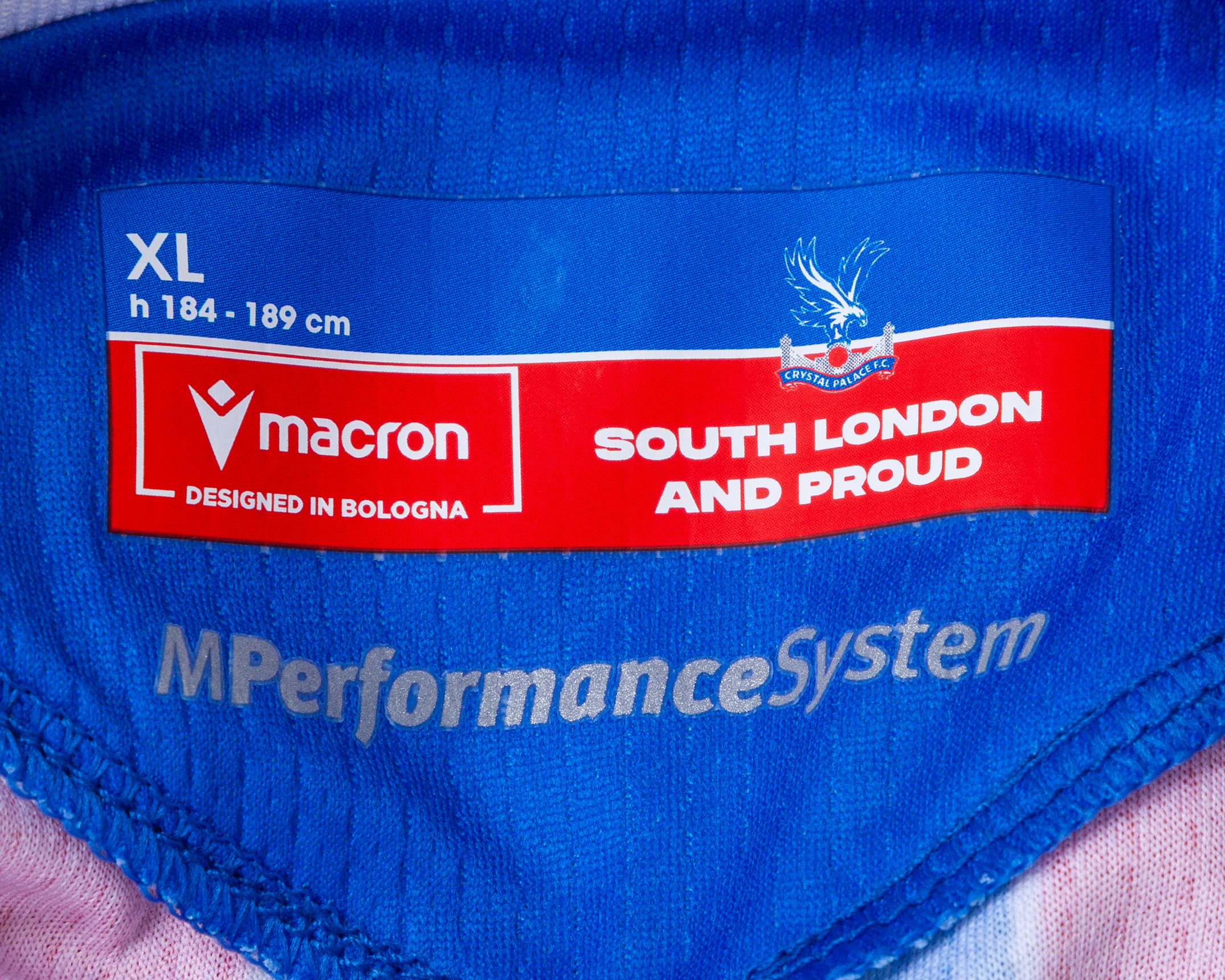Maxence Lacroix red and blue No.5 Crystal Palace v. Dynamo Kyiv match worn shirt, UEFA Conference League 2025, Macron, with crew-neck collar and printed badge, the reverse lettered LACROIX, the right sleeve with UEFA flash
