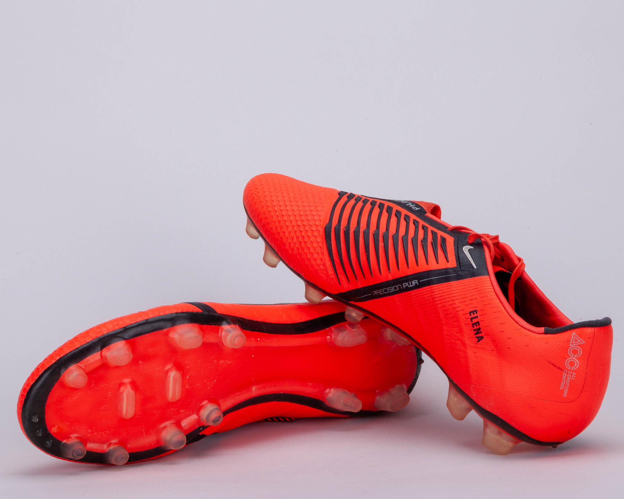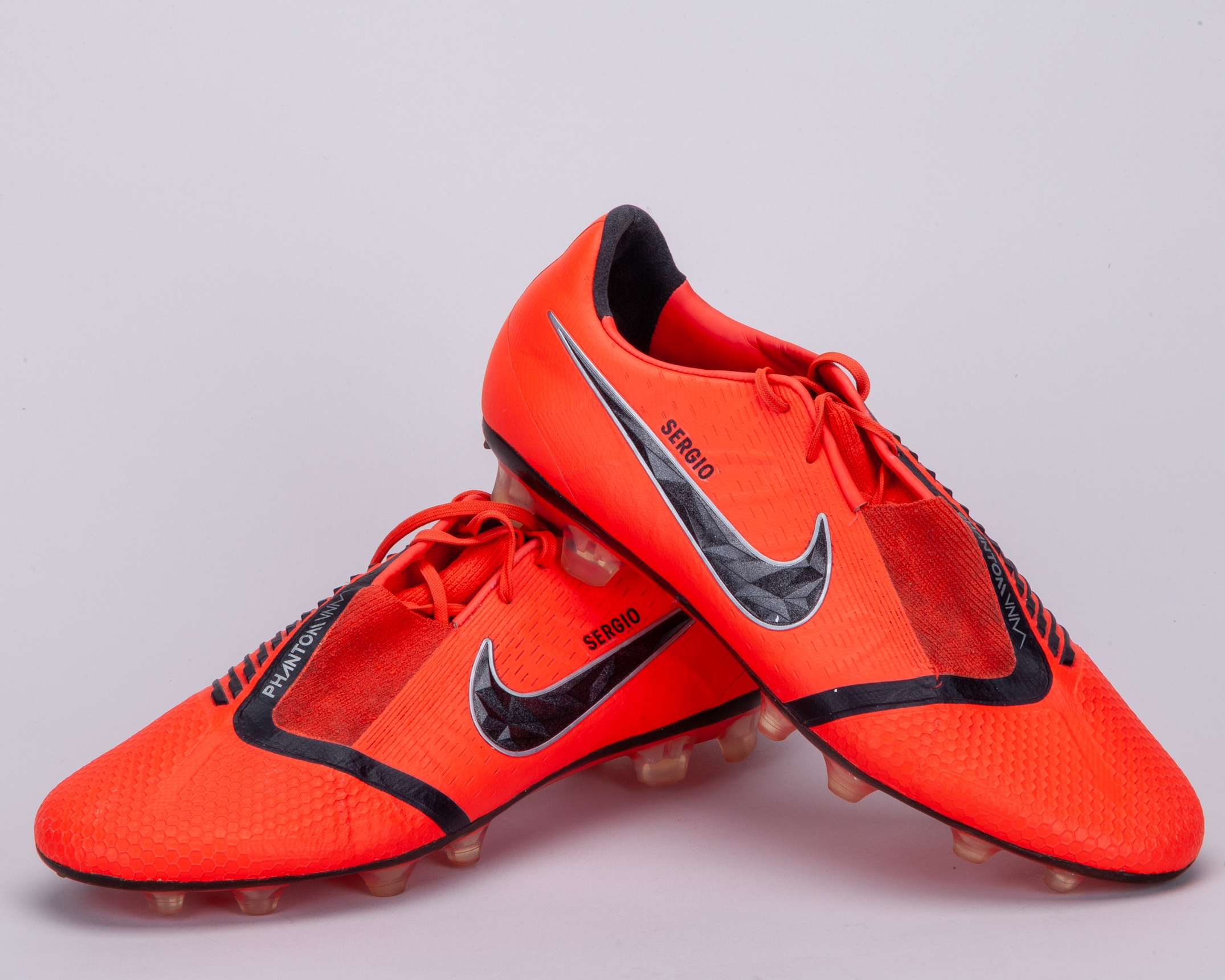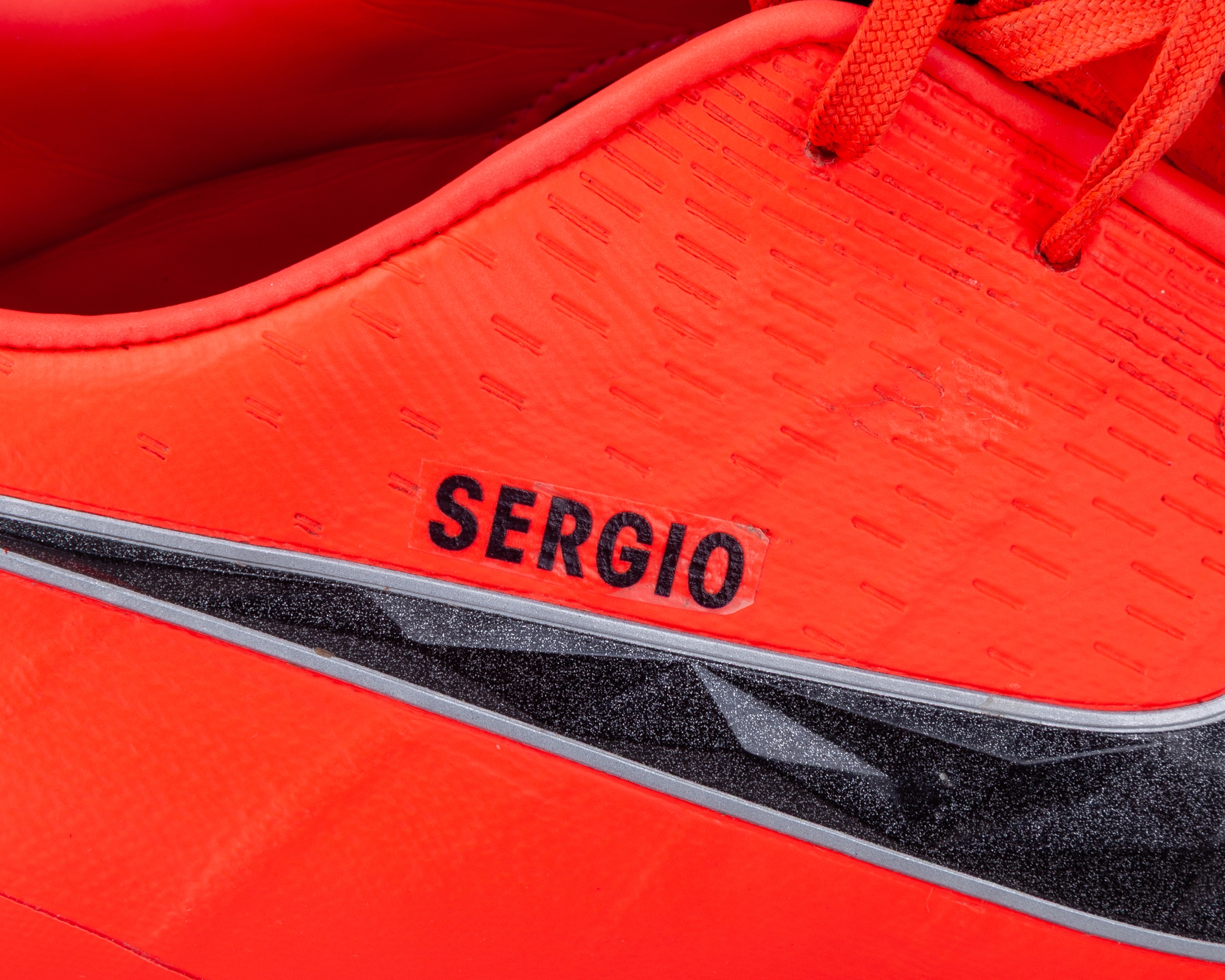 Sergio Busquets orange and black Nike Phantom Barcelona v. Real Madrid match worn football boots, 2019, with SERGIO decal on both boots, EKENA decal on right boot and ENZO & LEVI decal on left boot, with signs of wear and innersoles removed