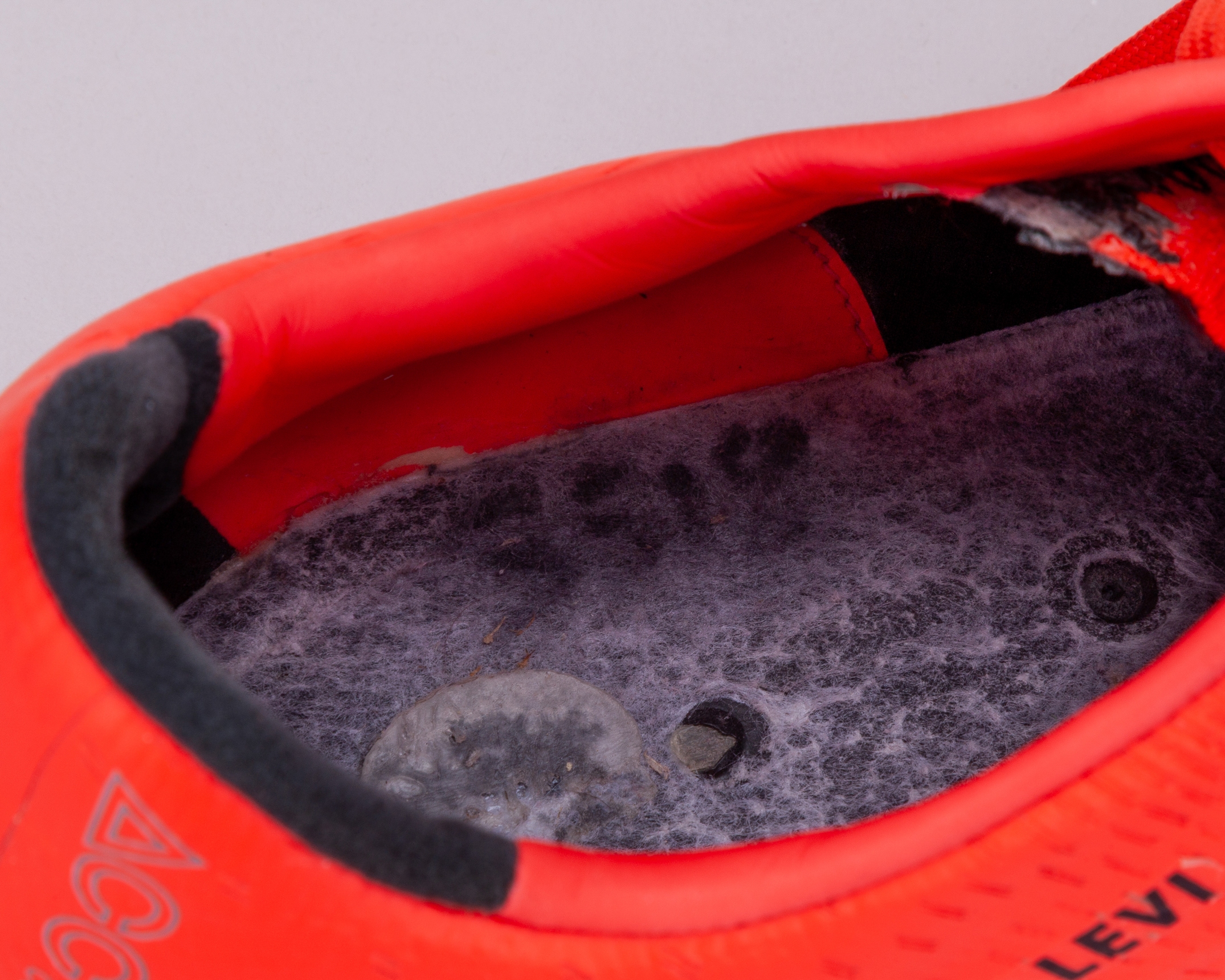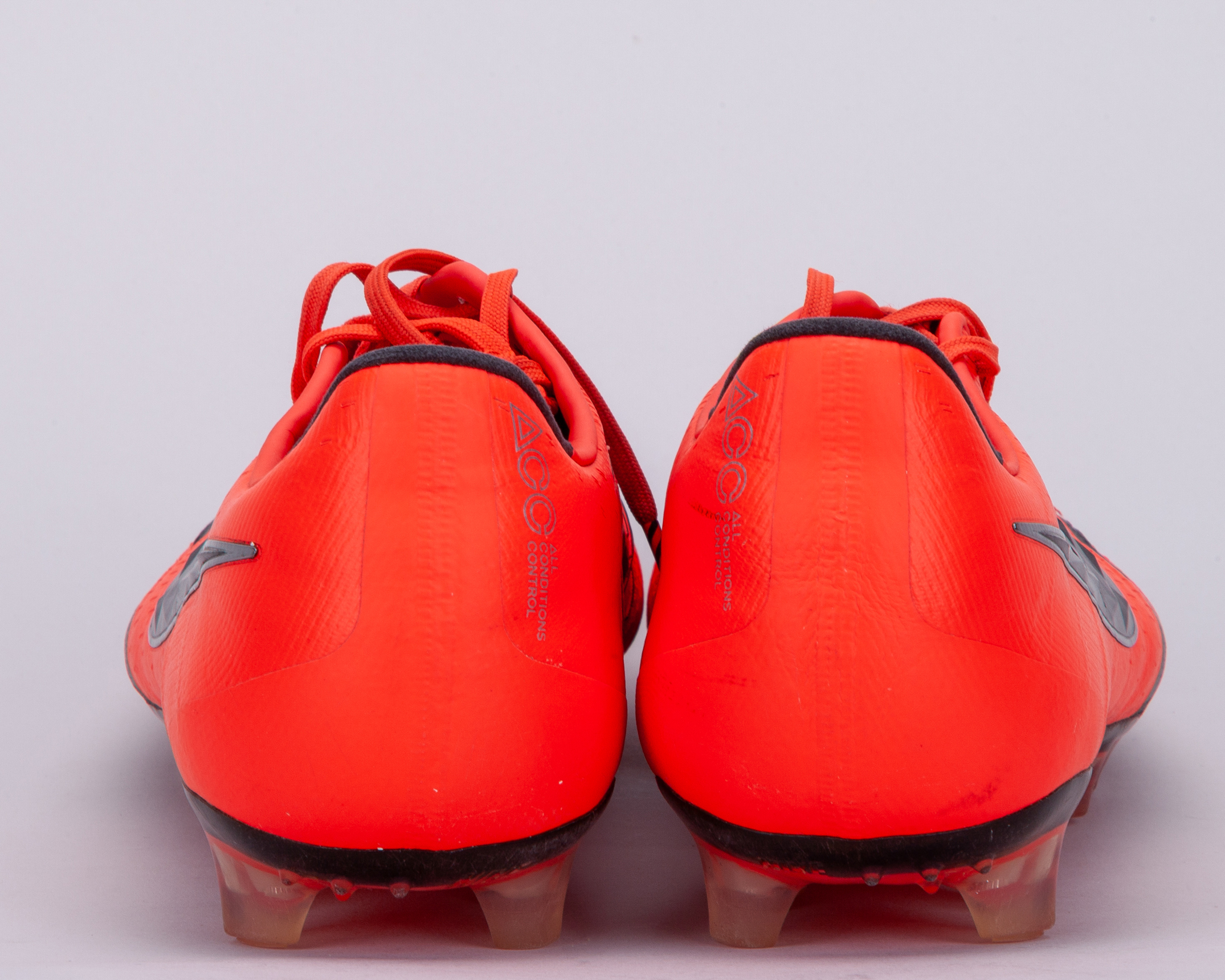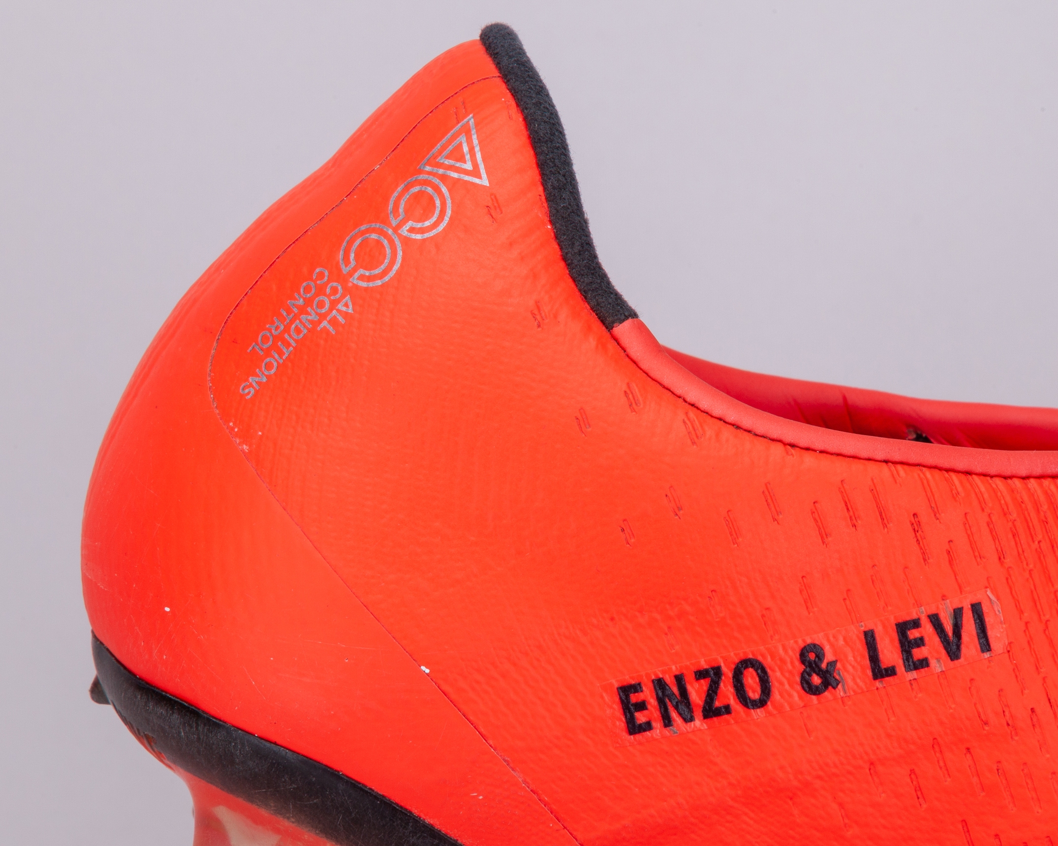 Sergio Busquets orange and black Nike Phantom Barcelona v. Real Madrid match worn football boots, 2019, with SERGIO decal on both boots, EKENA decal on right boot and ENZO & LEVI decal on left boot, with signs of wear and innersoles removed