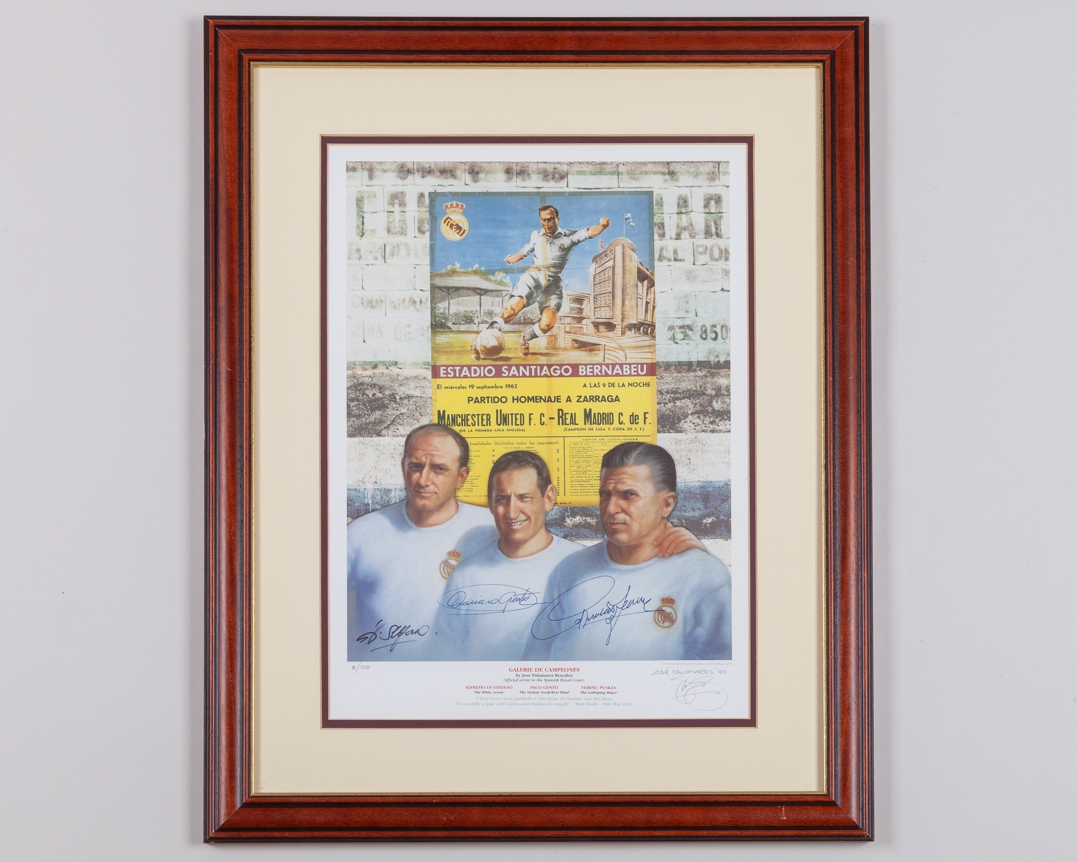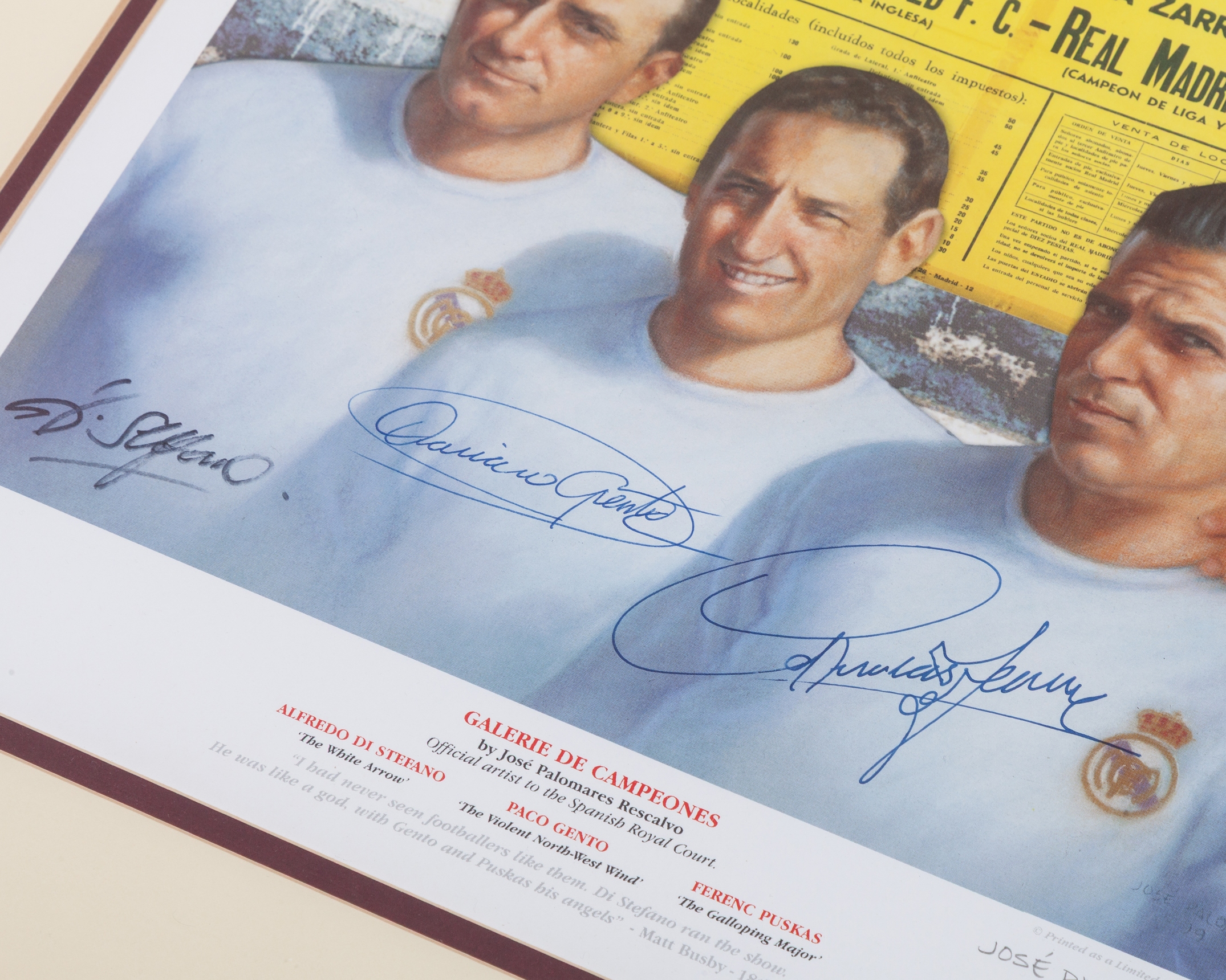 A limited edition colour print entitled Galerie de Campeones - Real Madrid Heros, by José Palomares, signed and inscribed 'Jose Palomares 99' (lower right) and autographed by Alfredo di Stefano, Paco Gento and Ferenc Puskas, No. 8 of an edition of 100, 58 x 43cm, framed and glazed