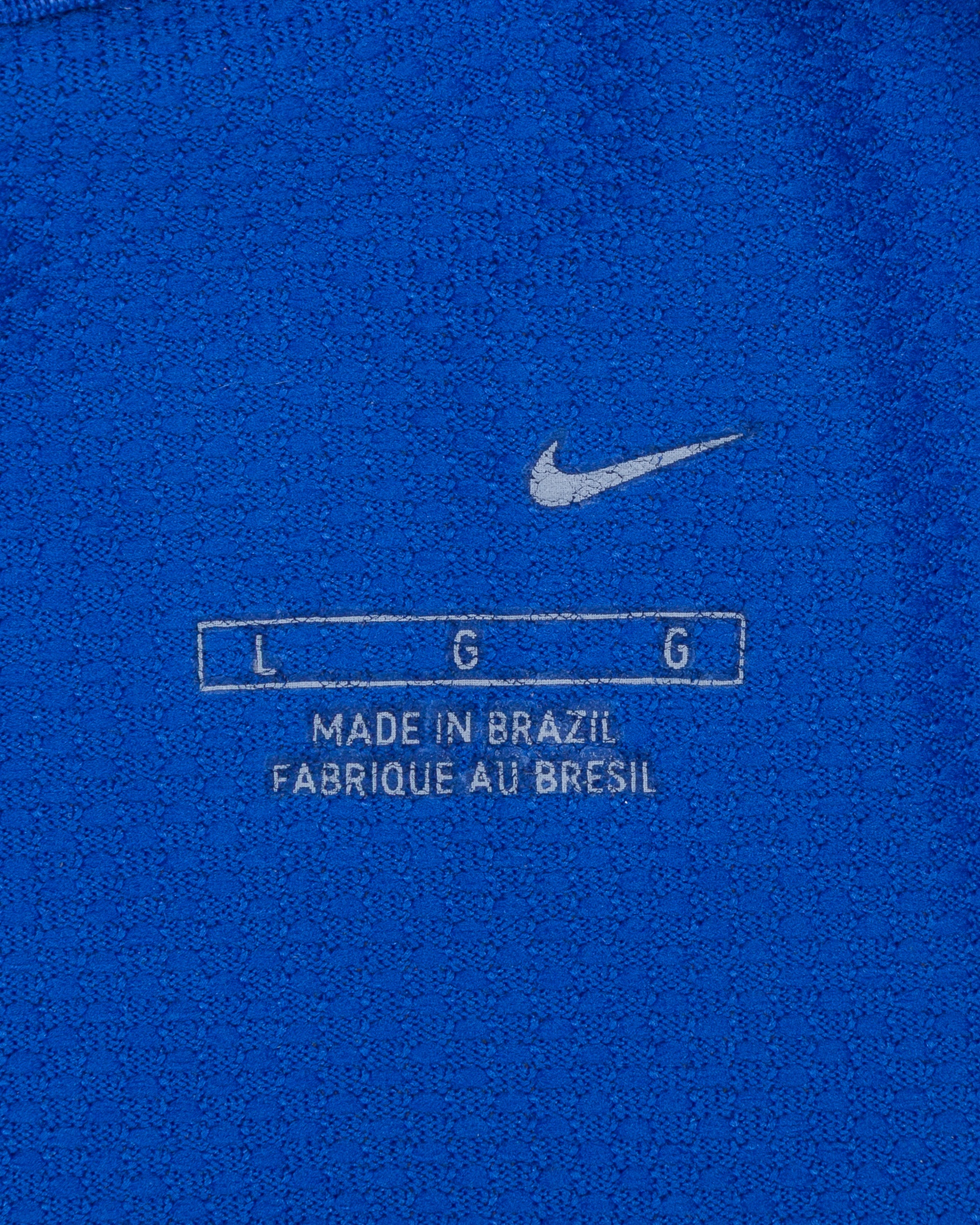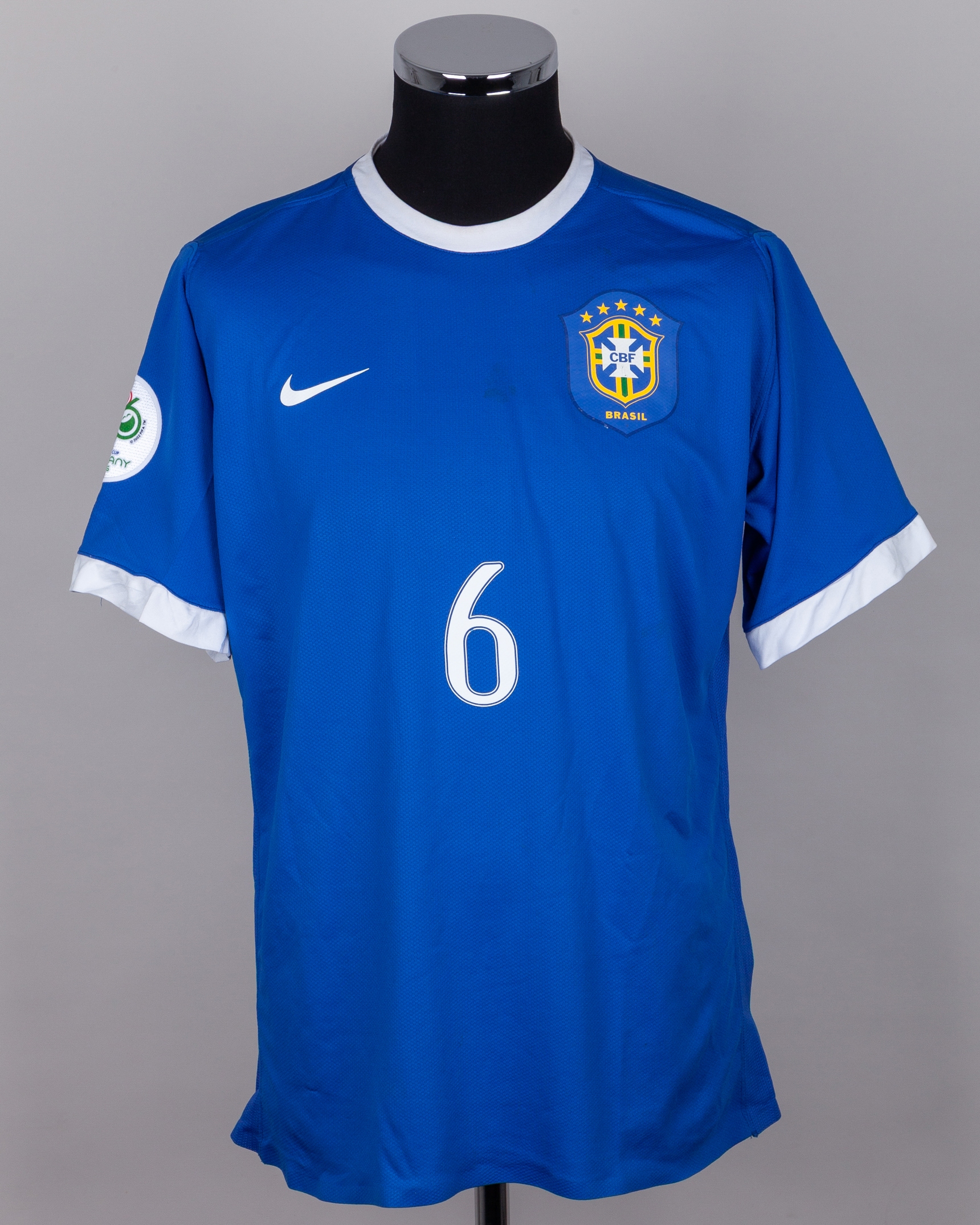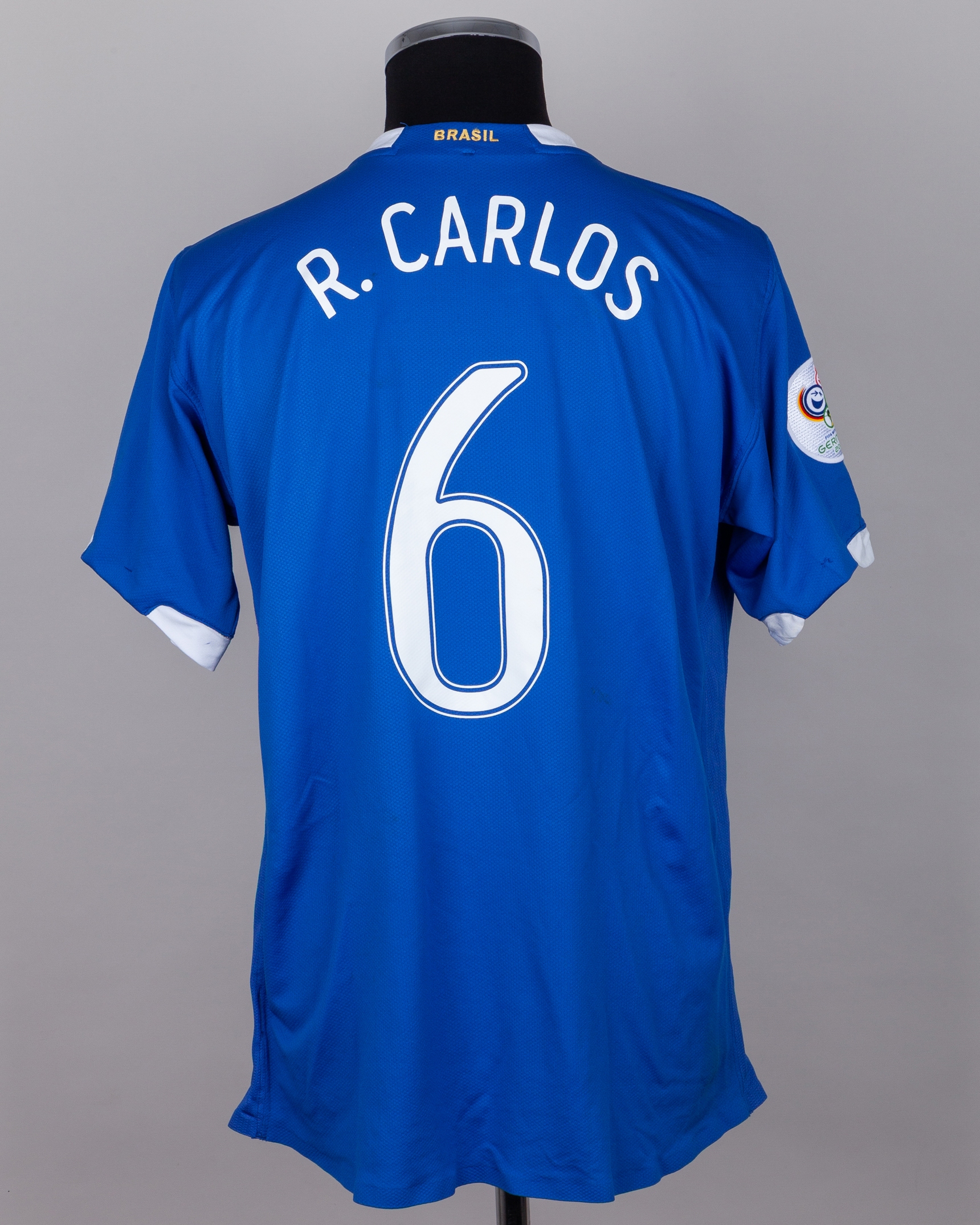 Roberto Carlos blue No.6 Brazil short-sleeved shirt, 2006, Nike, L, with crew-neck collar and printed badge, the reverse lettered R. CARLOS, the right sleeve with FIFA World Cup Germany 2006 flash, with some staining