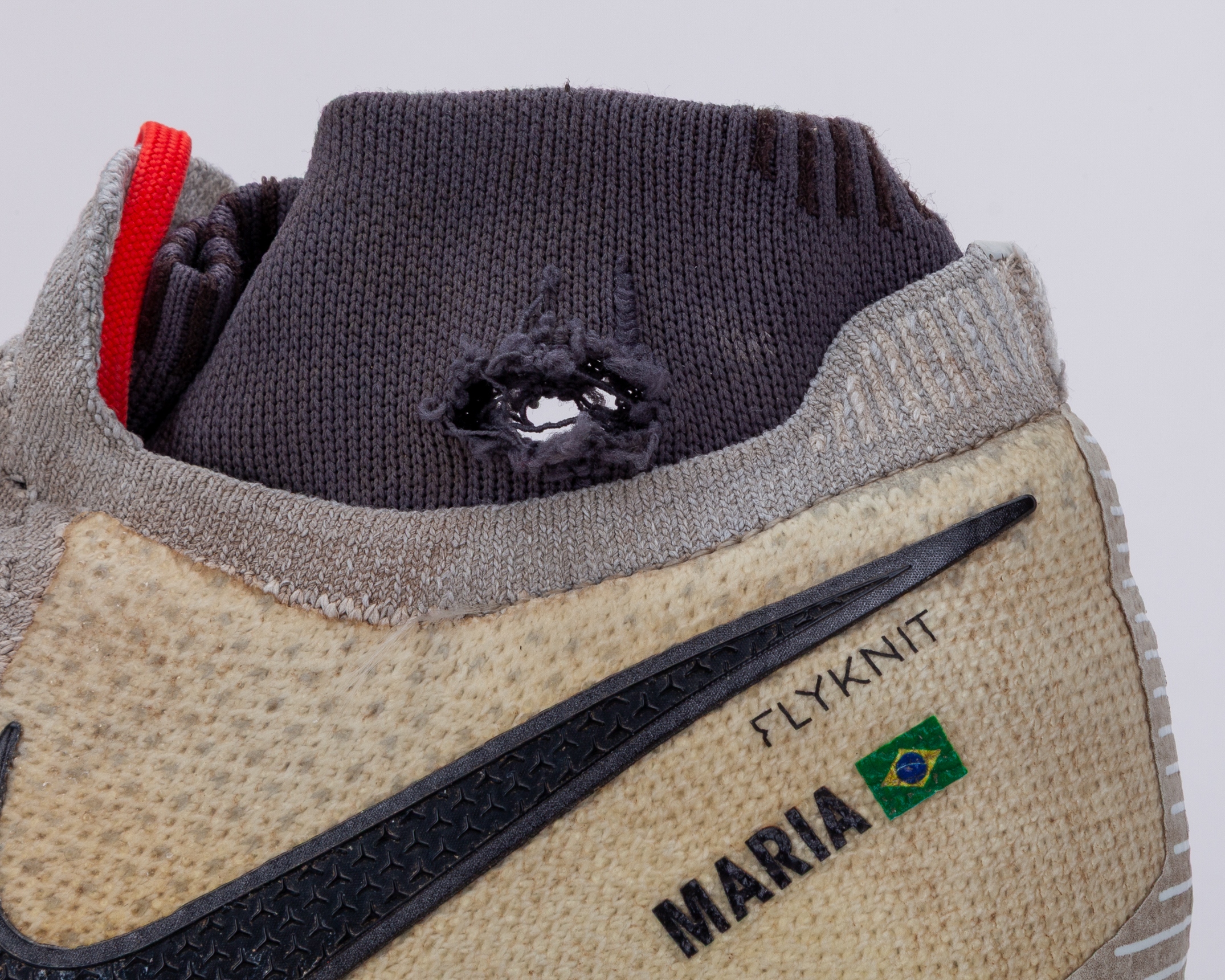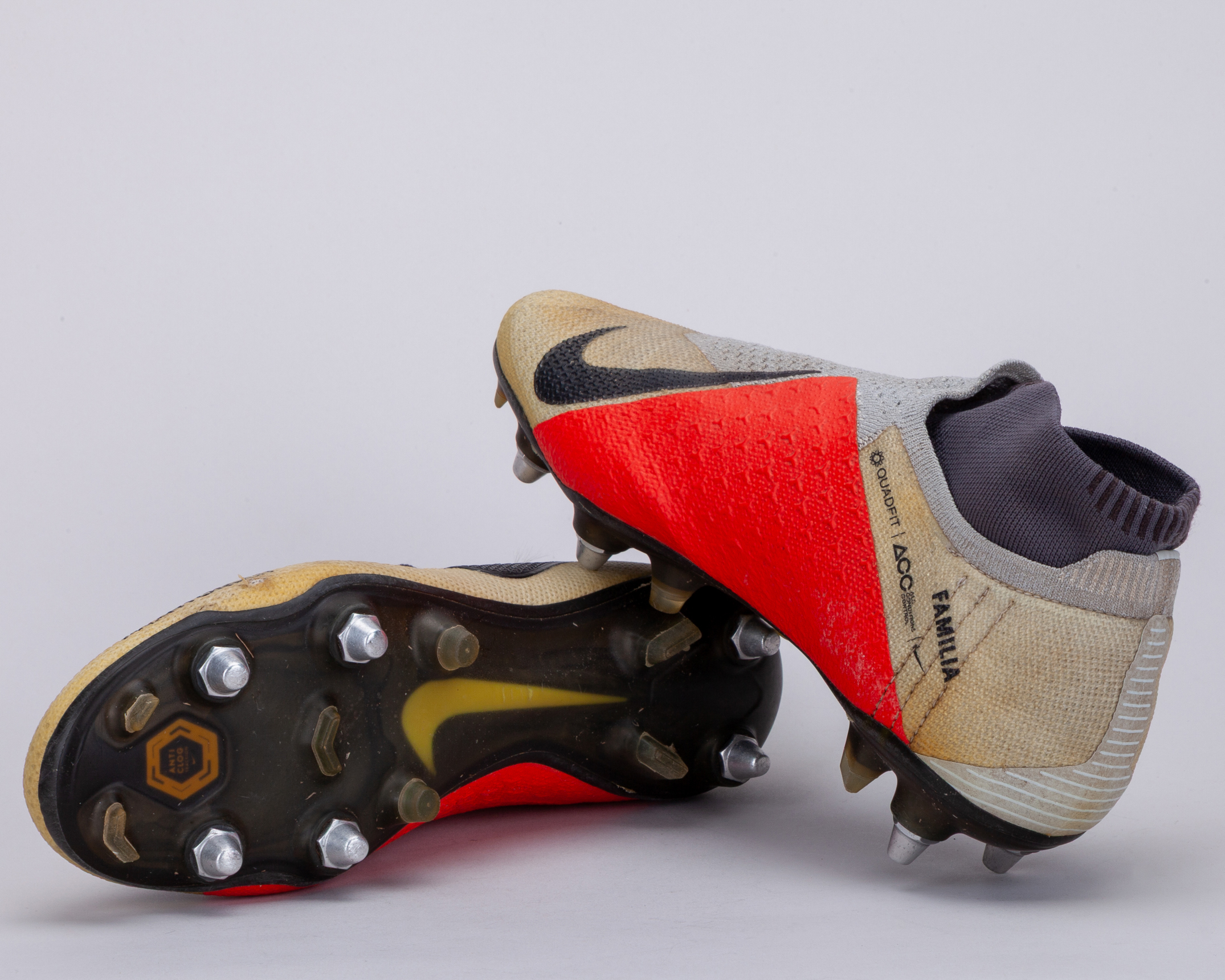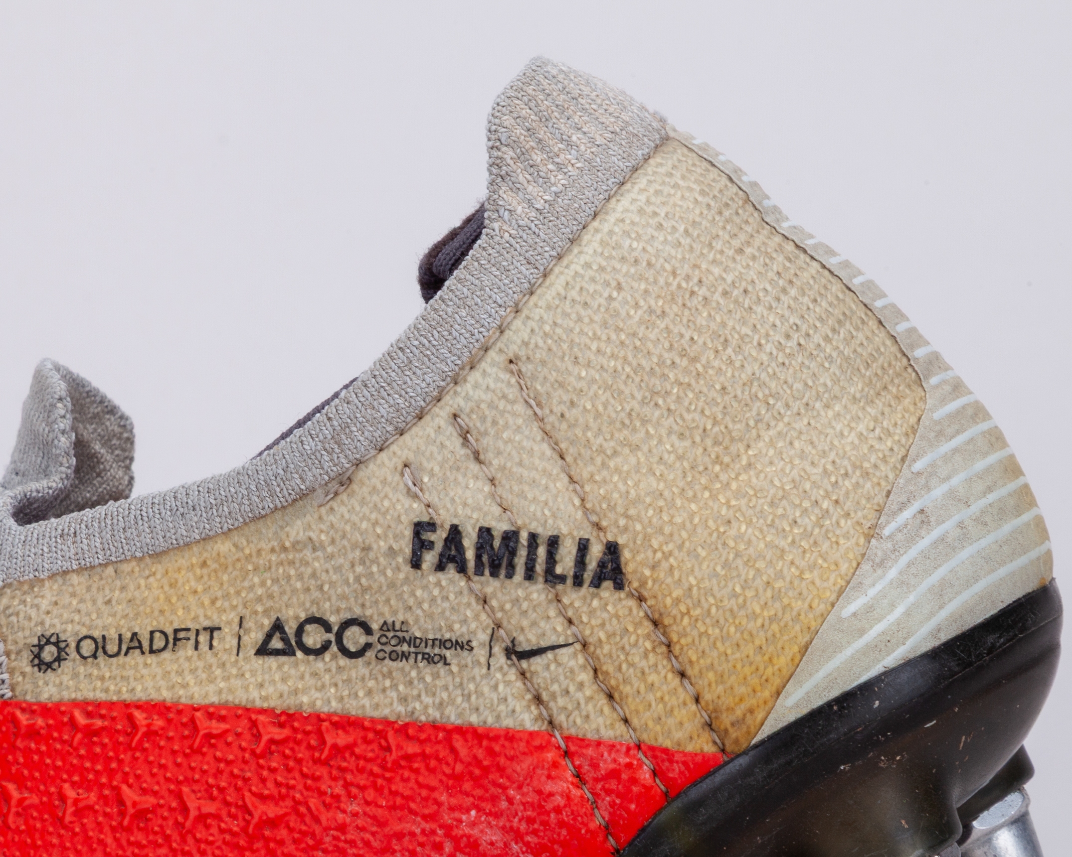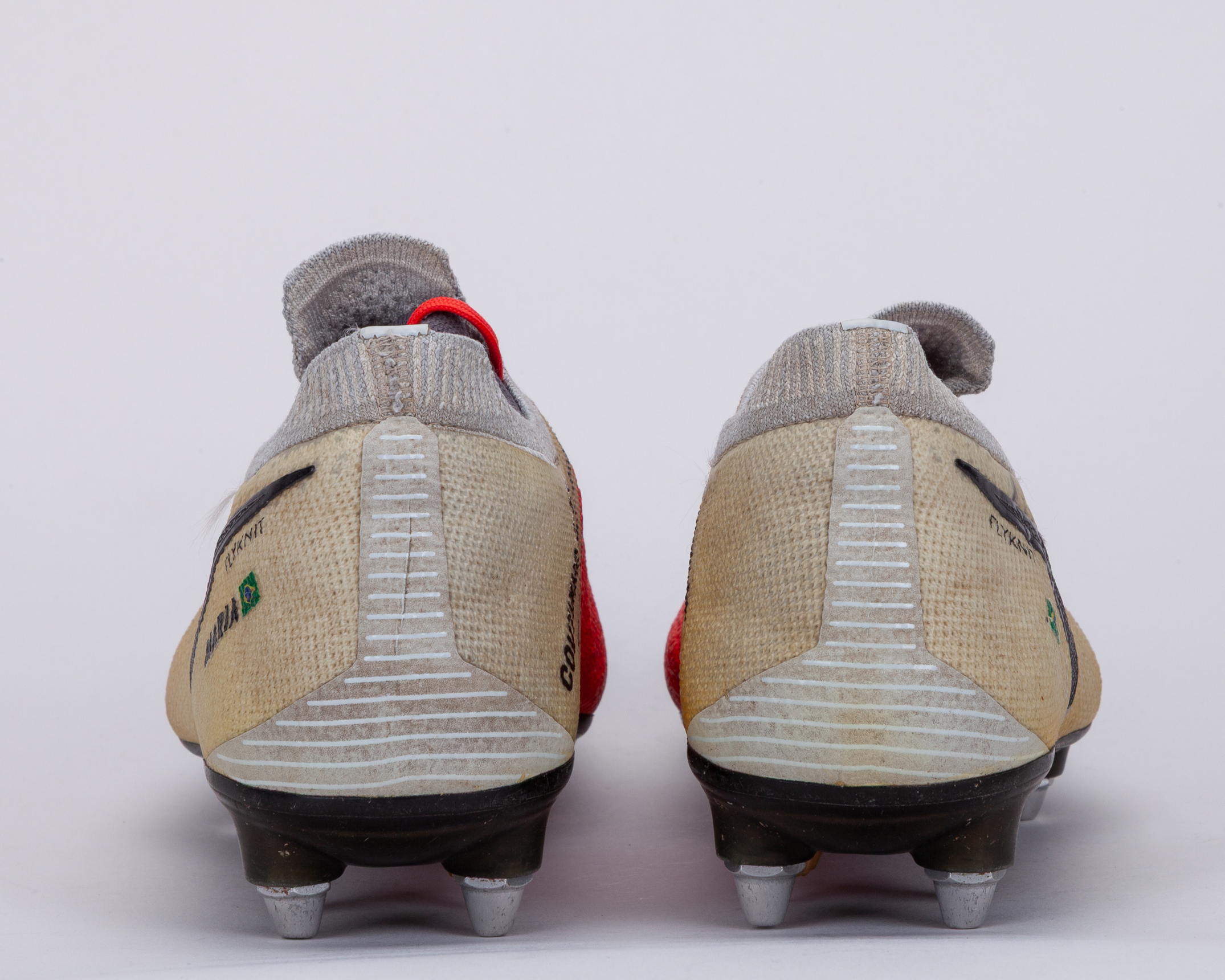 Philippe Coutinho grey and red Nike Phantom VSN match worn football boots, August 2018, with COUTINHO # 11 MARIA decal on left boot and FAMILIA decal on right boot, with signs of wear, with some holes, staining and decal rubbed with letters missing