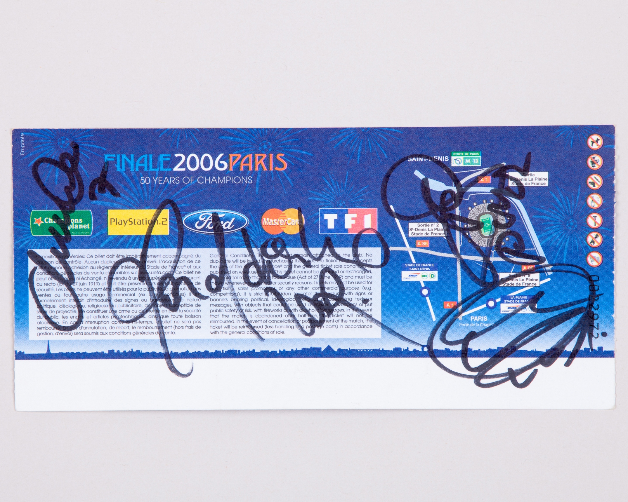 Barcelona v. Arsenal autographed UEFA Champions League Final ticket 2006, with nine autographs including on the front: Lionel Messi, Juliano Belletti, Xavi, Jose Edmilson, Andres Iniesta and on the back: Ronaldinho, Henrik Larrson, Carles Puyol and Victor Valdes