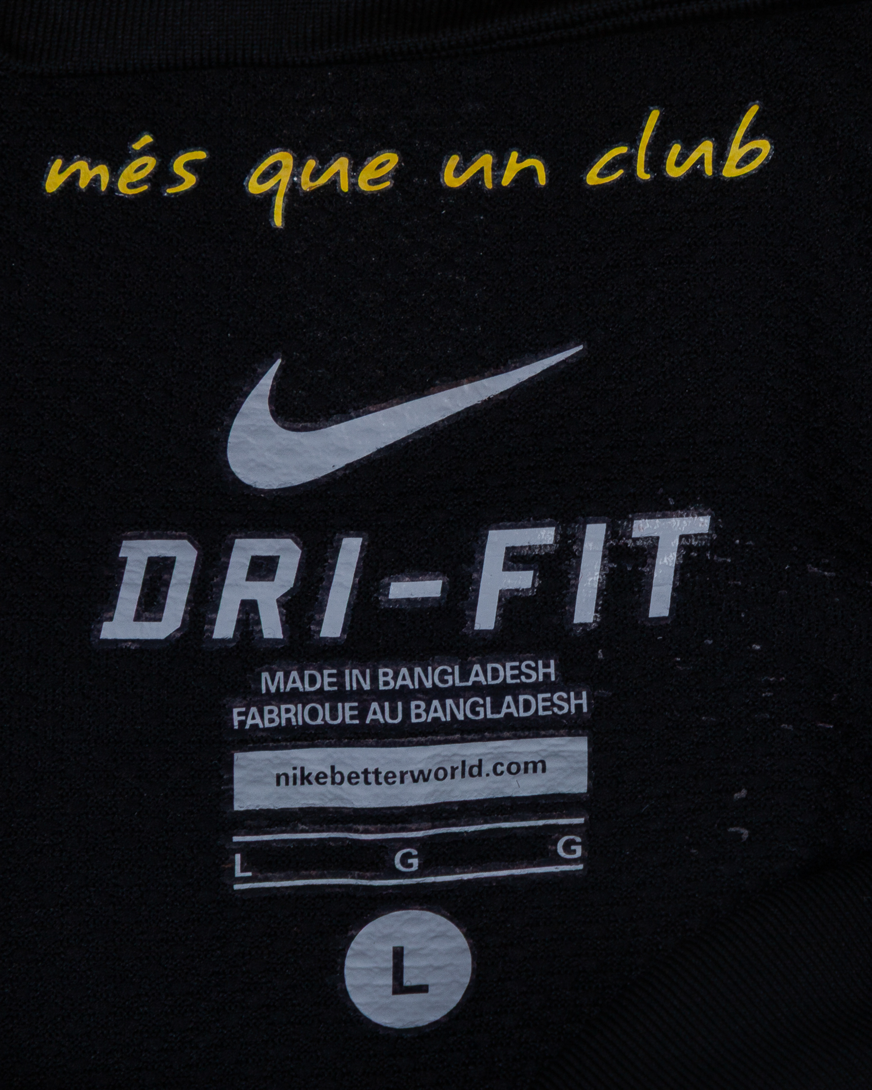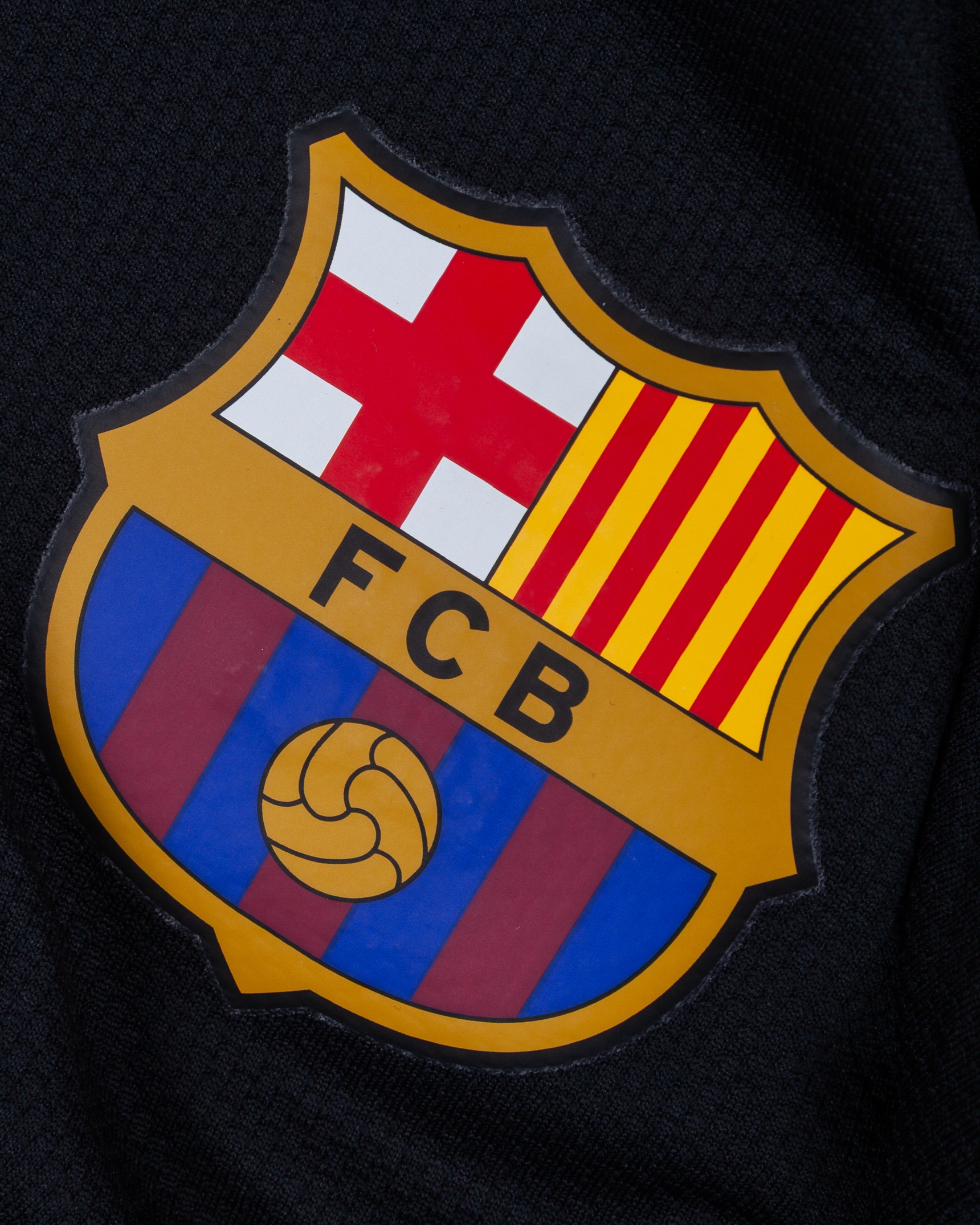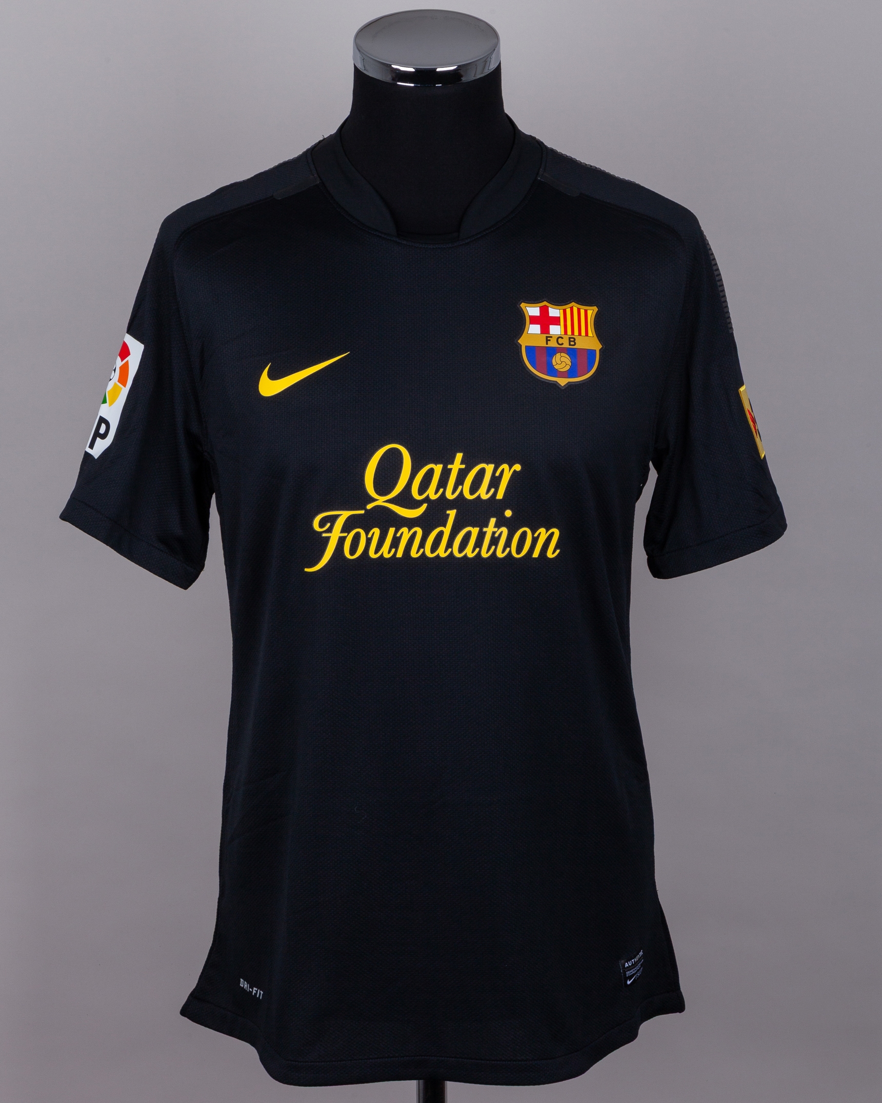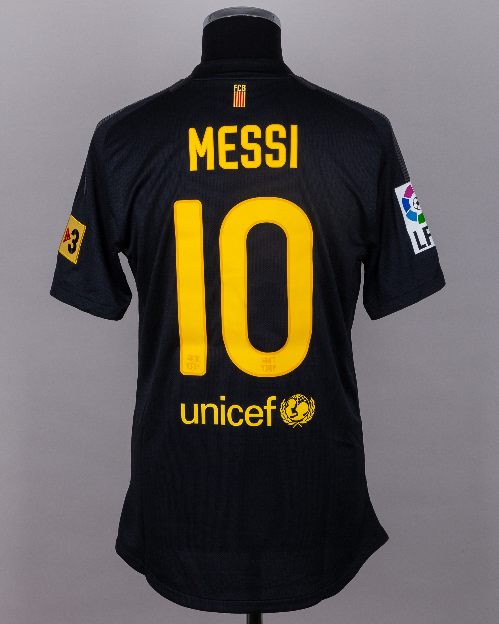 Lionel Messi black No.10 Barcelona short-sleeved shirt, 2011-12, Nike, L, with crew-neck collar and printed badge, the reverse lettered MESSI, the right sleeve with LFP flash and the left sleeve with channel 3 flash