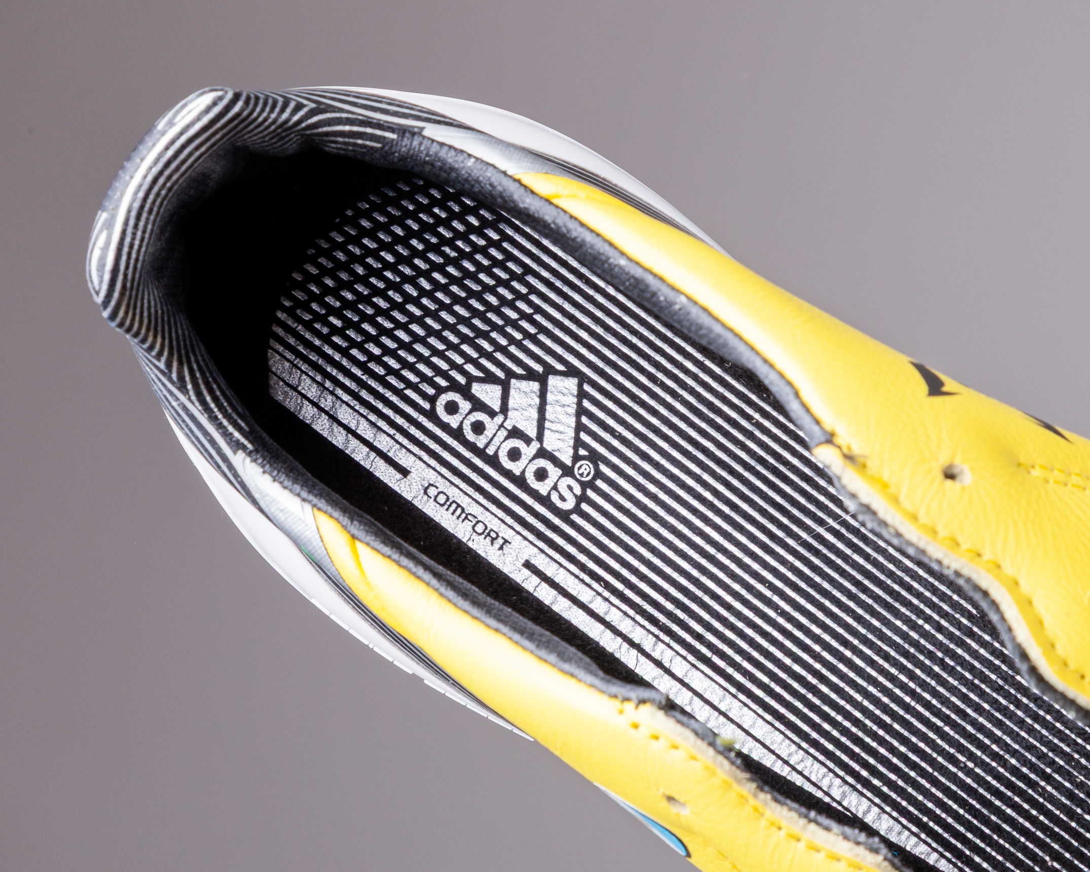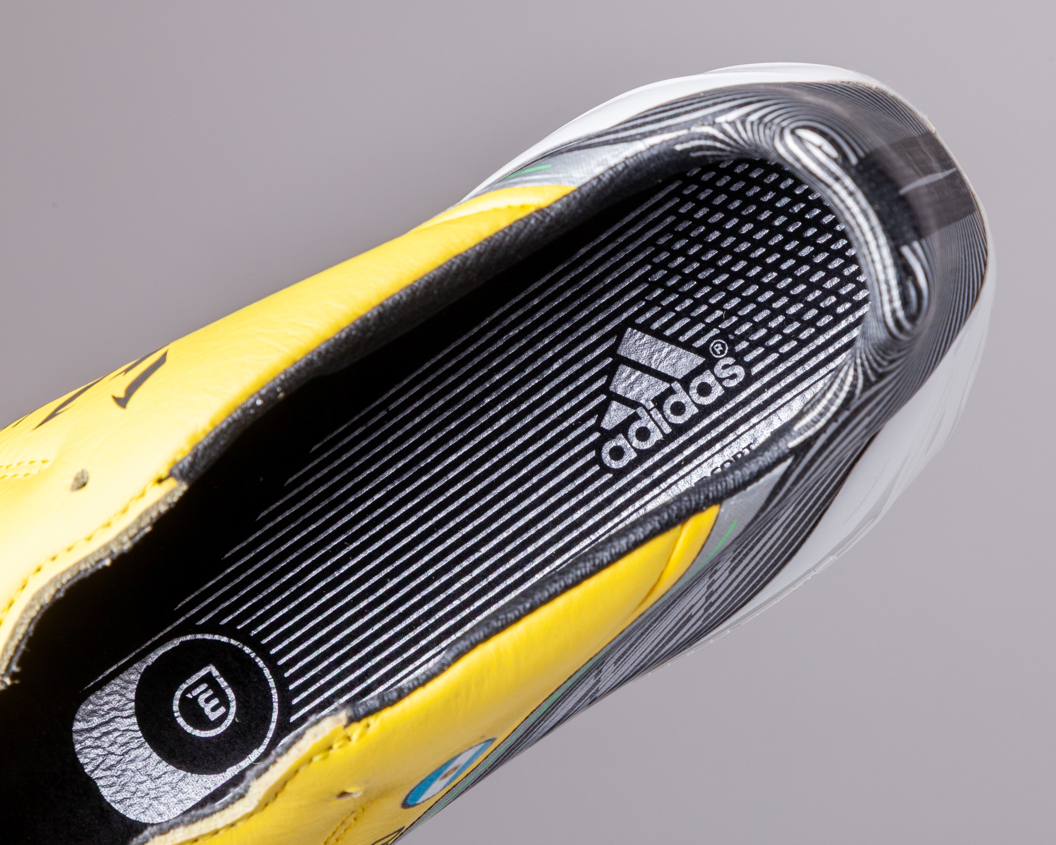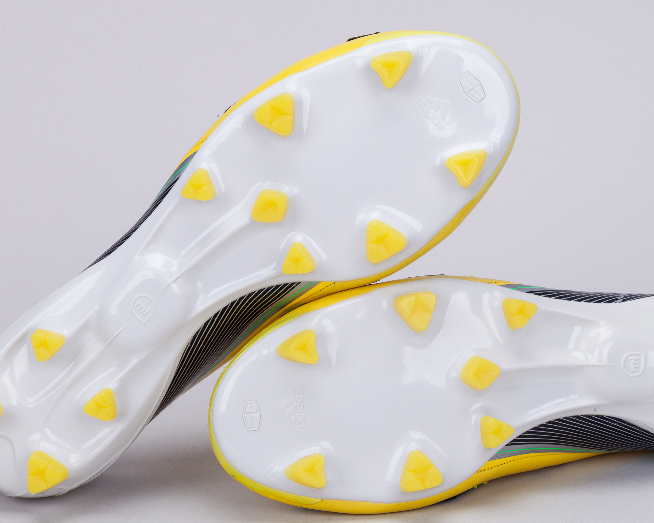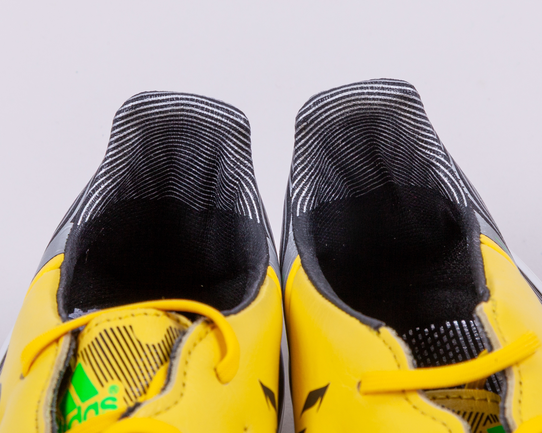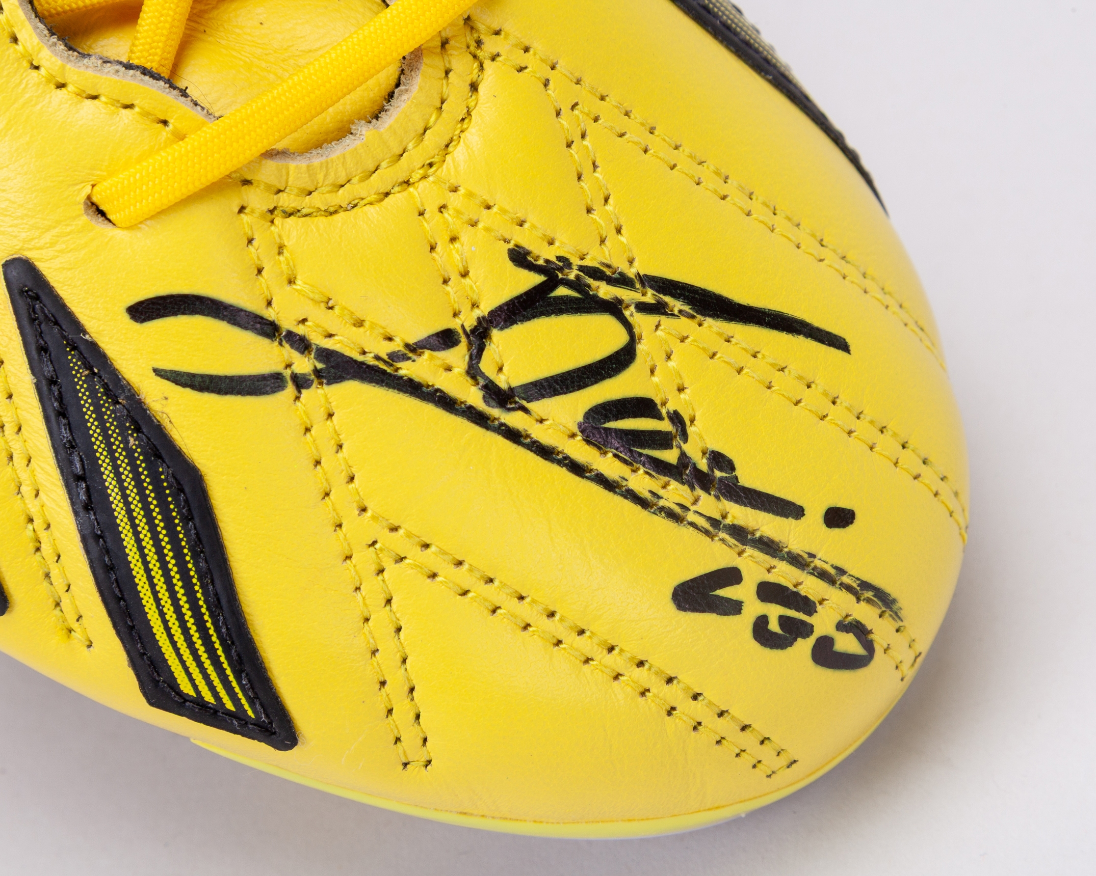 Lionel Messi a pair of yellow Adidas Adizero f50 autographed football boots, the right boot autographed by Messi, UK 8.5