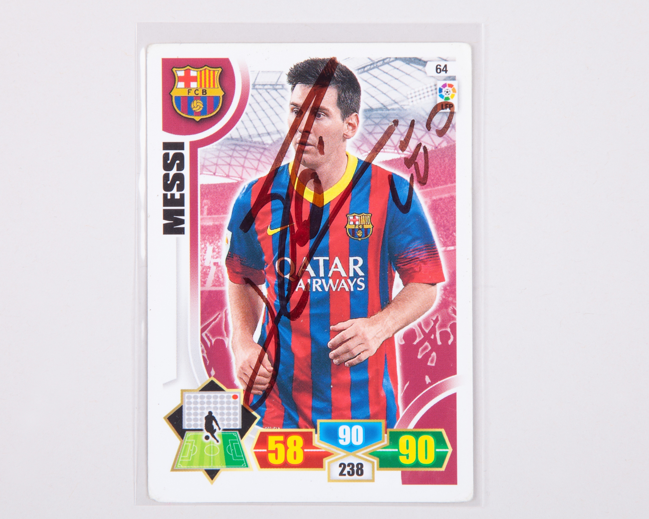Lionel Messi autographed Barcelona Panini No.64 Adrenalyn XL trading card, 2013-14