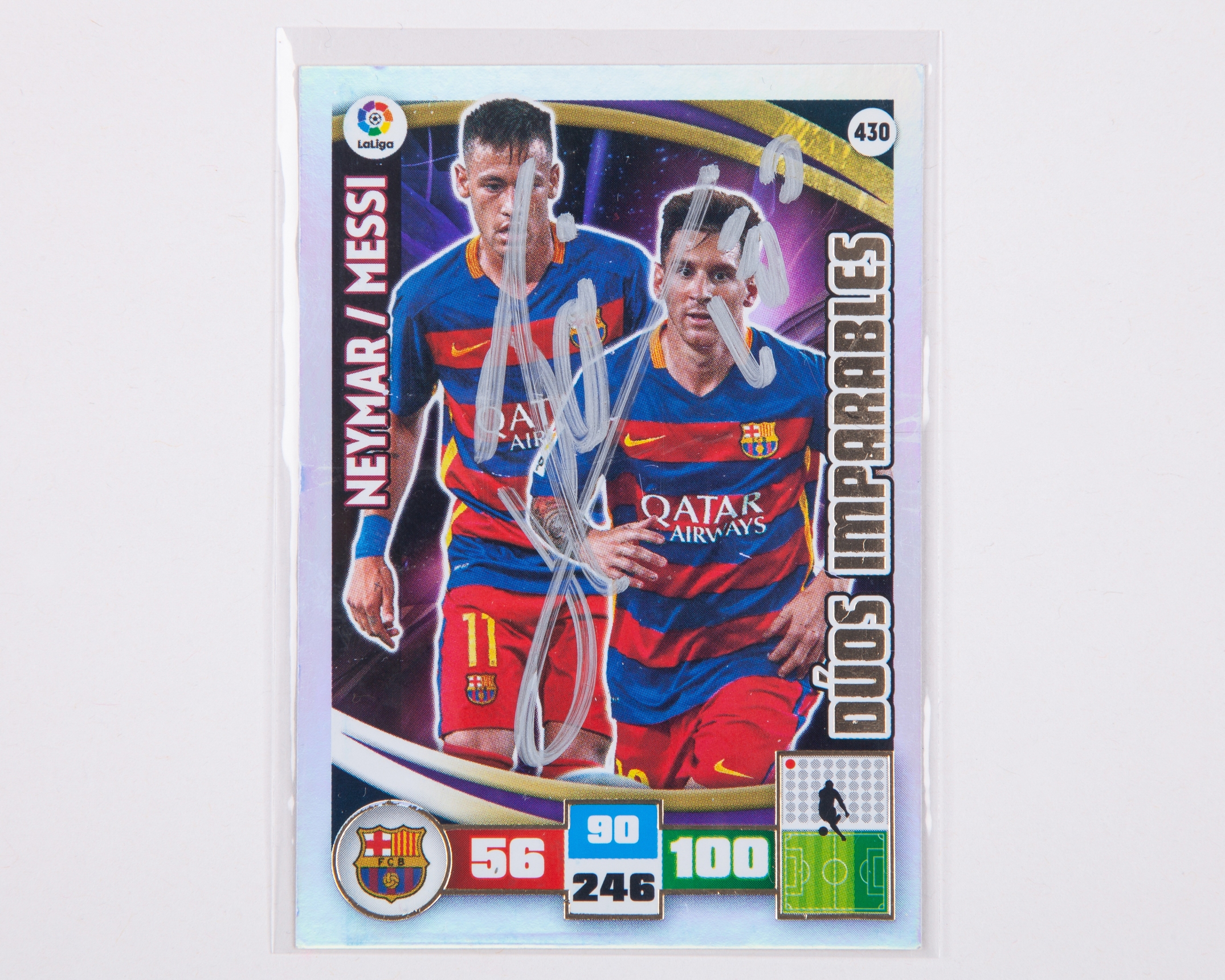 Lionel Messi autographed Barcelona Panini No.430 Neymar/Messi Duos Imparables Adrenalyn XL trading card, 2015-16