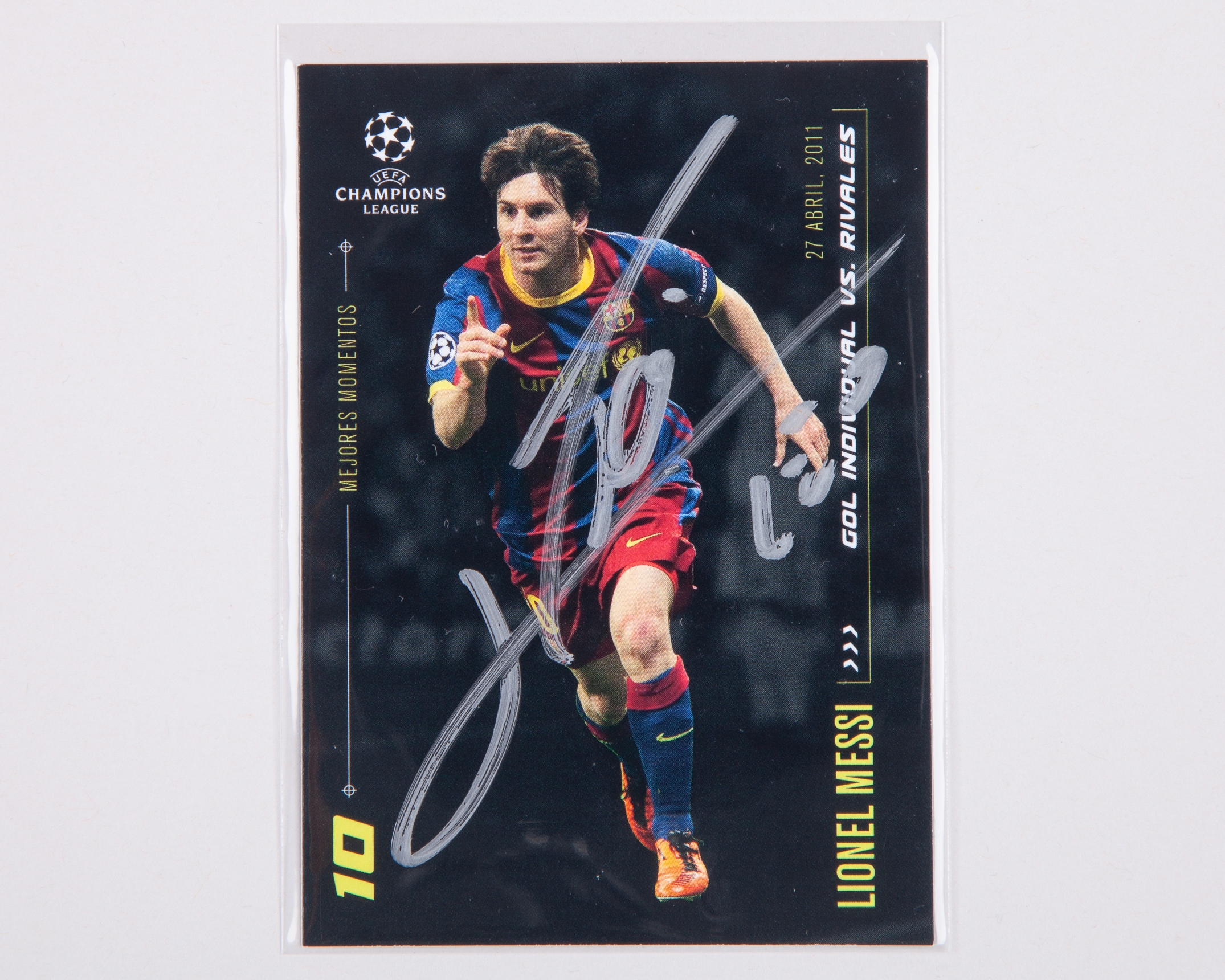 Lionel Messi autographed Barcelona Champions League Topps Mejores Momentos trading card, 27th April 2011