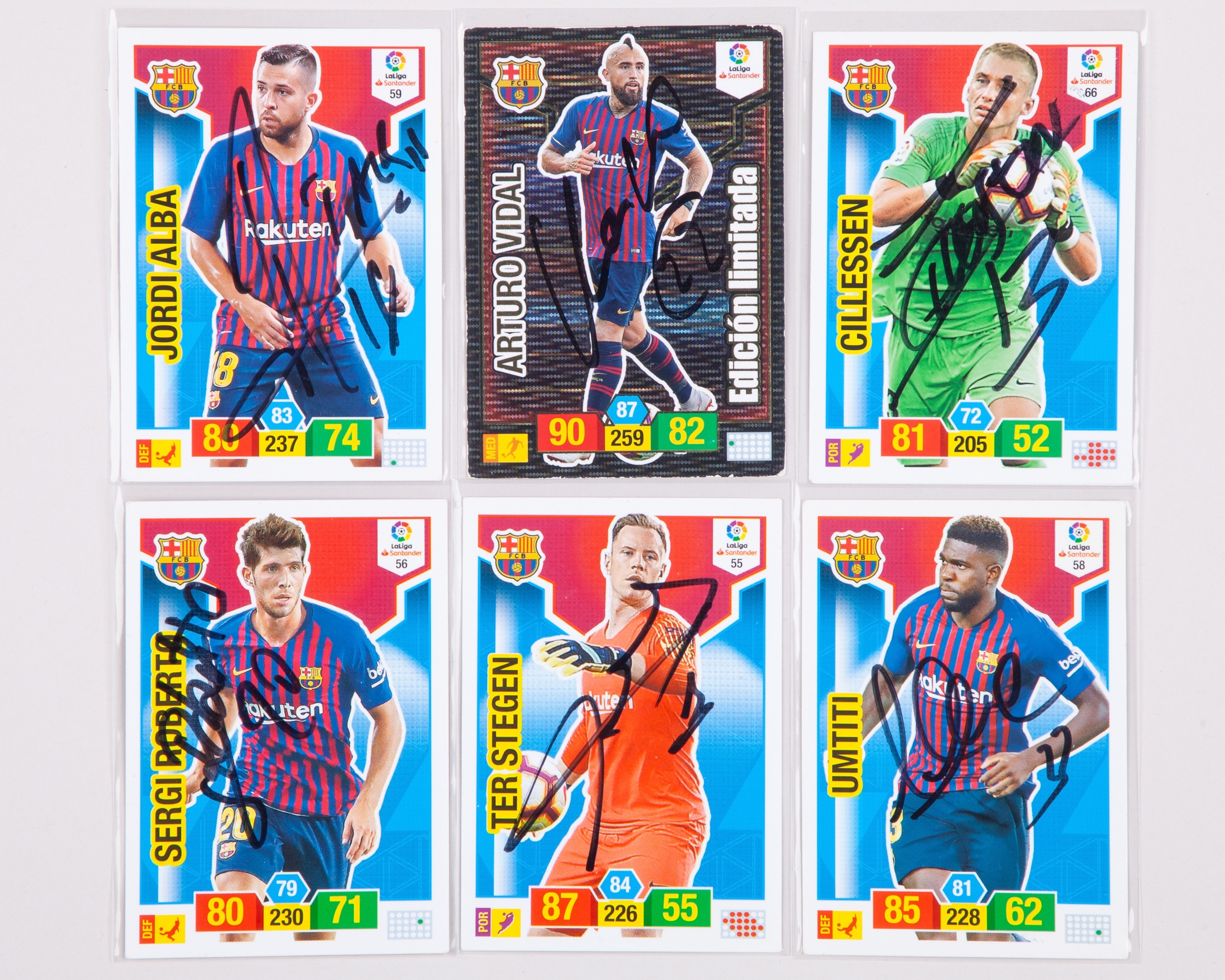 Six autographed Barcelona Panini La Liga player trading cards, 2018-19, including Jordi Alba, Marc-Andre Ter Stegen, Jasper Cillessen, Sergi Roberto, Samuel Umtiti and an Arturo Vidal Edicion Limitada (limited addition) card