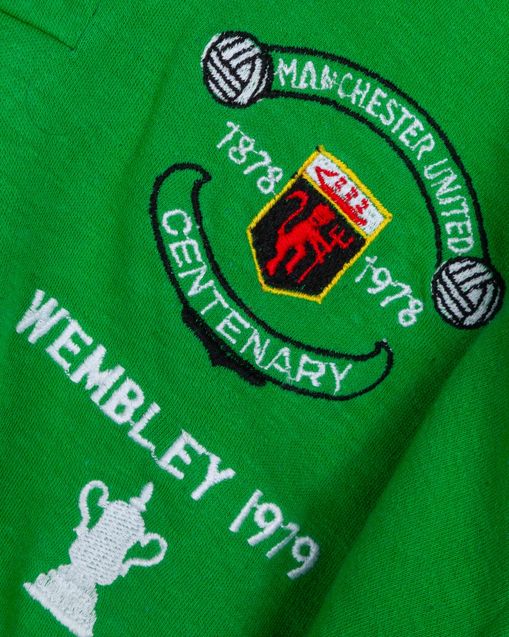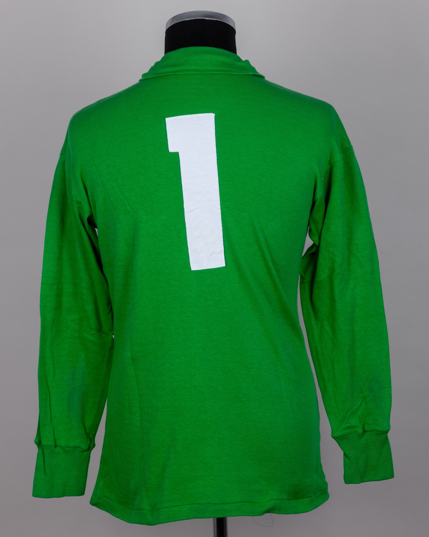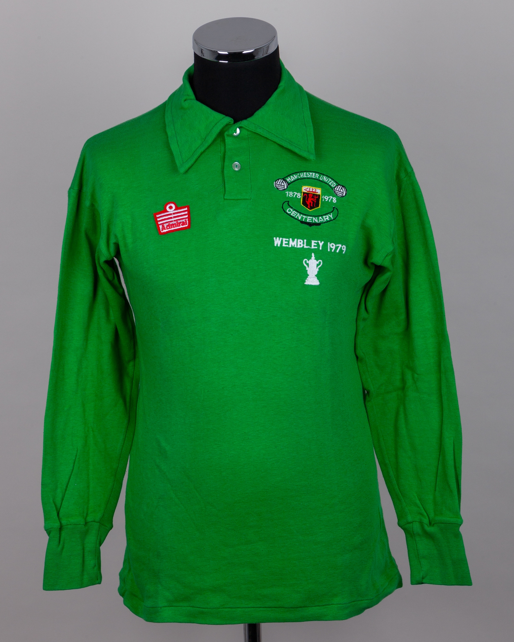 Gary Bailey green No. 1 Manchester United v. Arsenal F.A.Cup Final match worn shirt, 1979, Admiral, Large, with button-up collar and embroidered badge inscribed MANCHESTER UNITED CENTENARY 1878 1978 WEMBLEY 1979 with embroidered FA Cup, with Pat Jennings Collection autographed COA