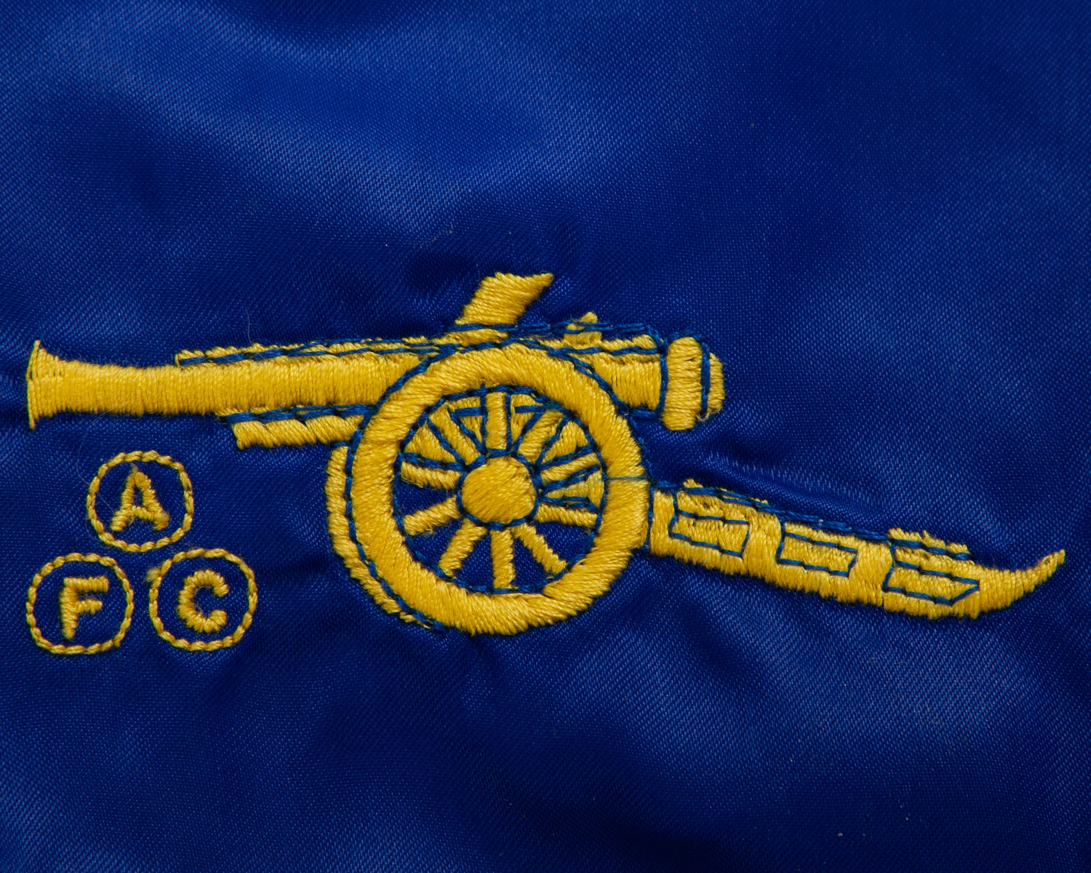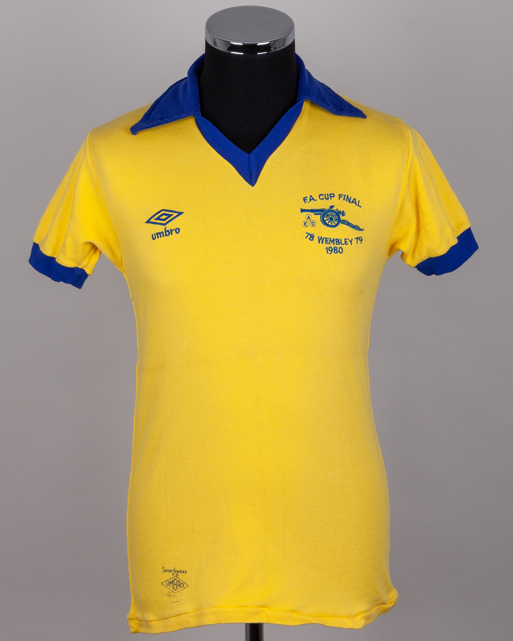 Liam Brady yellow and blue No.7 Arsenal v. West Ham United 1980 F.A.Cup Final match worn short-sleeved shirt, Umbro, Medium, with v-neck collar and embroidered badge inscribed F.A.CUP FINAL 78 WEMBLEY 79 1980 AFC with blue embroidered shorts, size 36, with Pat Jennings Collection autographed COA, (2)