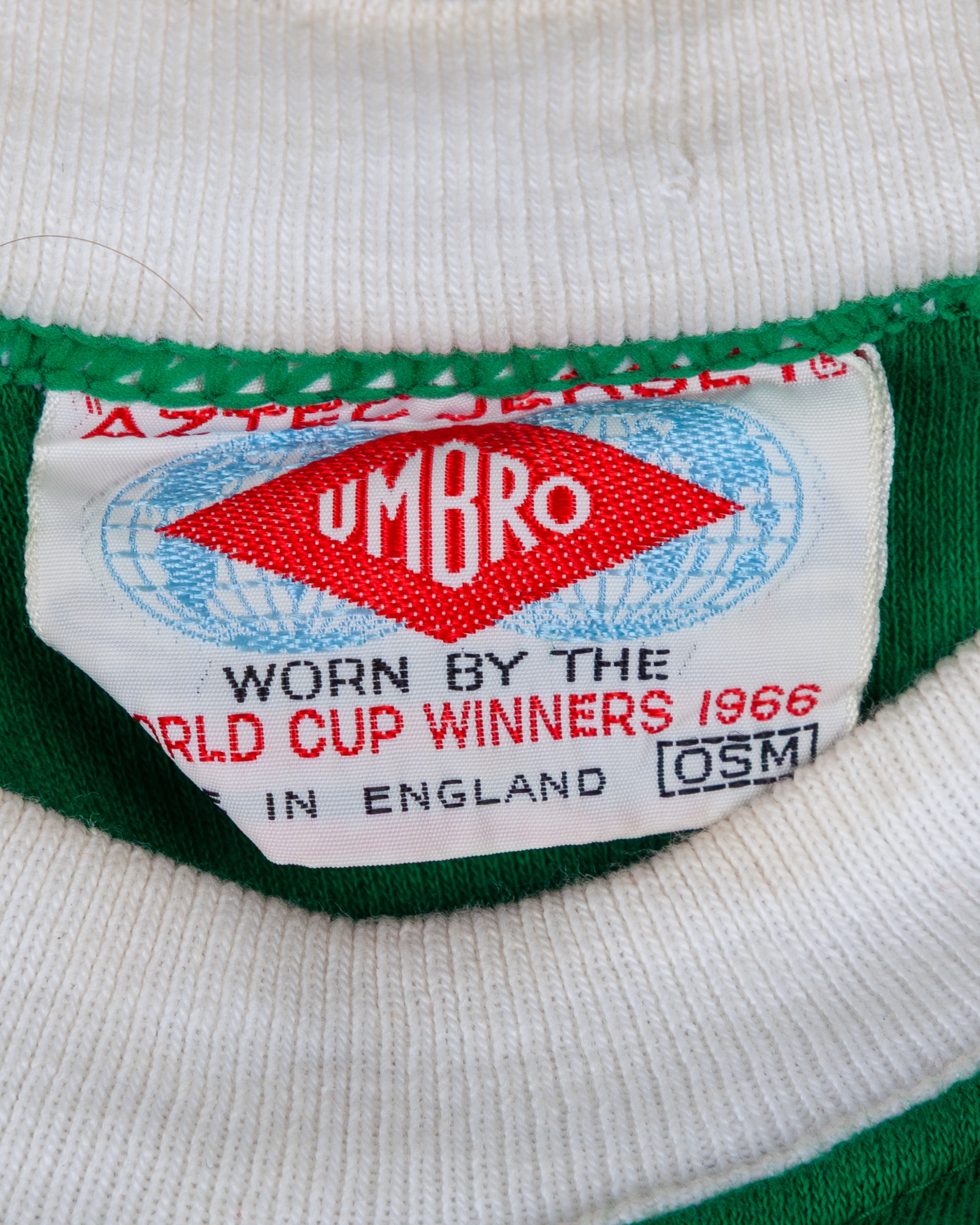 Green and white No.6 Northern Ireland match worn long-sleeved shirt, 1967-69, Umbro, OSM, with crew-neck collar and embroidered cloth badge inscribed IRISH FOOTBALL ASSOCIATION, areas of staining, with Pat Jennings Collection autographed COA
