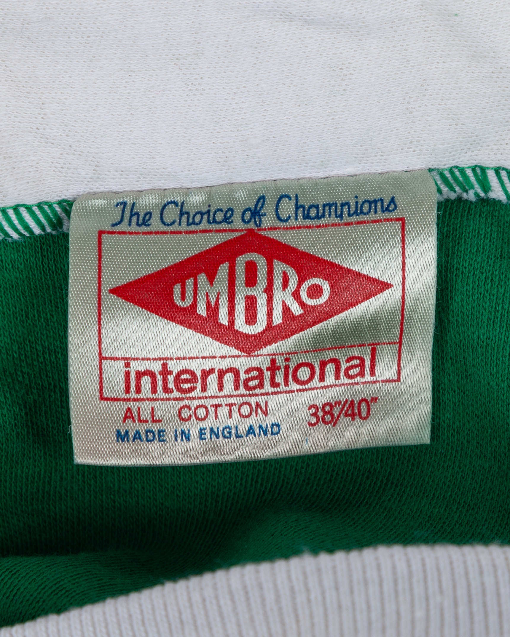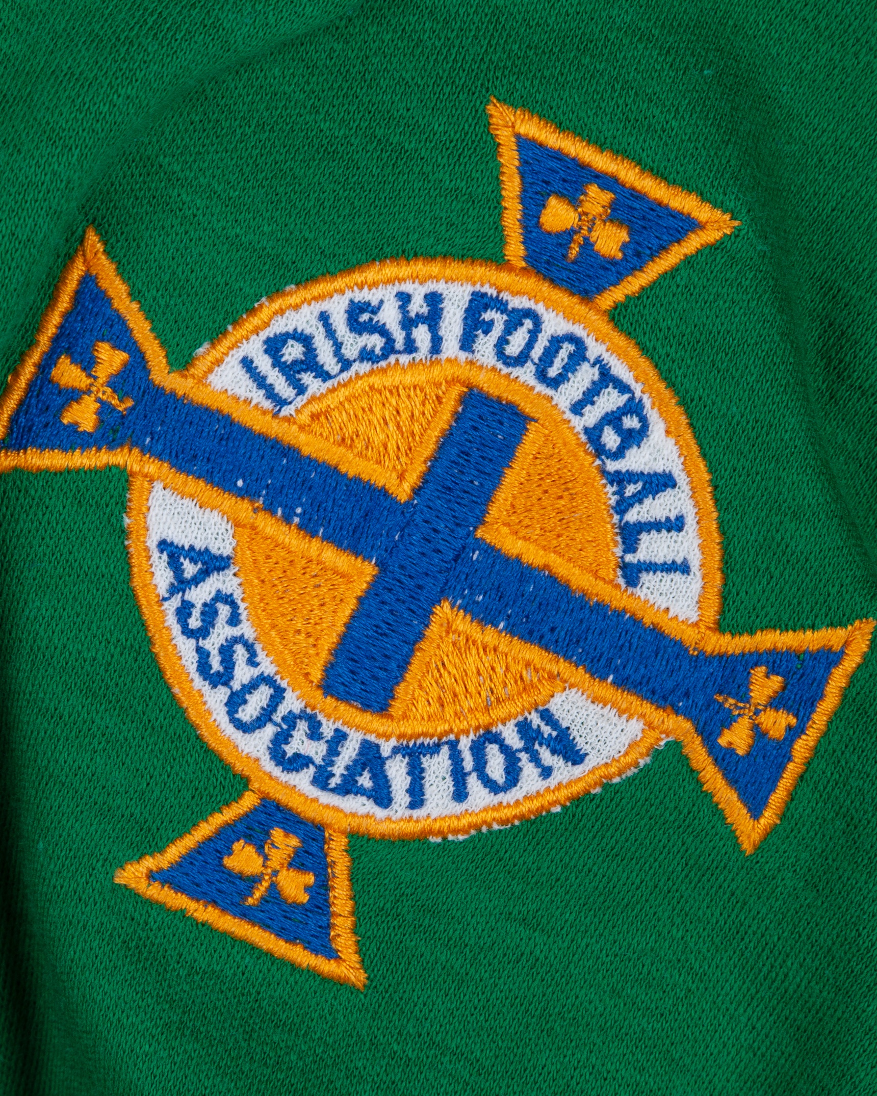 Green and white No.5 Northern Ireland match worn long-sleeved shirt, c.1974, Umbro, 38/40in., with v-neck collar and embroidered cloth badge inscribed IRISH FOOTBALL ASSOCIATION, areas of staining, with Pat Jennings Collection autographed COA