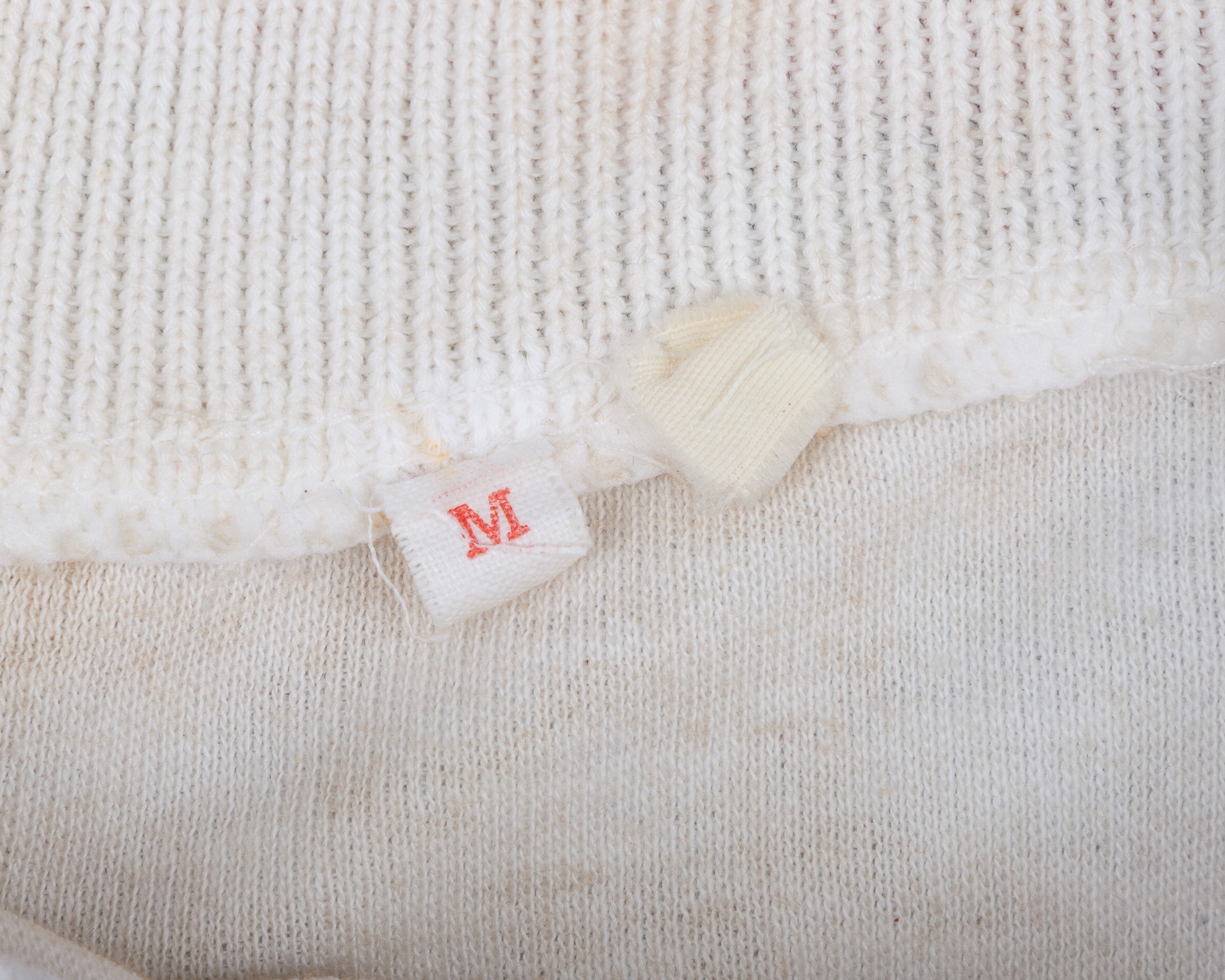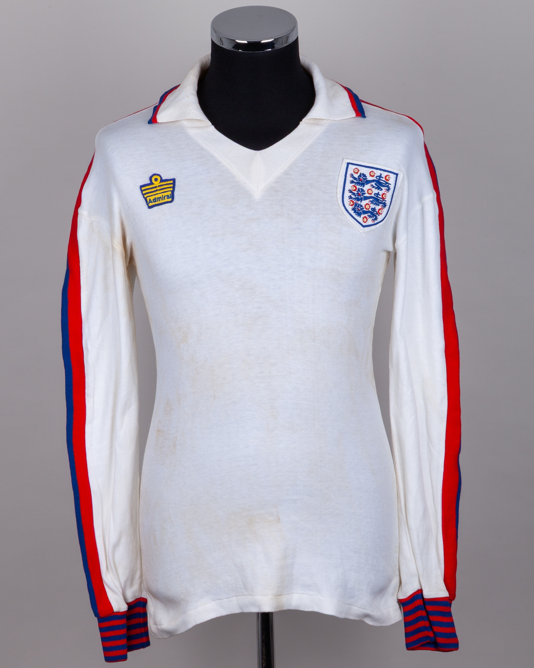 Ray Kennedy white No.6 England v. Northern Ireland long-sleeved shirt, Admiral, M, with v-neck collar and embroidered cloth badge, staining front and back, with Pat Jennings Collection autographed COA