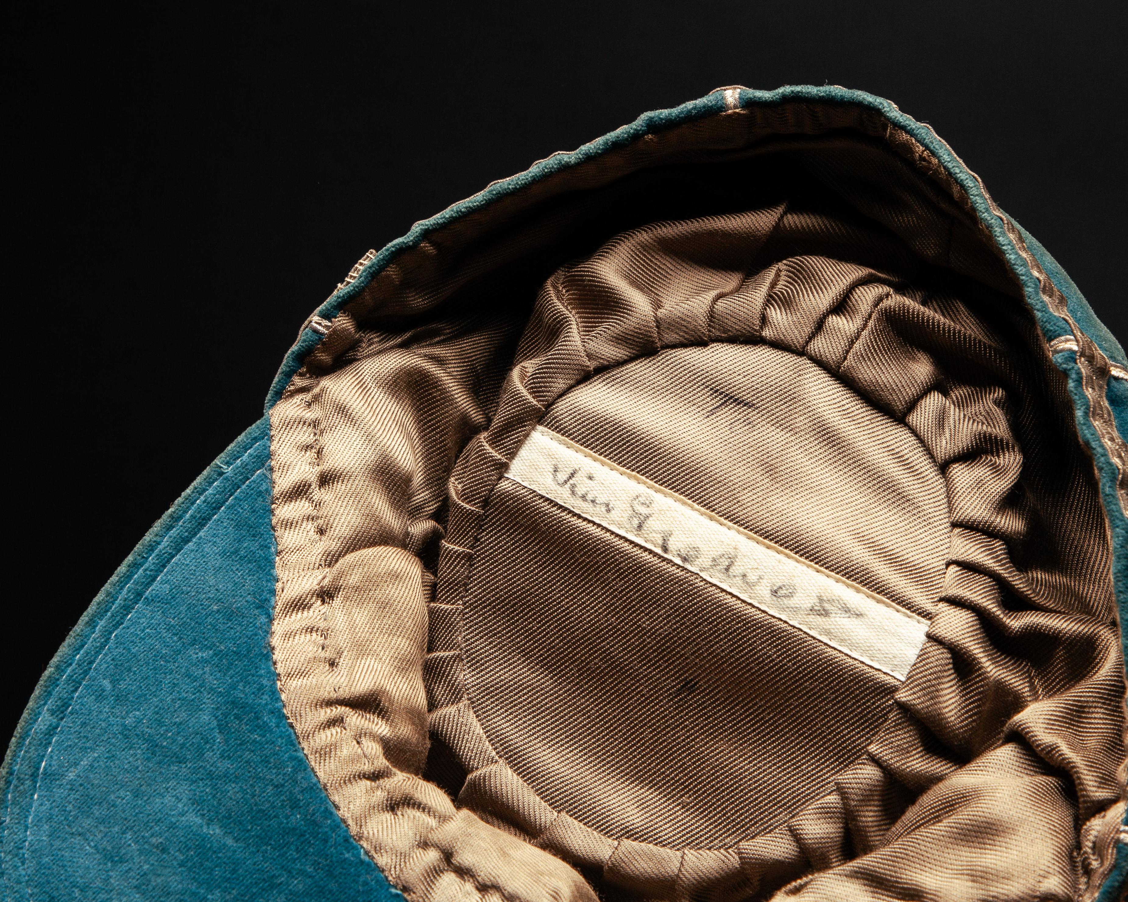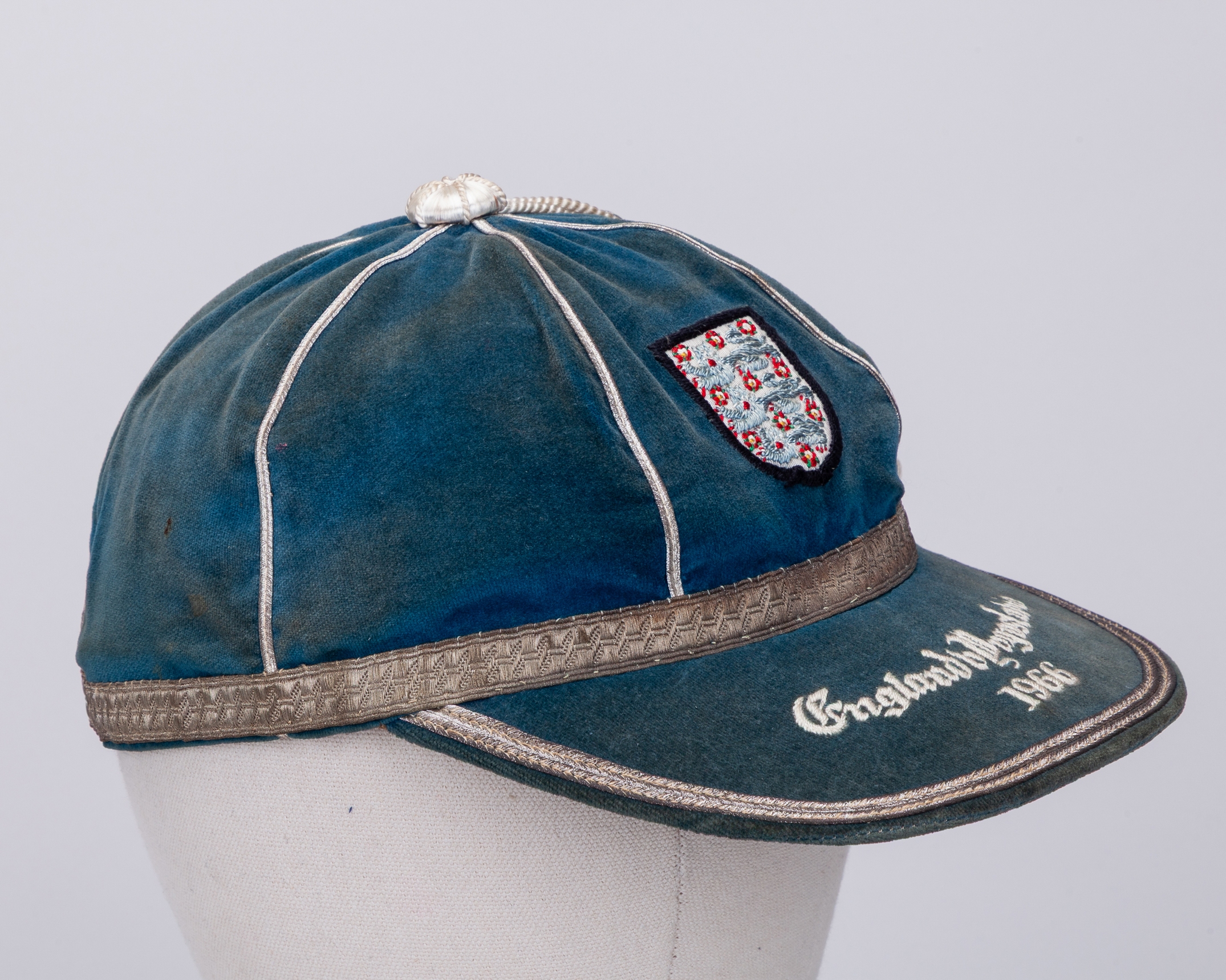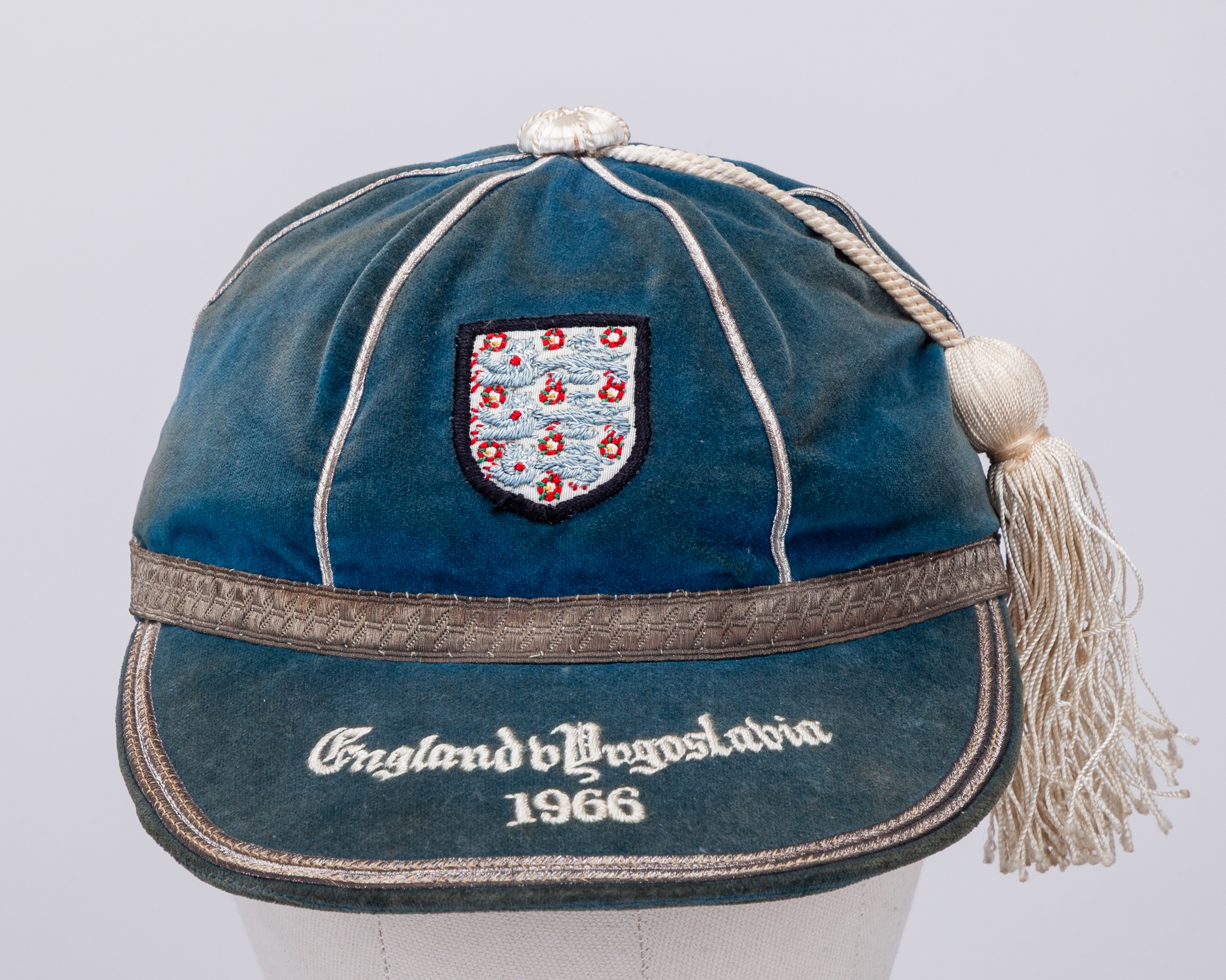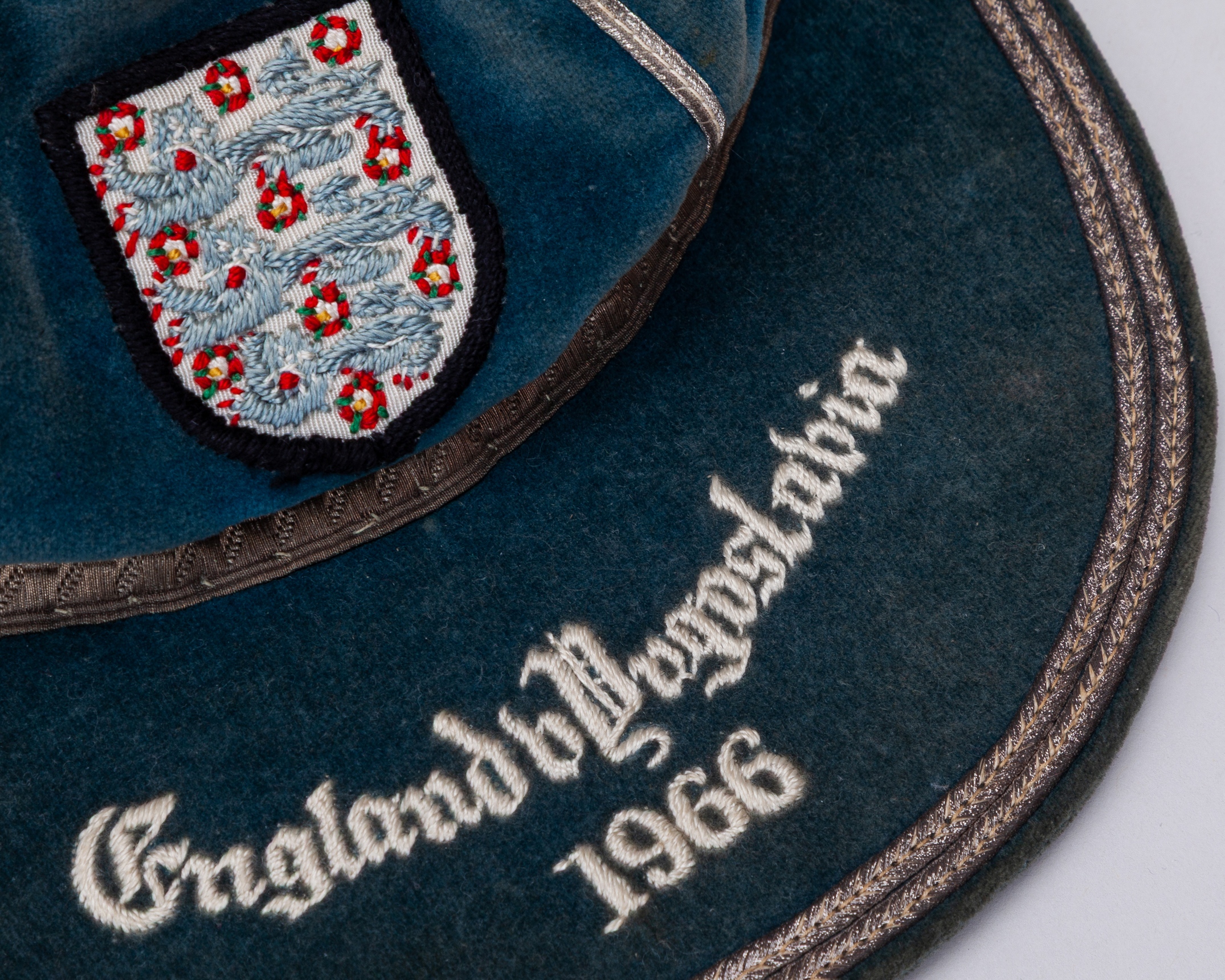 Jimmy Greaves blue England v. Yugoslavia International cap, 1966, with white tassel and braiding inscribed England v. Yugoslavia 1966, the interior inscribed in ink Jim Greaves, with Pat Jennings Collection autographed COA