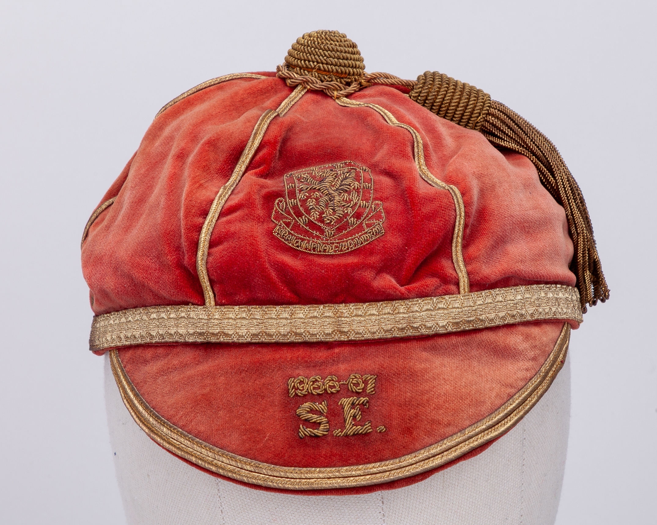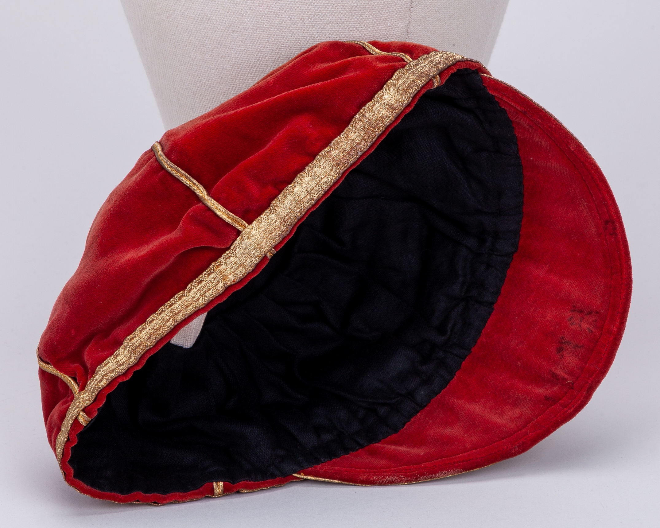 Cliff Jones red Wales v. Scotland and England International cap, 1966-67, red velvet with gilt tassel and braiding inscribed 1966-67 S.E., colour fading, with Pat Jennings Collection autographed COA