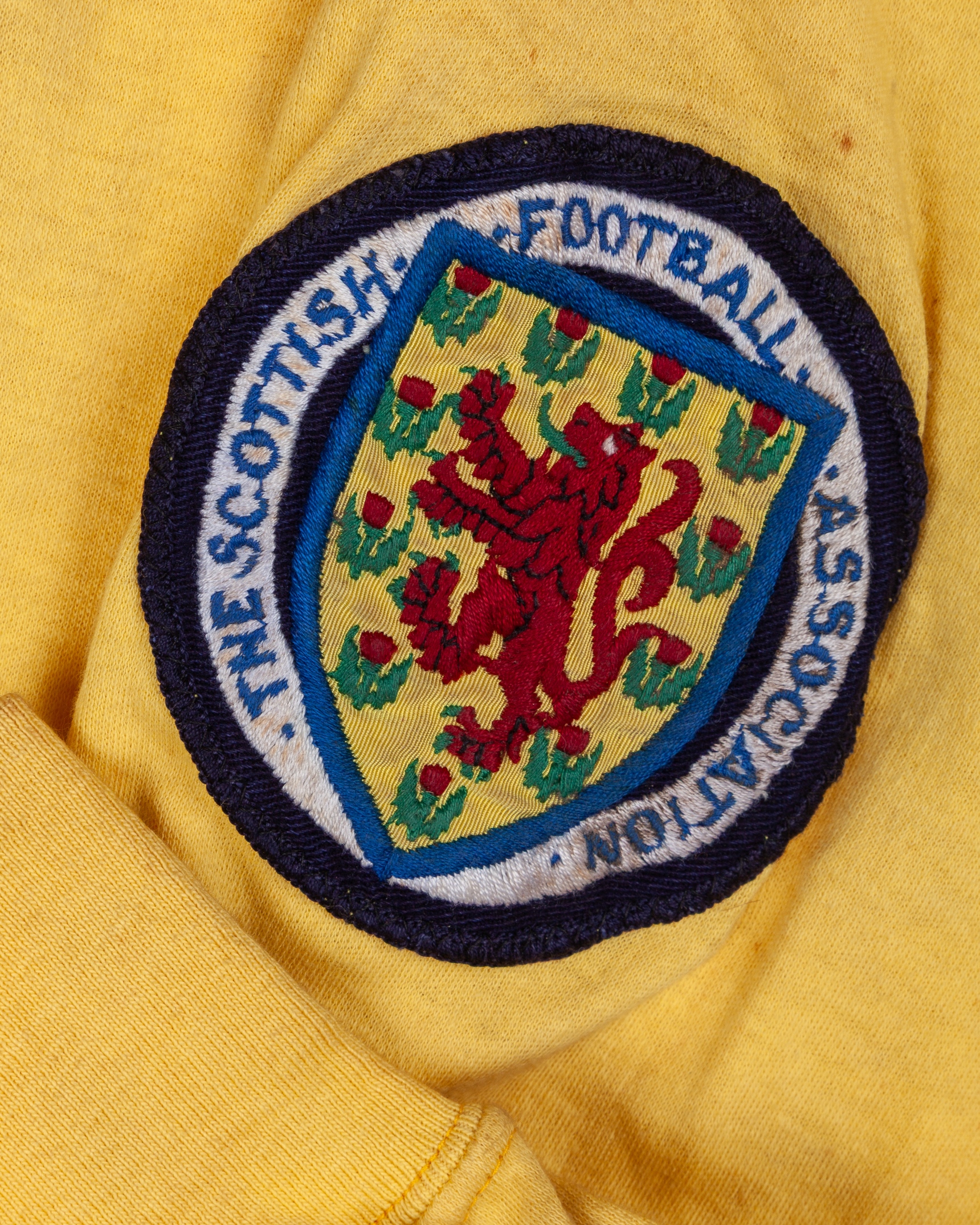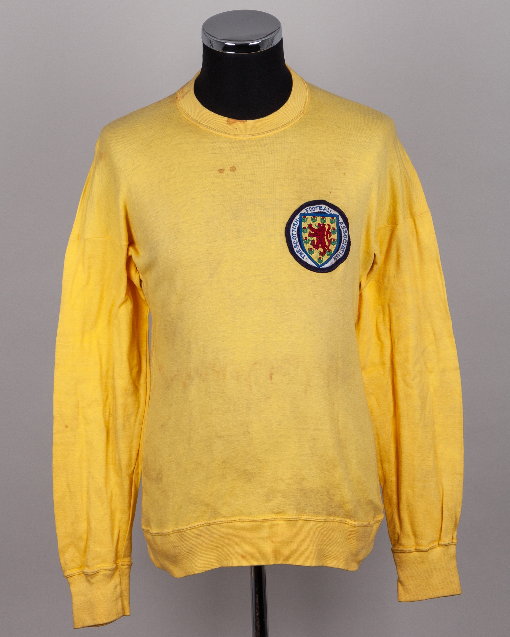 Yellow No.1 Scotland v. Northern Ireland match worn goalkeepers shirt, Umbro, OSM, with crew-neck collar and embroidered cloth badge inscribed THE SCOTTISH FOOTBALL ASSOCIATION, areas of blood staining around collar and further staining, with Pat Jennings Collection autographed COA