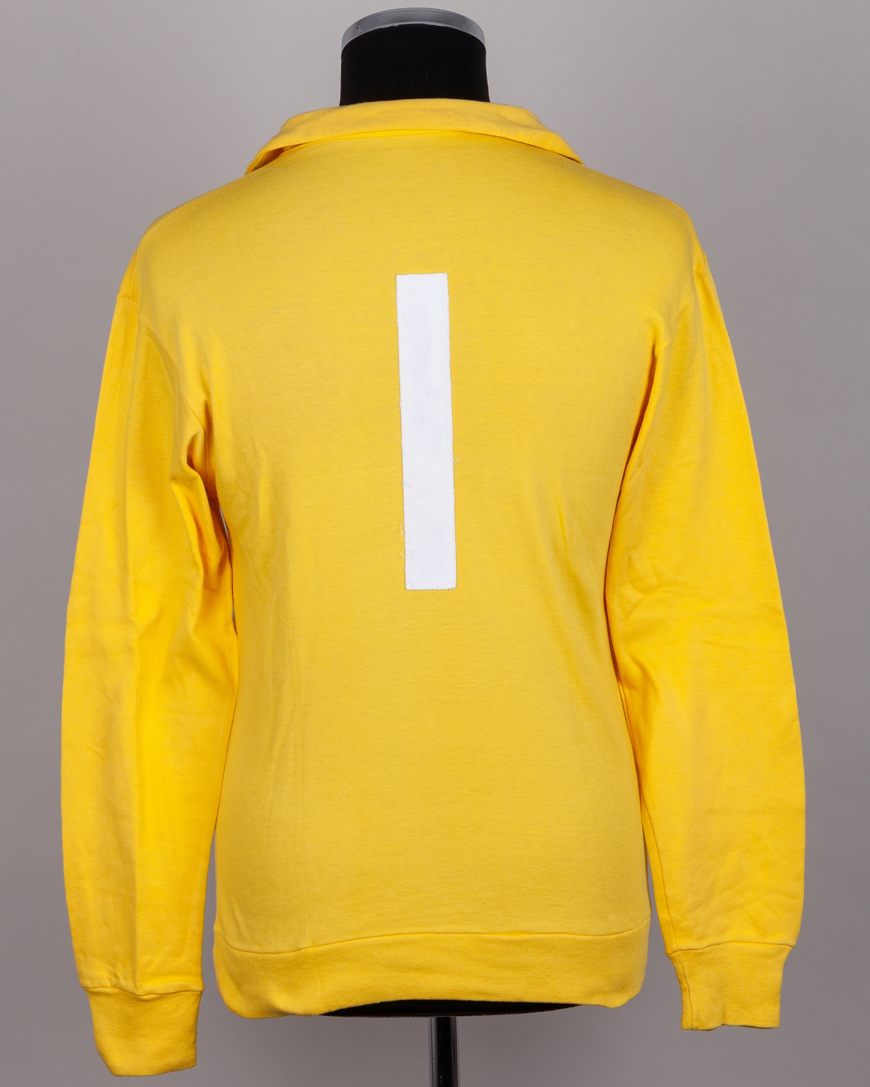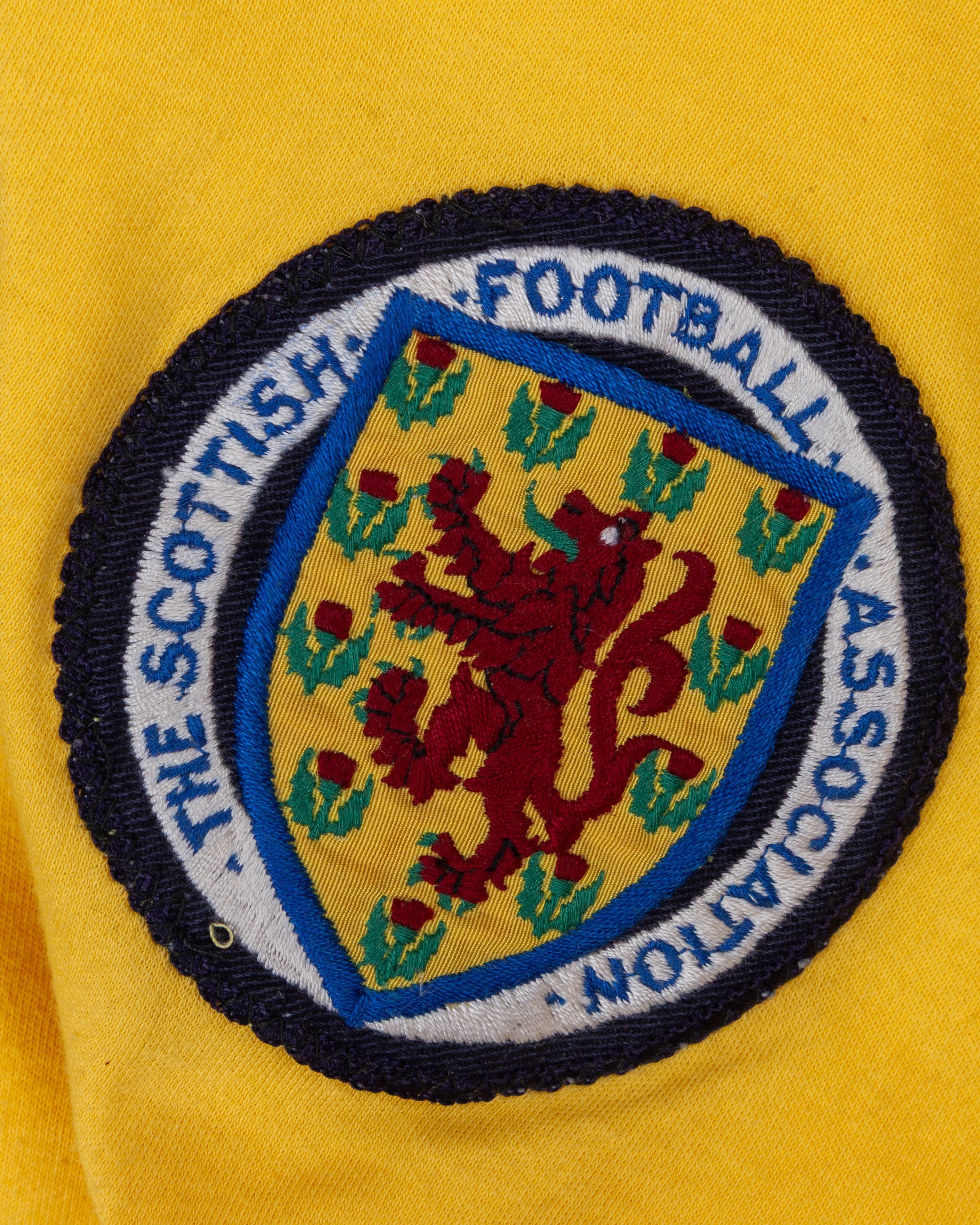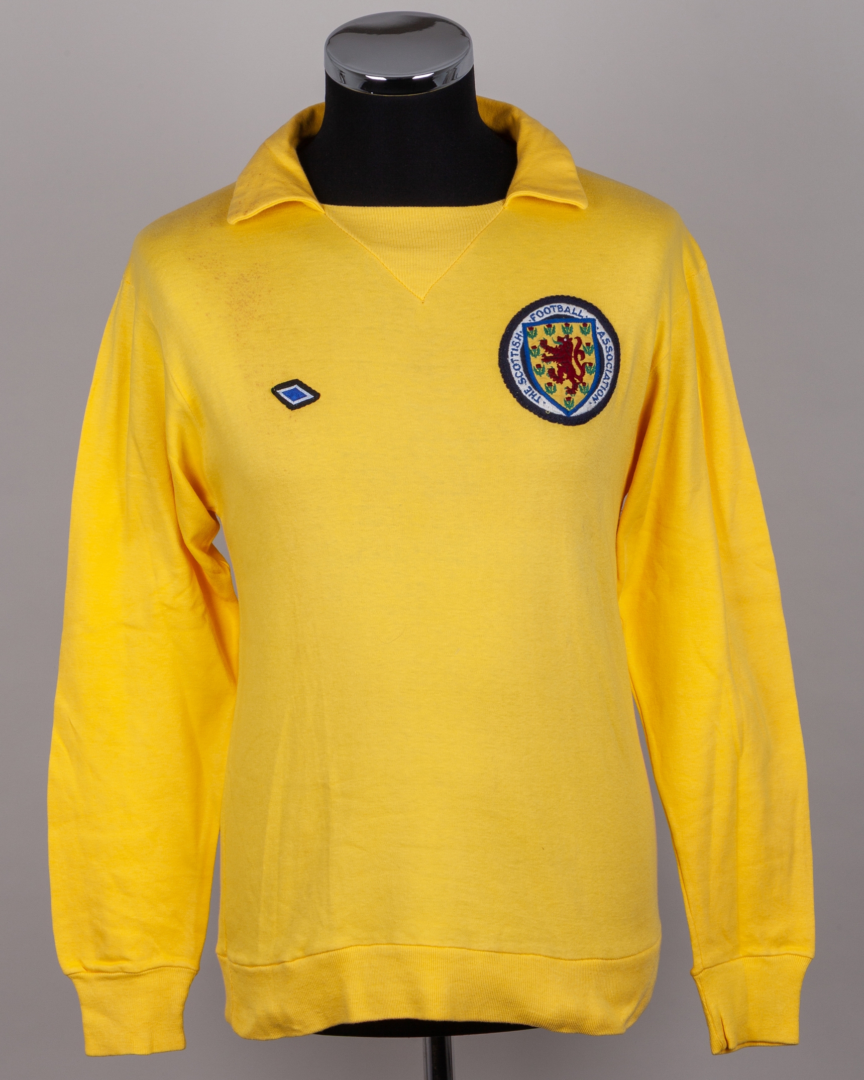 David Harvey yellow No.1 Scotland v. Northern Ireland match worn goalkeepers shirt, 1974, Umbro, OSM, with v-neck collar and embroidered badge inscribed THE SCOTTISH FOOTBALL ASSOCIATION, staining, with Pat Jennings Collection autographed COA