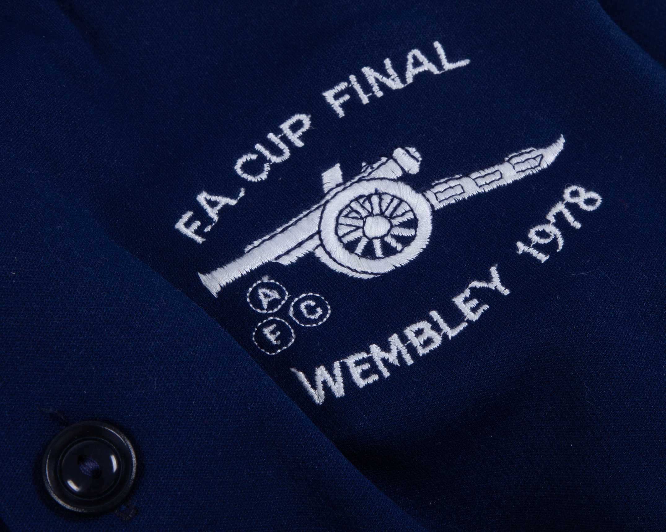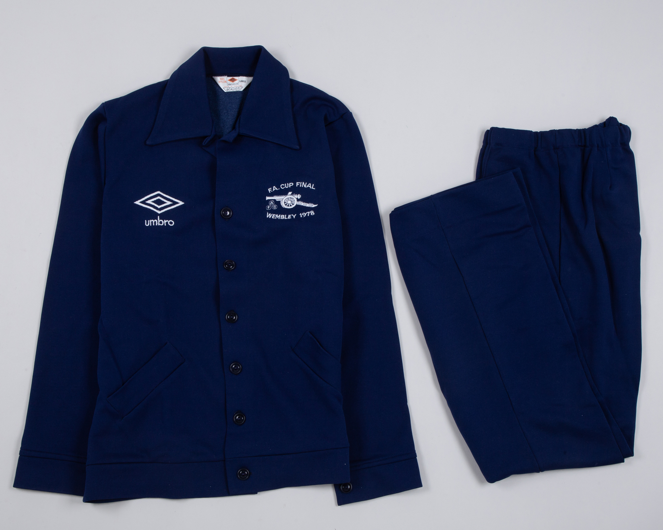 Pat Jennings a blue Arsenal 1978 F.A.Cup Final dress tracksuit top and bottoms, 1978, Umbro, Large, with button-up front and embroidered badge inscribed F.A. CUP FINAL AFC WEMBLEY 1978, with Pat Jennings Collection autographed COA