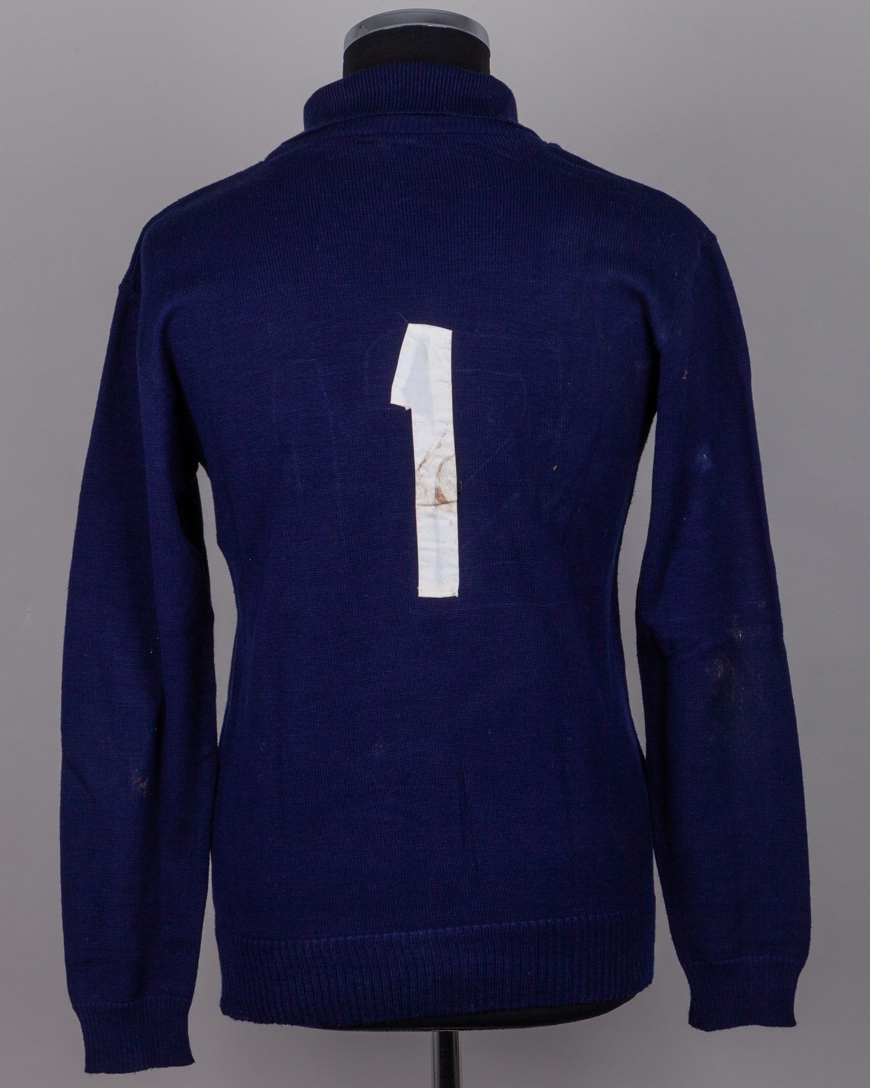 Vitor Damas blue No.1 Portugal match worn goalkeepers shirt, 1973, m with crew-neck collar and embroidered cloth badge, staining to number, with Pat Jennings Collection autographed COA