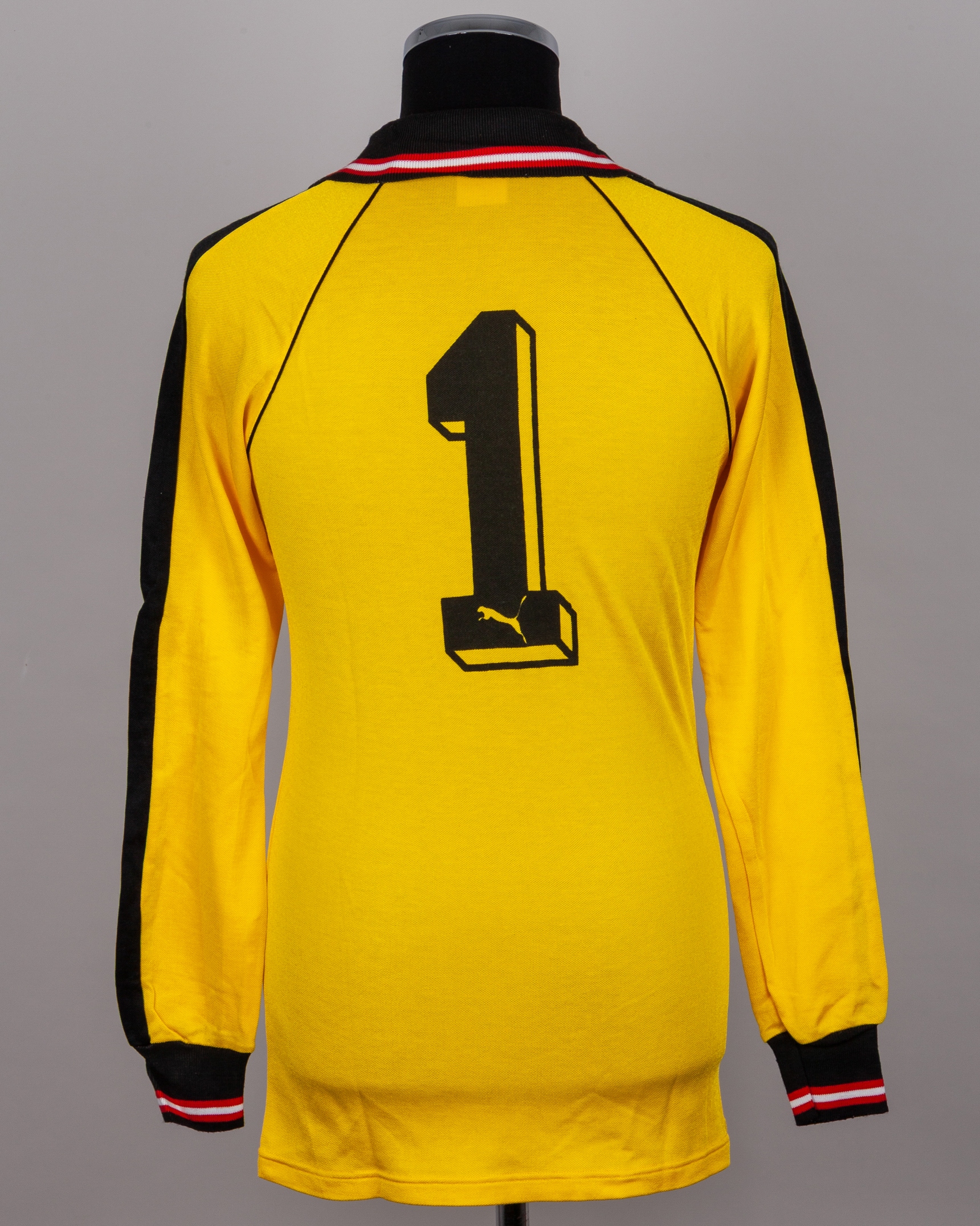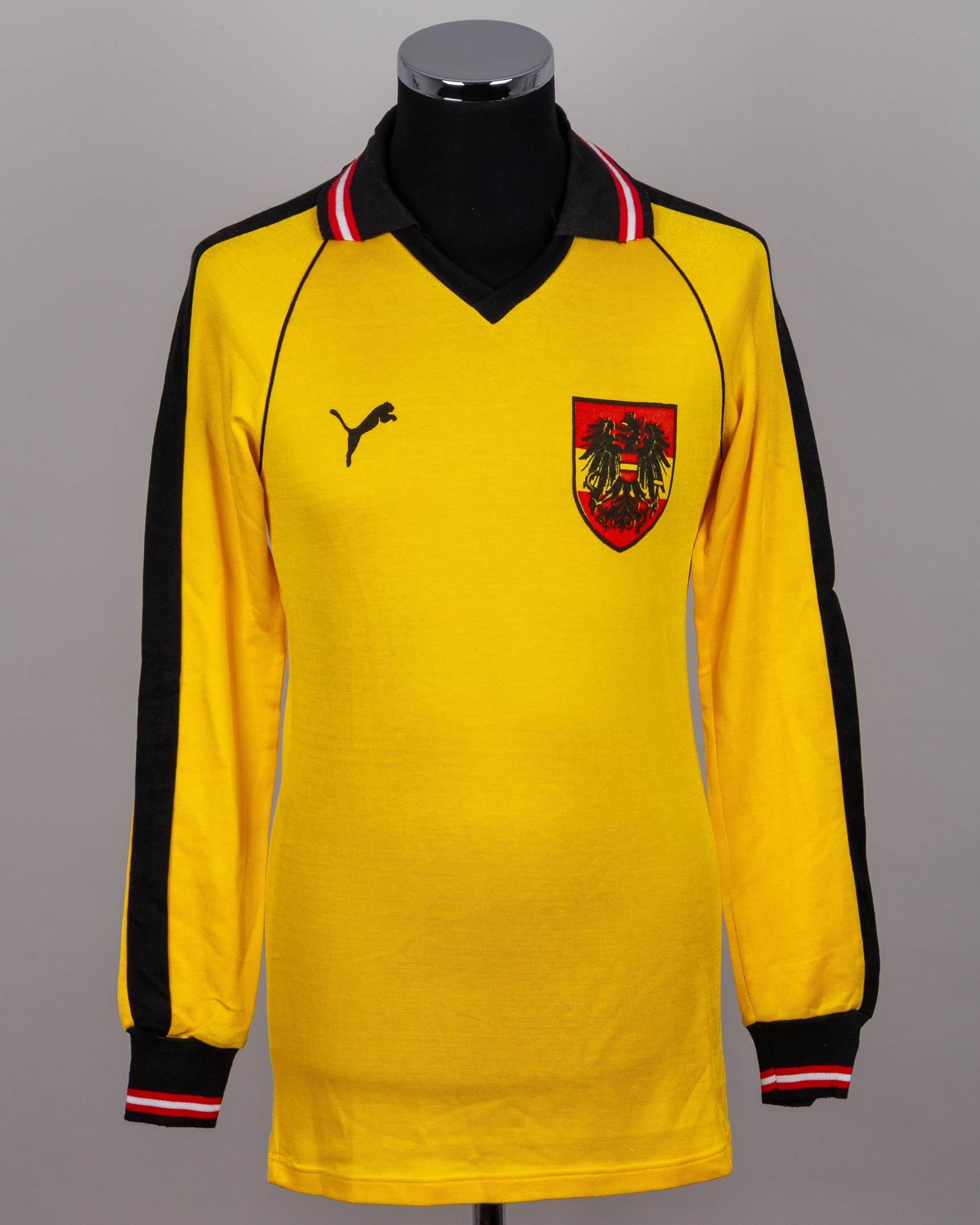 Friedl Koncilia yellow and black No.1 Austria v. Northern Ireland goalkeepers shirt, 1983, Puma, with v-neck collar and printed badge, with Pat Jennings Collection autographed COA