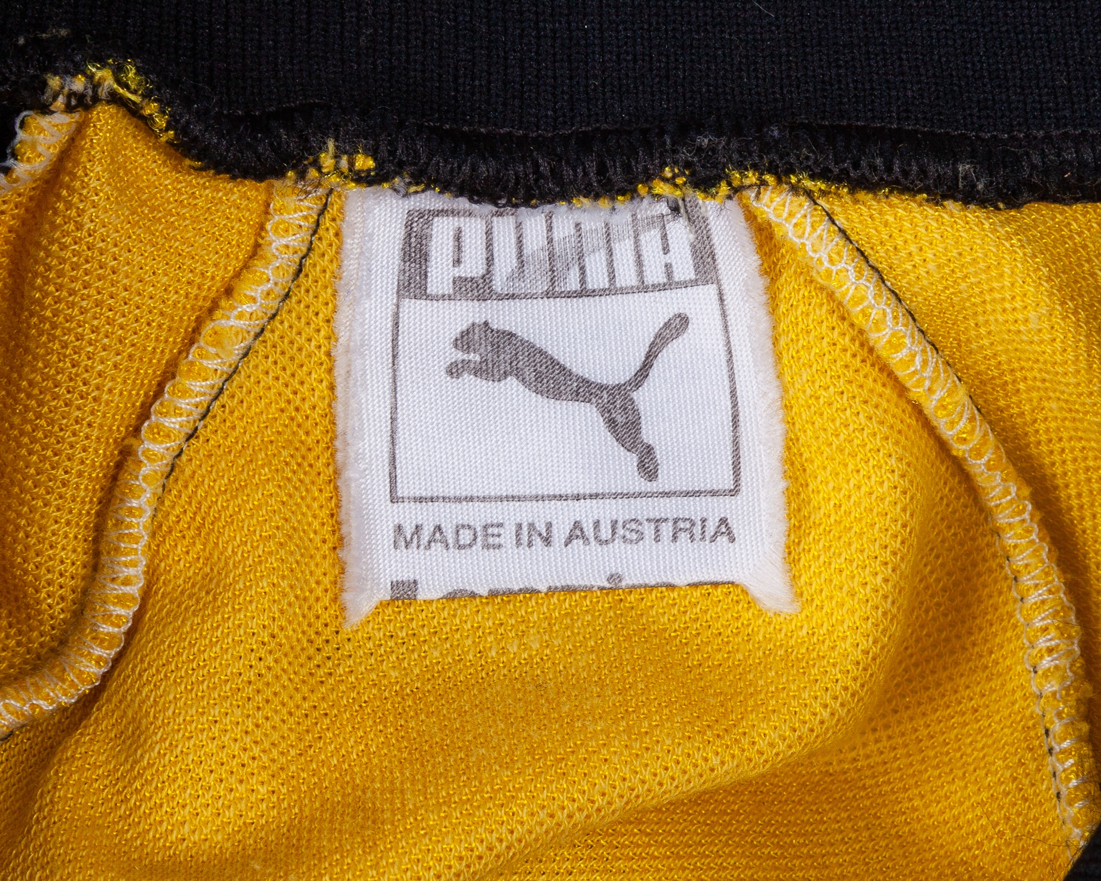 Herbert Feurer yellow and black No.21 Austria match issued goalkeepers shirt, 1982, Puma, with v-neck collar and printed badge, with Pat Jennings Collection autographed COA