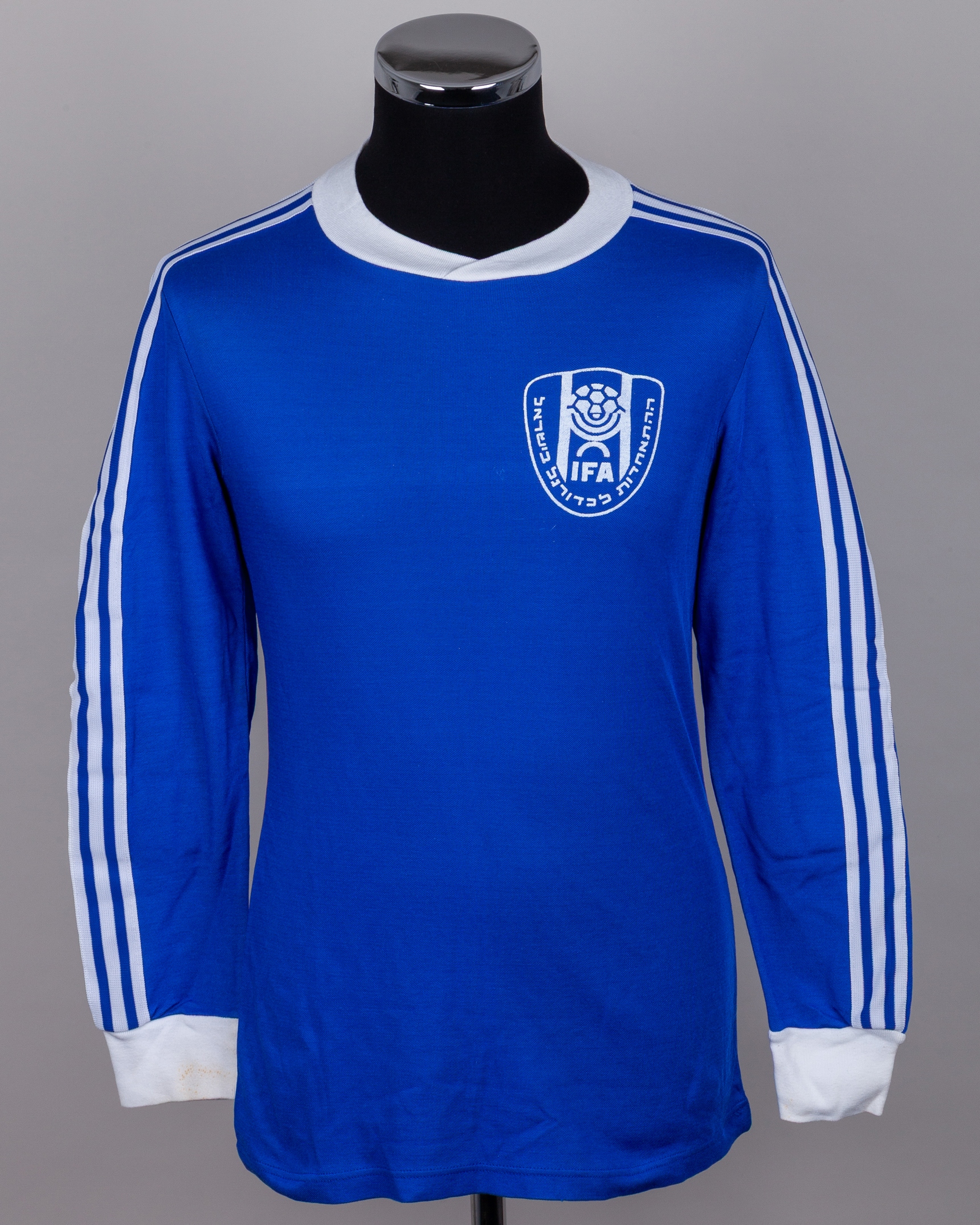 Arie Haviv blue No.1 Israel v. Northern Ireland goalkeepers shirt, 1980, Adidas, L with v-neck style collar and printed badge, with Pat Jennings Collection autographed COA