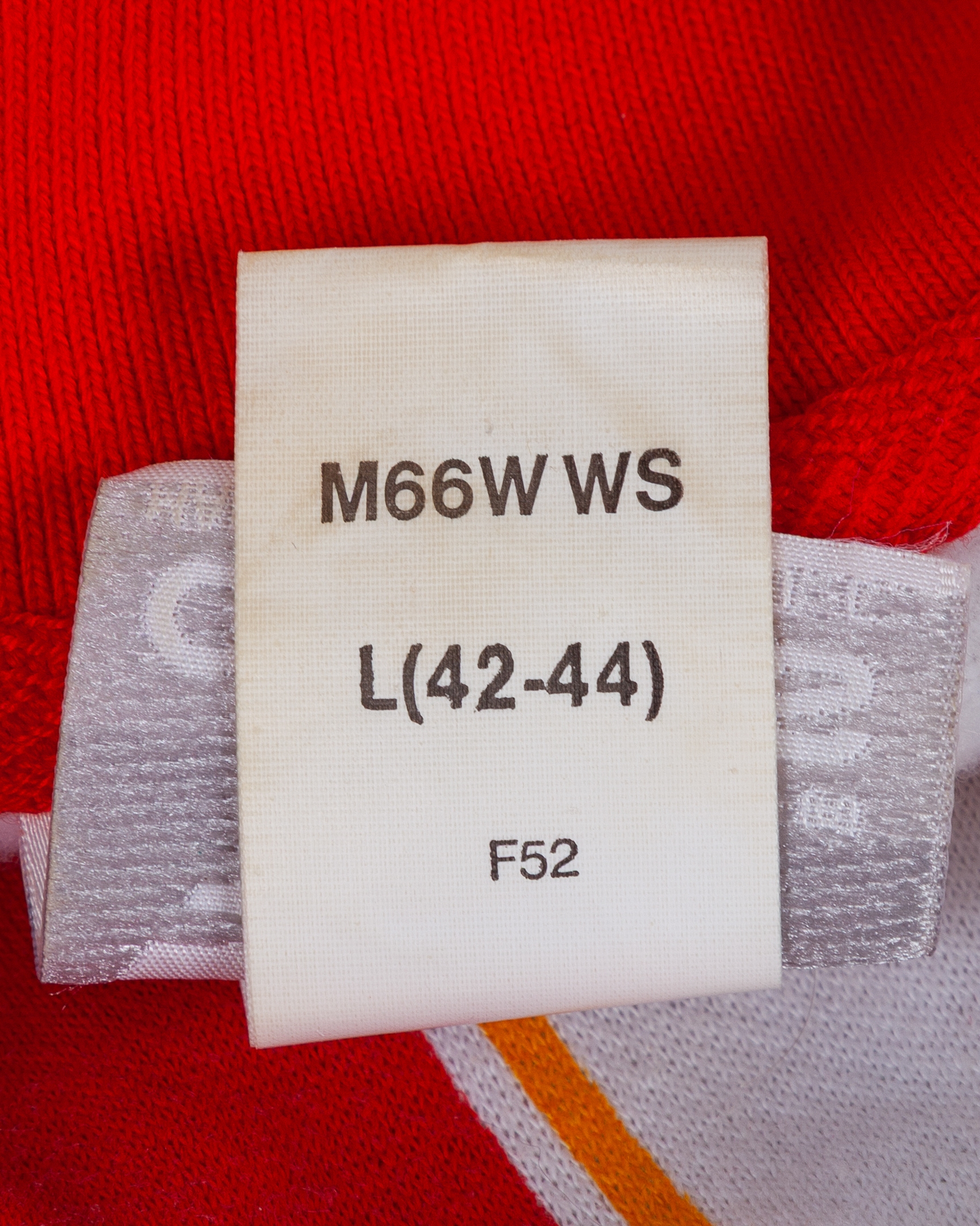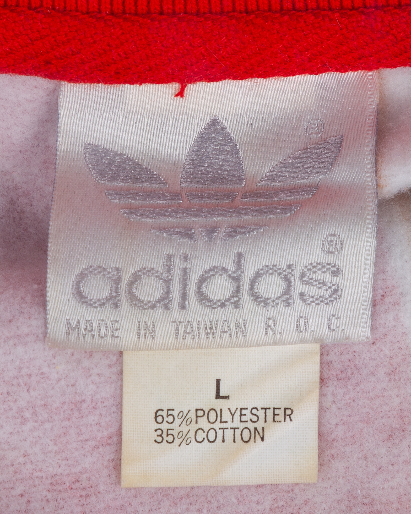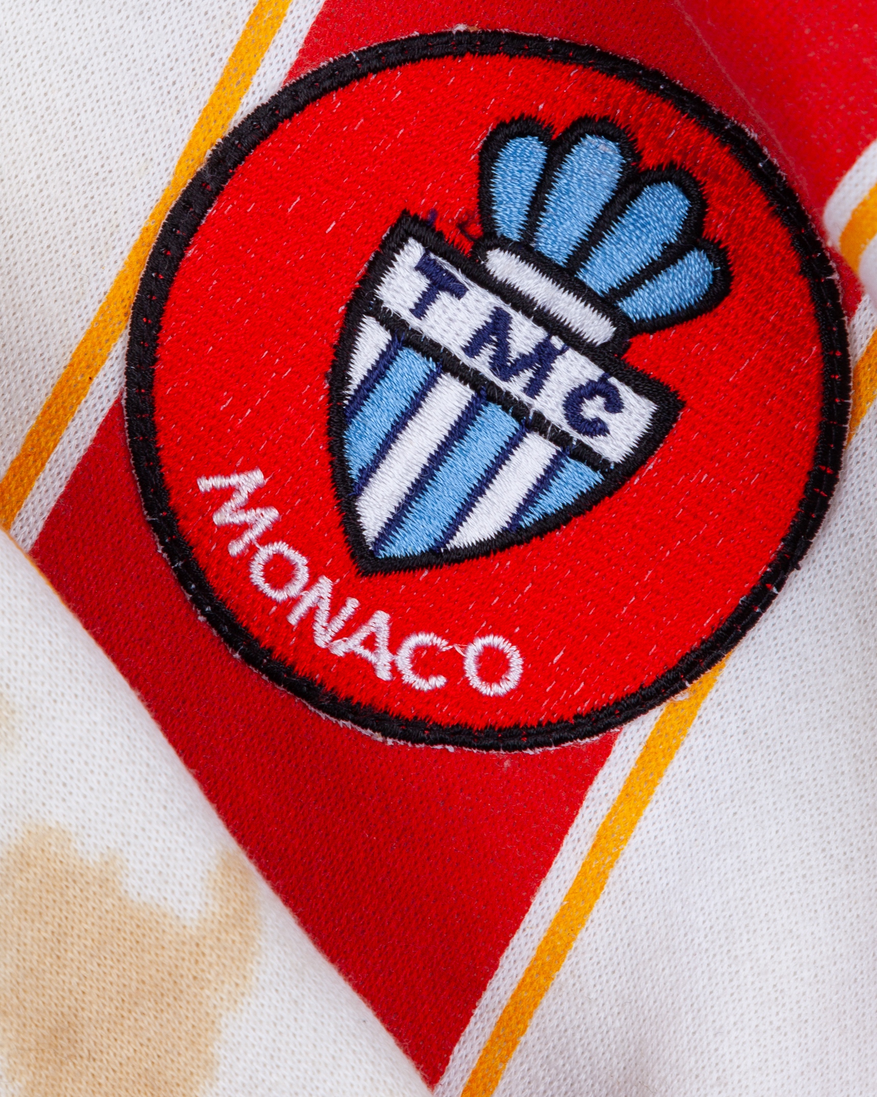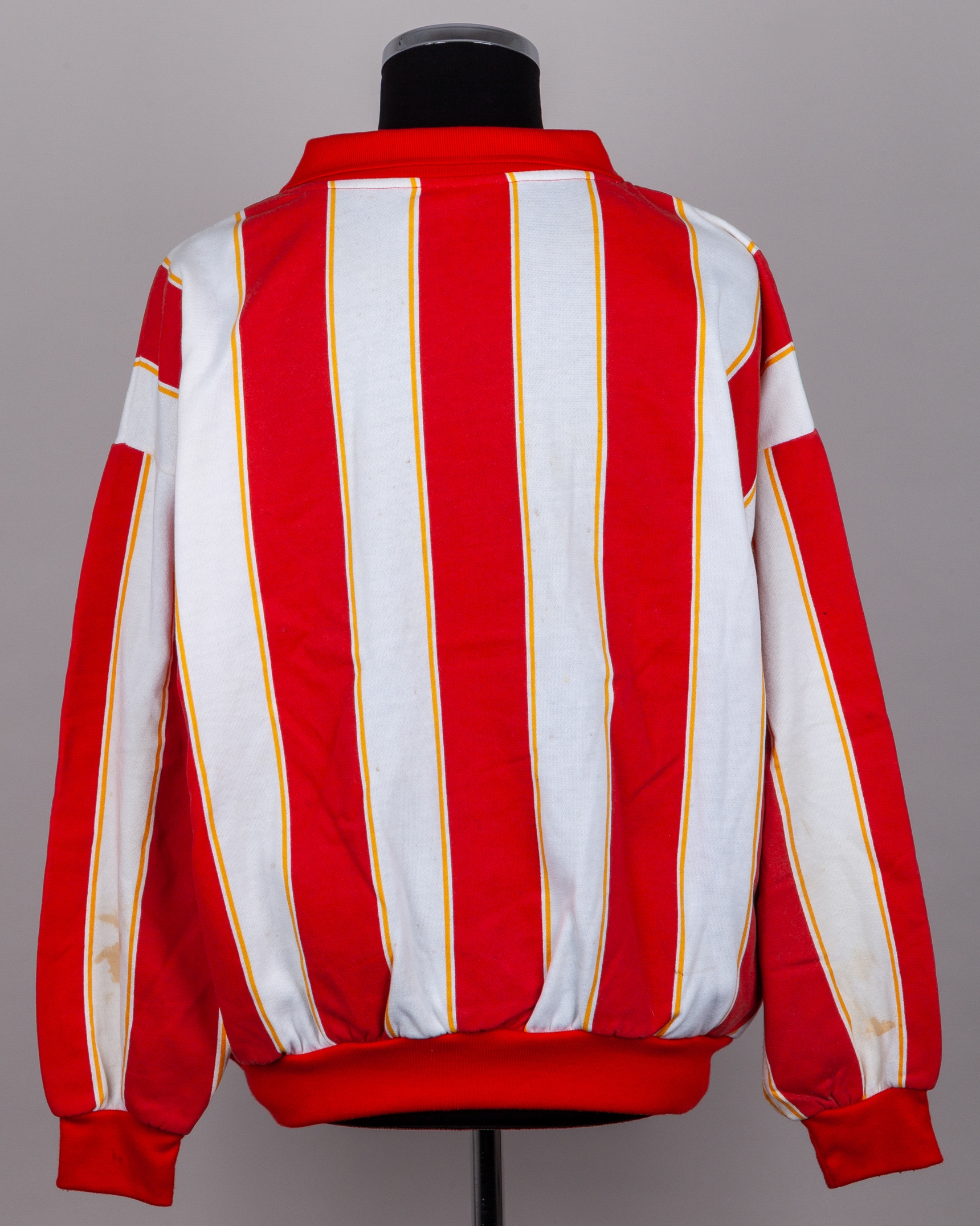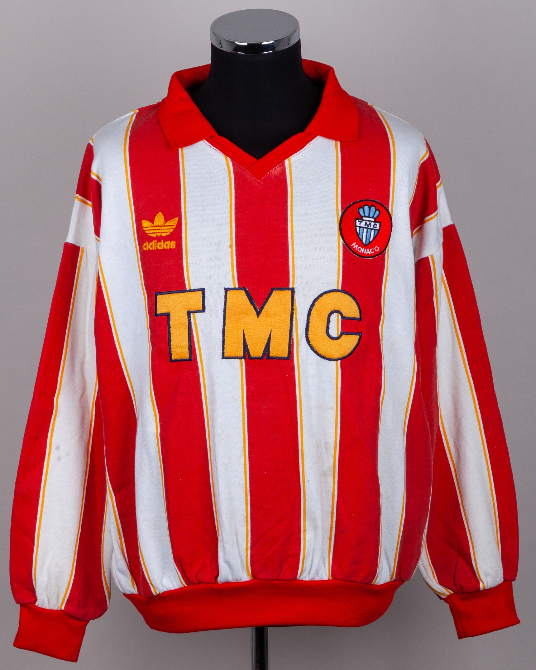 Red and white TMC Monaco sweat shirt, Adidas, L, with v-neck collar and embroidered cloth badge, with Pat Jennings Collection autographed COA