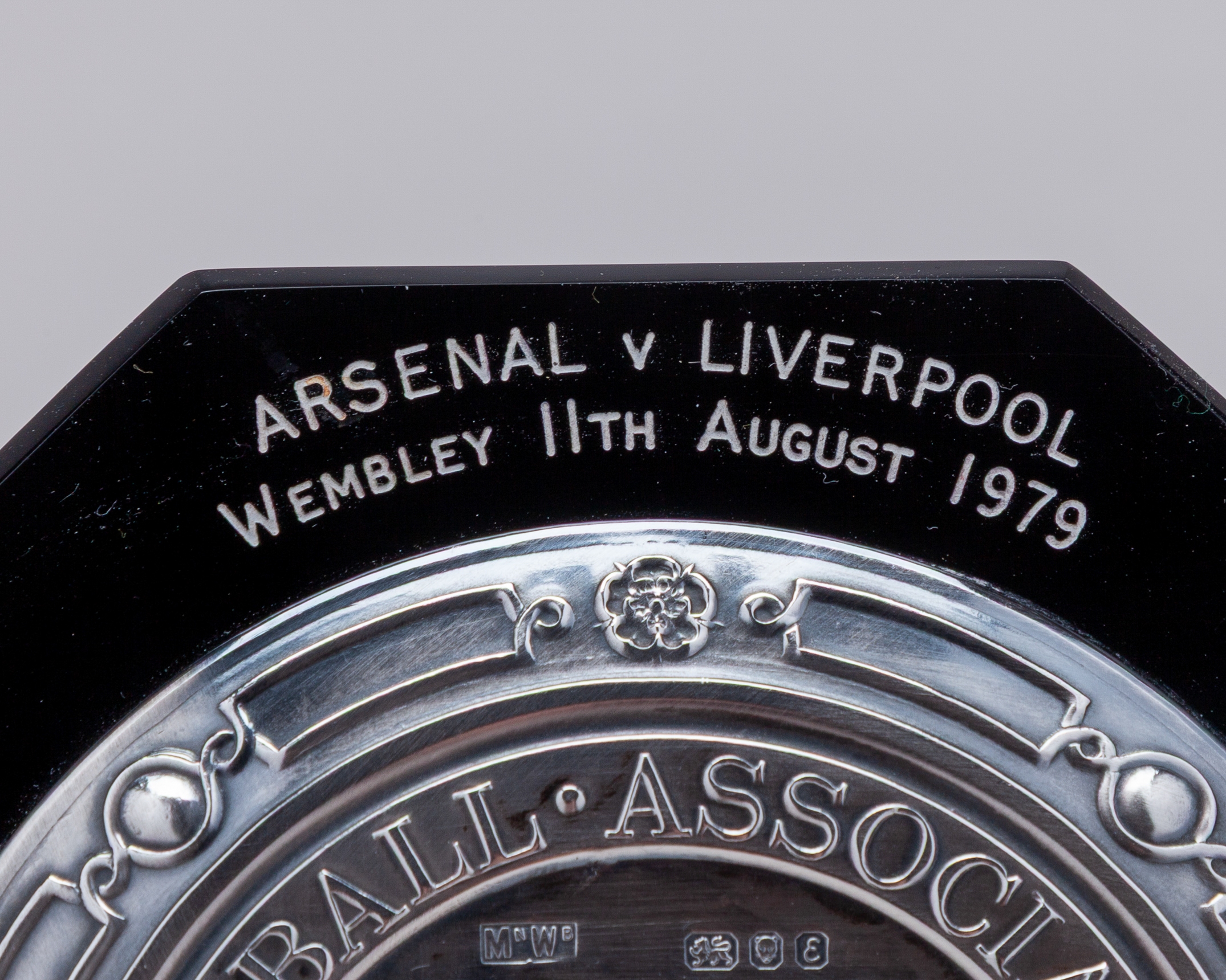 Pat Jennings a silver-mounted and bakelite Arsenal v. Liverpool Charity Shield plaque, 1979, inscribed FOOTBALL ASSOCIATION CHARITY SHIELD, ARSENAL V LIVERPOOL WEMBLEY 11TH AUGUST 1979, on easel stand, with Pat Jennings Collection autographed COA