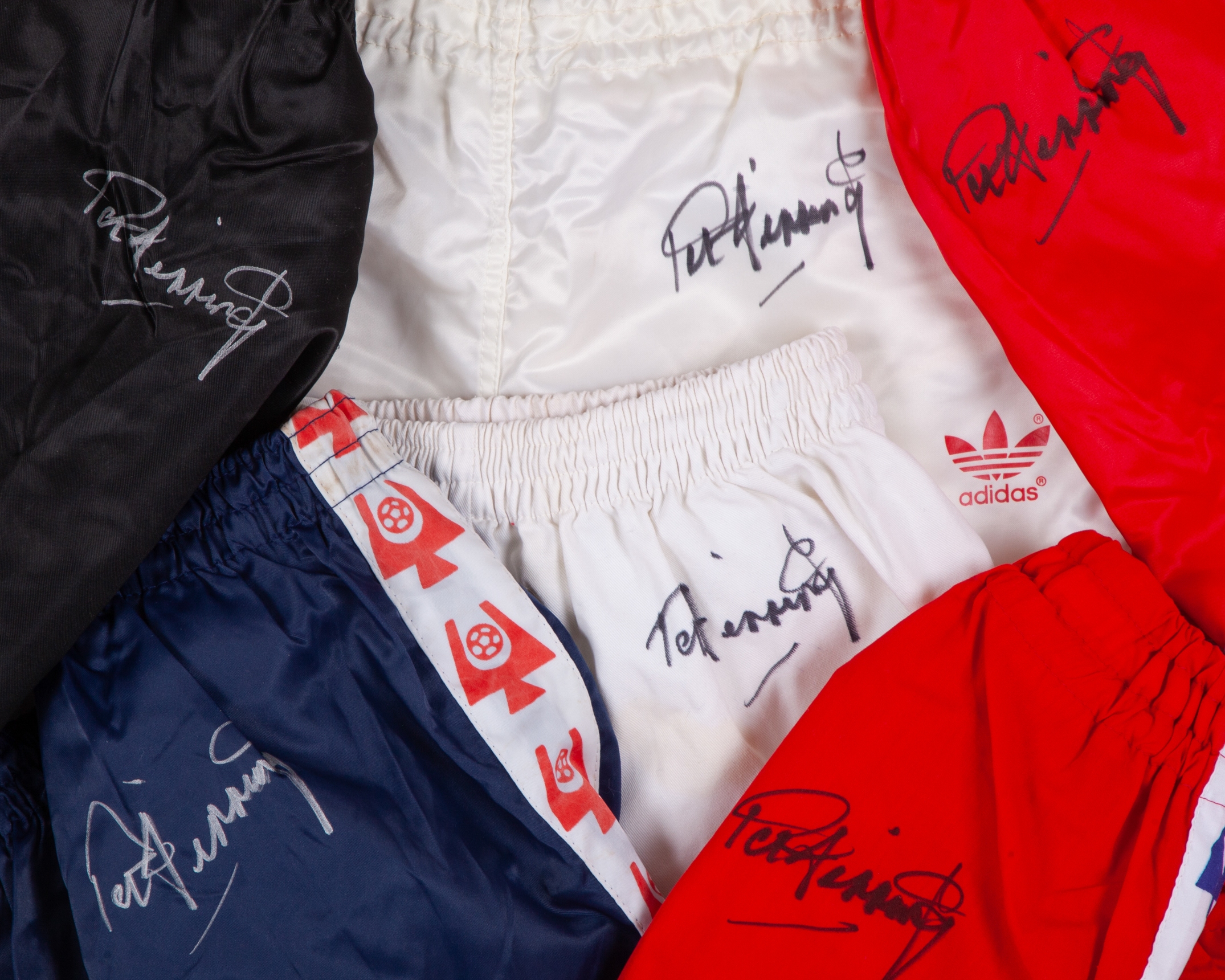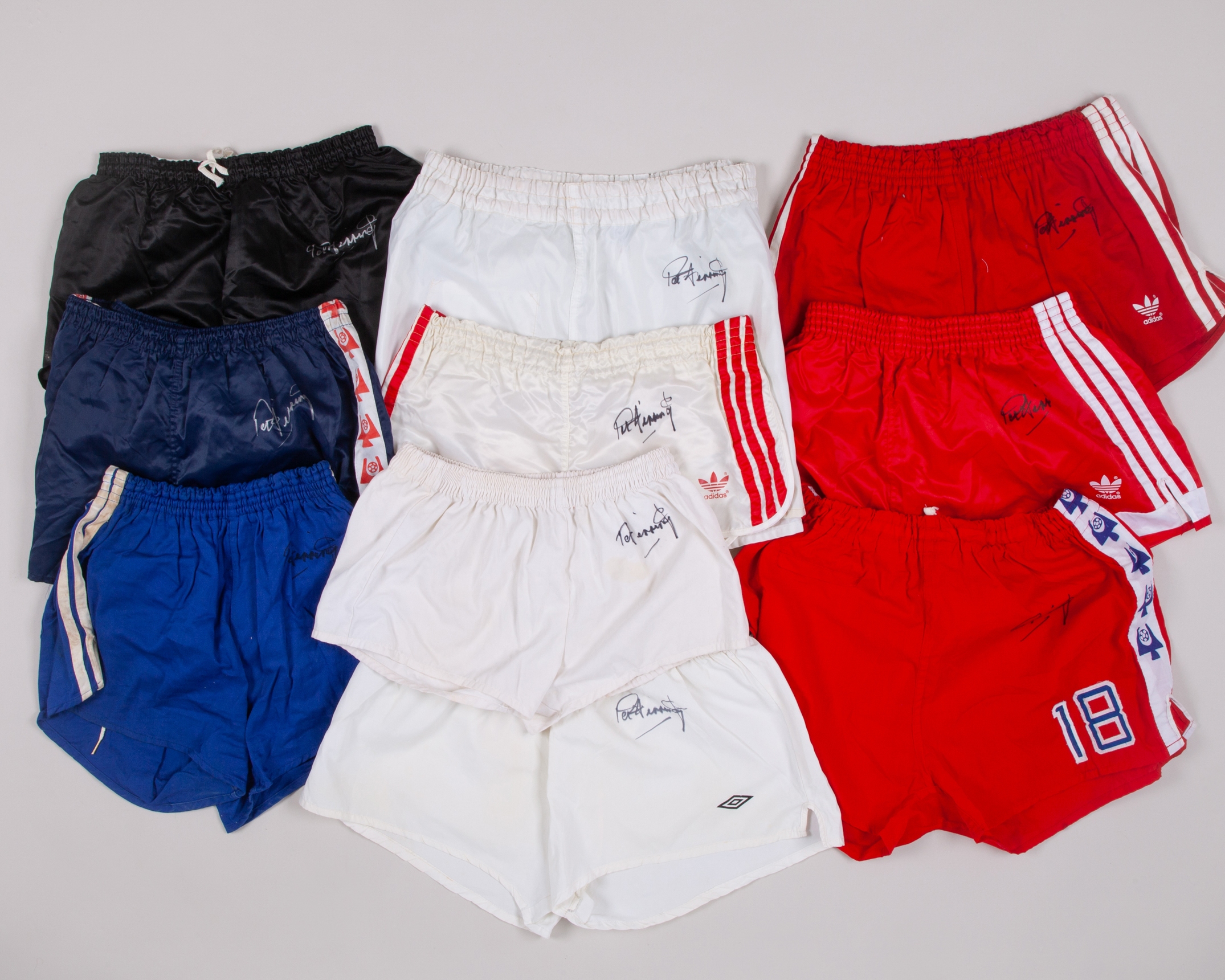 Pat Jennings ten various autographed pairs of shorts, comprising three red, three white, two blue and pair of black, with Pat Jennings Collection autographed COA, (10)