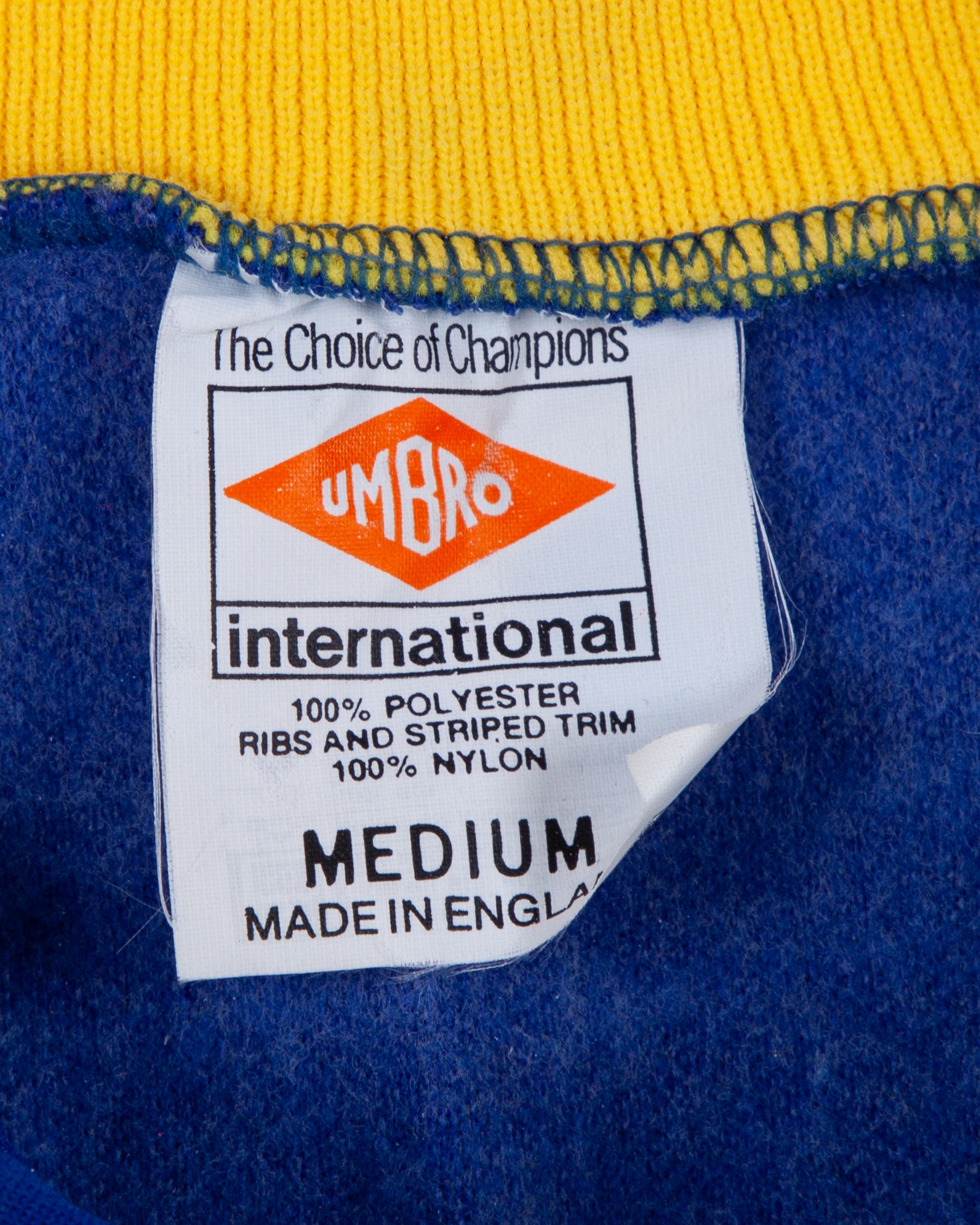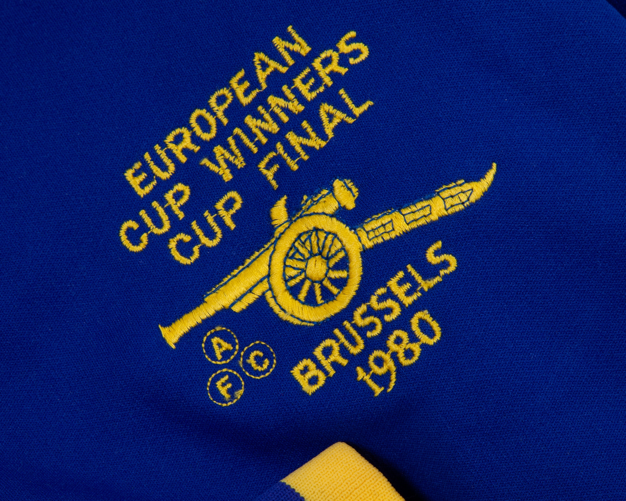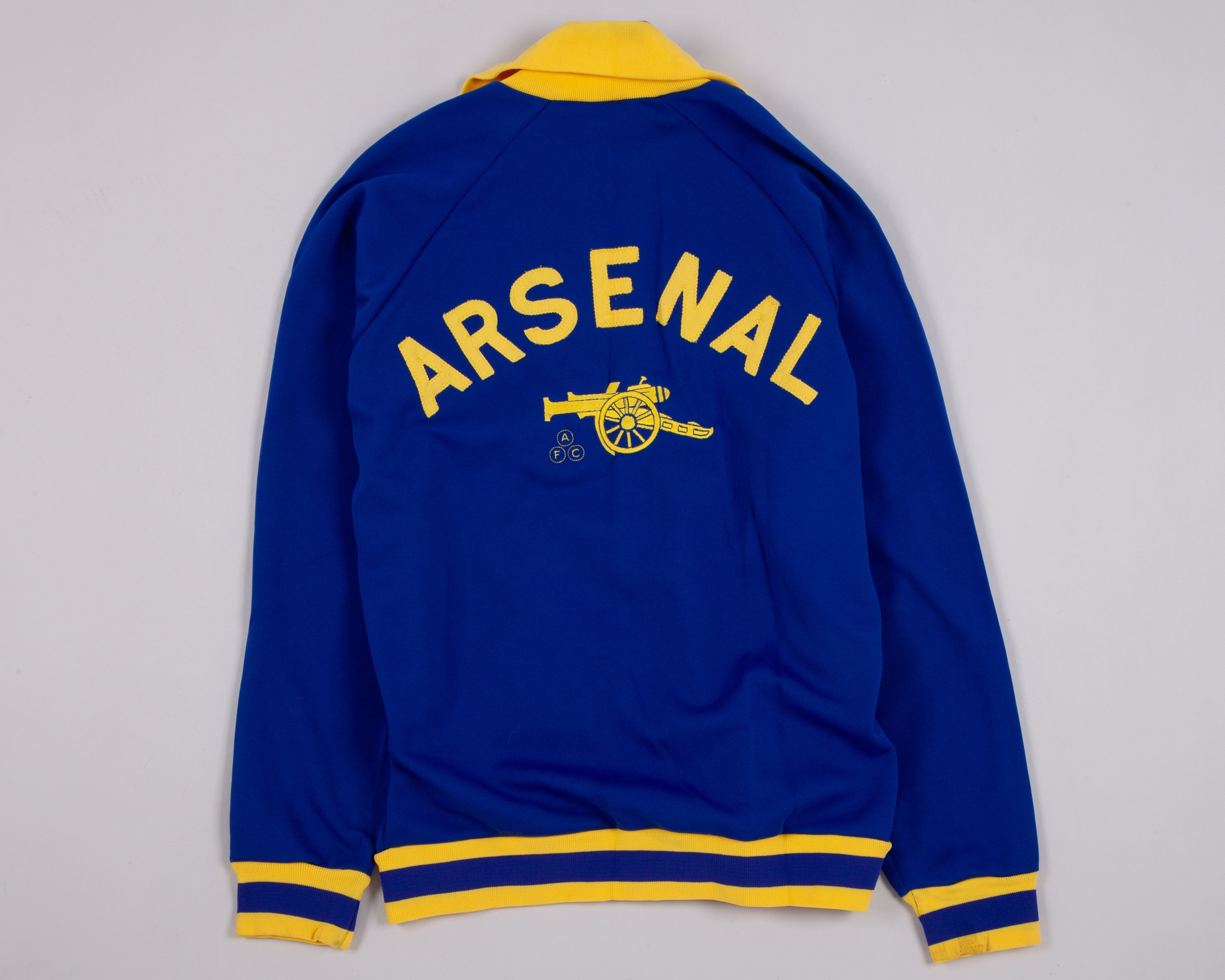 Pat Jennings blue and yellow Arsenal v. Valencia European Cup Winners Cup Final tracksuit top and bottoms, 1980, Umbro, Medium, with zip-up front and embroidered badge inscribed AFC EUROPEAN CUP WINNERS CUP FINAL BRUSSELS 1980F.A. CUP FINAL WEMBLEY 1979, the reverse with large embroidered club crest and lettered ARSENAL, with Pat Jennings Collection autographed COA
