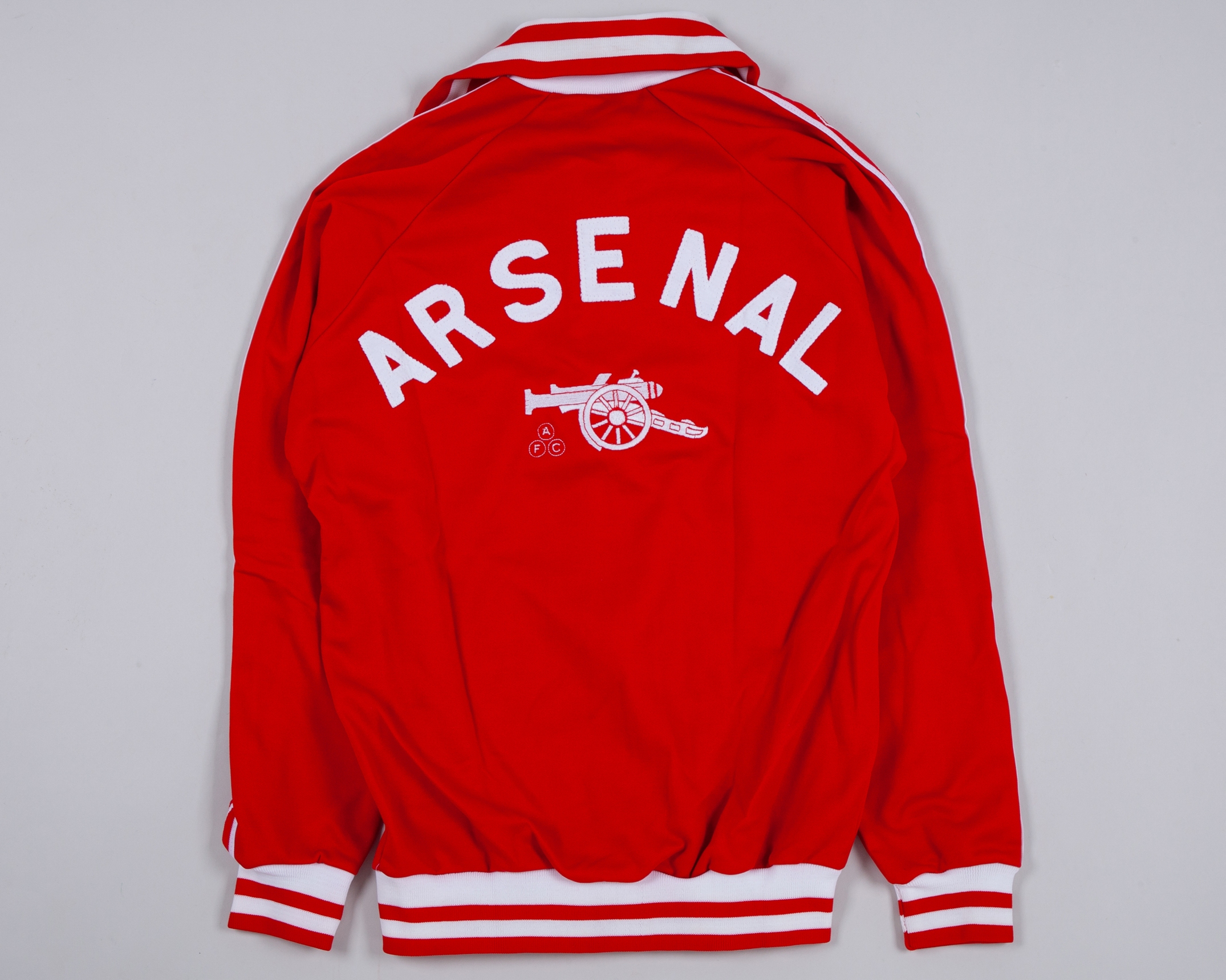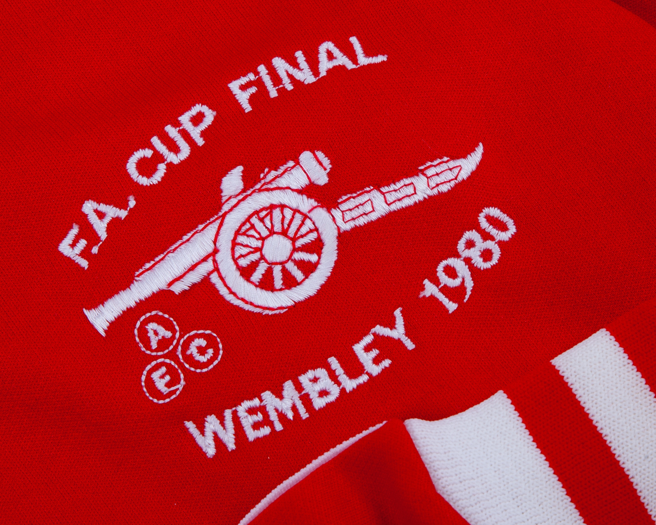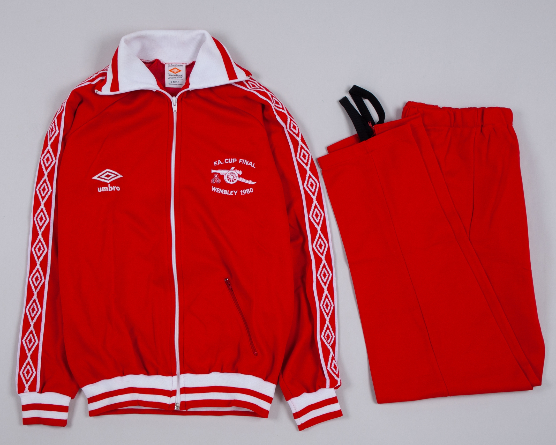 Pat Jennings a red and white Arsenal v. West Ham United F.A.Cup Final tracksuit top and bottoms, 1980, Umbro, Large, with zip-up front and embroidered badge inscribed AFC F.A. CUP FINAL WEMBLEY 1980, the reverse with large embroidered club crest and lettered ARSENAL, some colour run to collar, with Pat Jennings Collection autographed COA