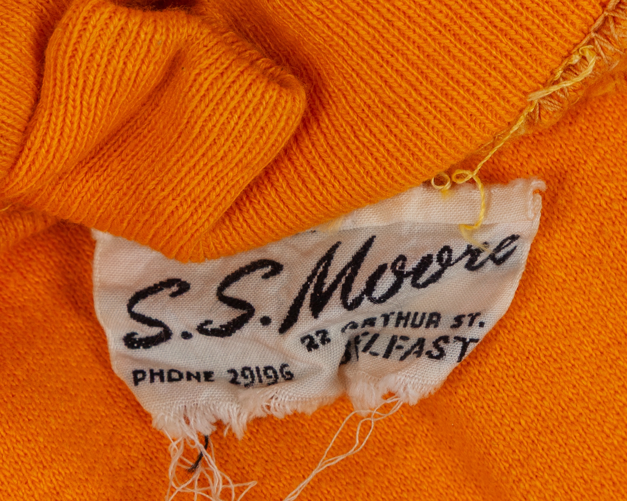 Pat Jennings yellow Northern Ireland goalkeepers shirt, mid-1960s, S.S.Moore X.O.S., with crew-neck collar and embroidered cloth badge inscribed IRISH FOOTBALL ASSOCIATION, stained and areas of wear, with Pat Jennings Collection autographed COA