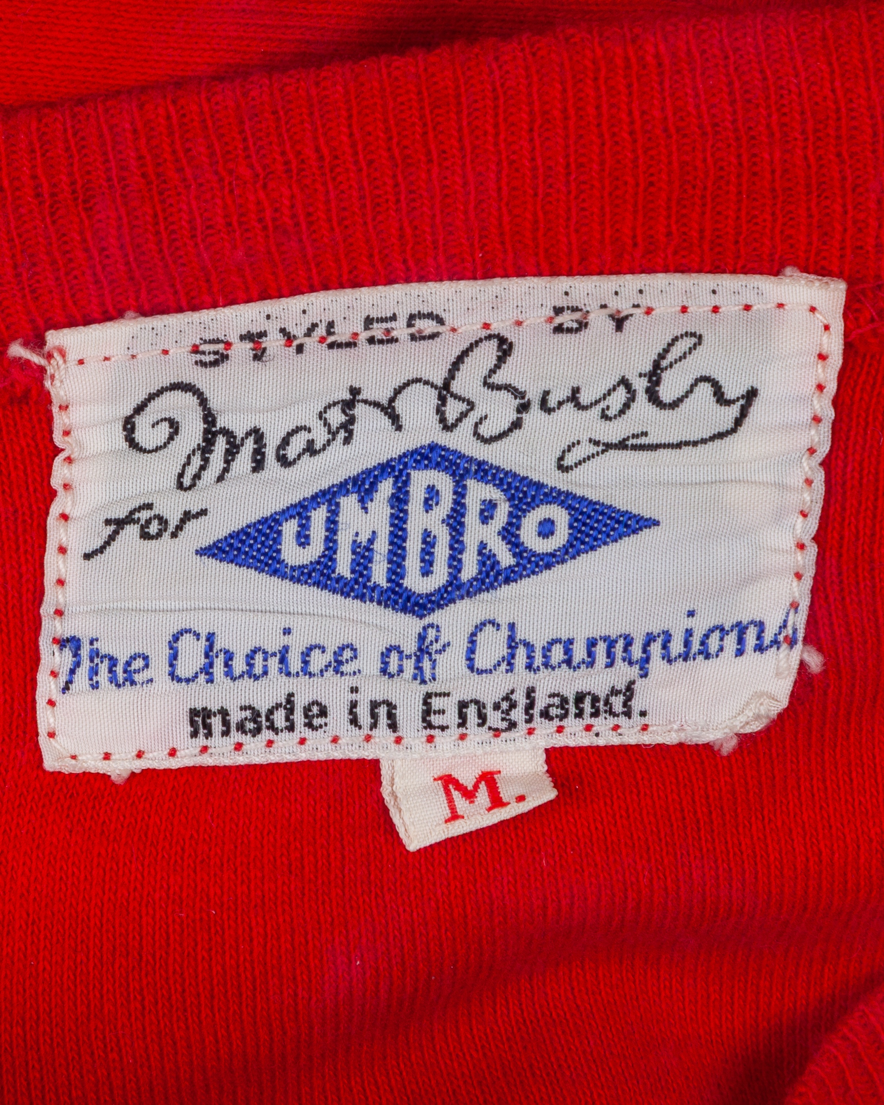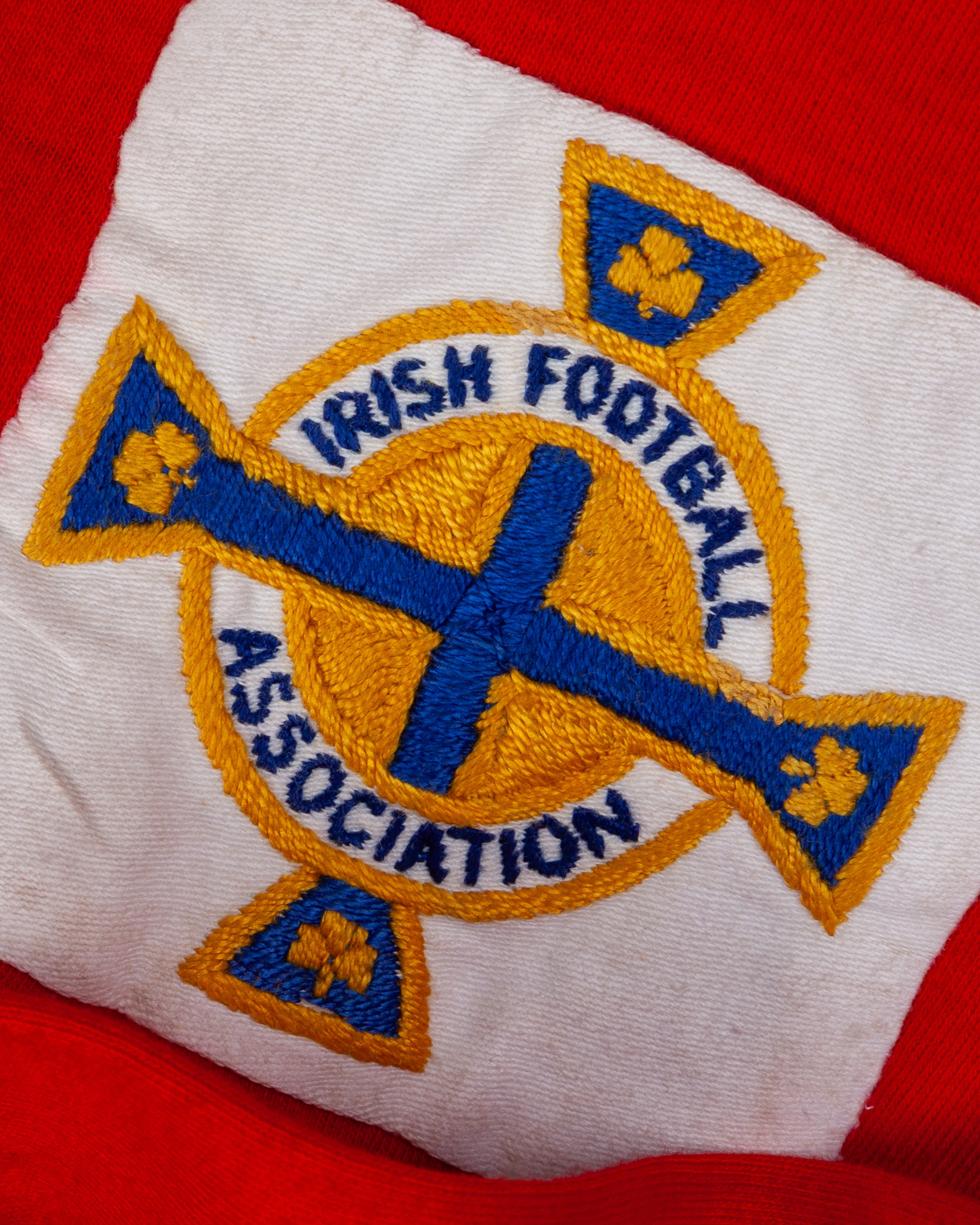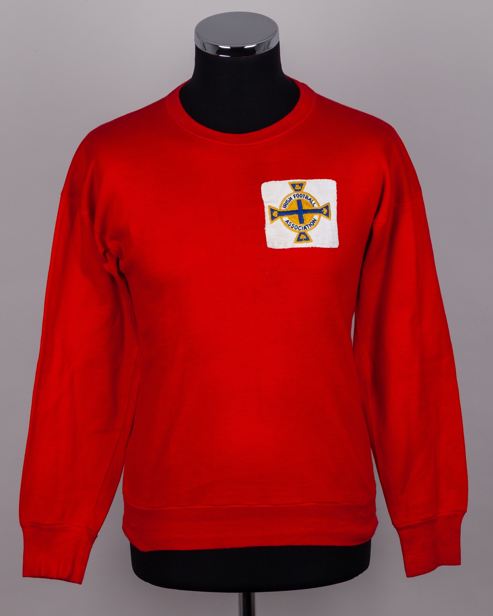 Pat Jennings red Northern Ireland goalkeepers shirt, early 1960s, Umbro, M, with crew-neck collar and embroidered cloth badge inscribed IRISH FOOTBALL ASSOCIATION, with Pat Jennings Collection autographed COA