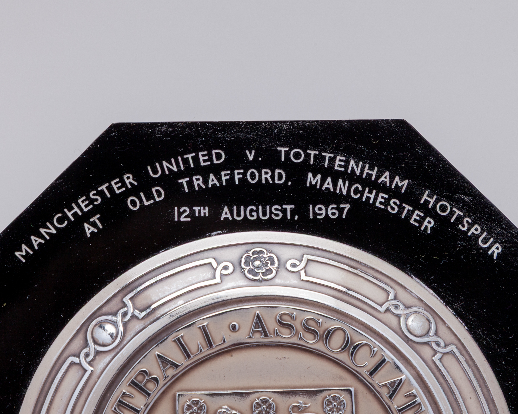 Pat Jennings a silver-mounted and bakelite Tottenham Hotspur v. Manchester United Charity Shield plaque, 1967, inscribed FOOTBALL ASSOCIATION CHARITY SHIELD, MANCHESTER UNITED v. TOTTENHAM HOTSPUR AT OLD TRAFFORD, MANCHESTER 12TH AUGUST, 1967, PAT JENNINGS, on easel stand, with Pat Jennings Collection autographed COA