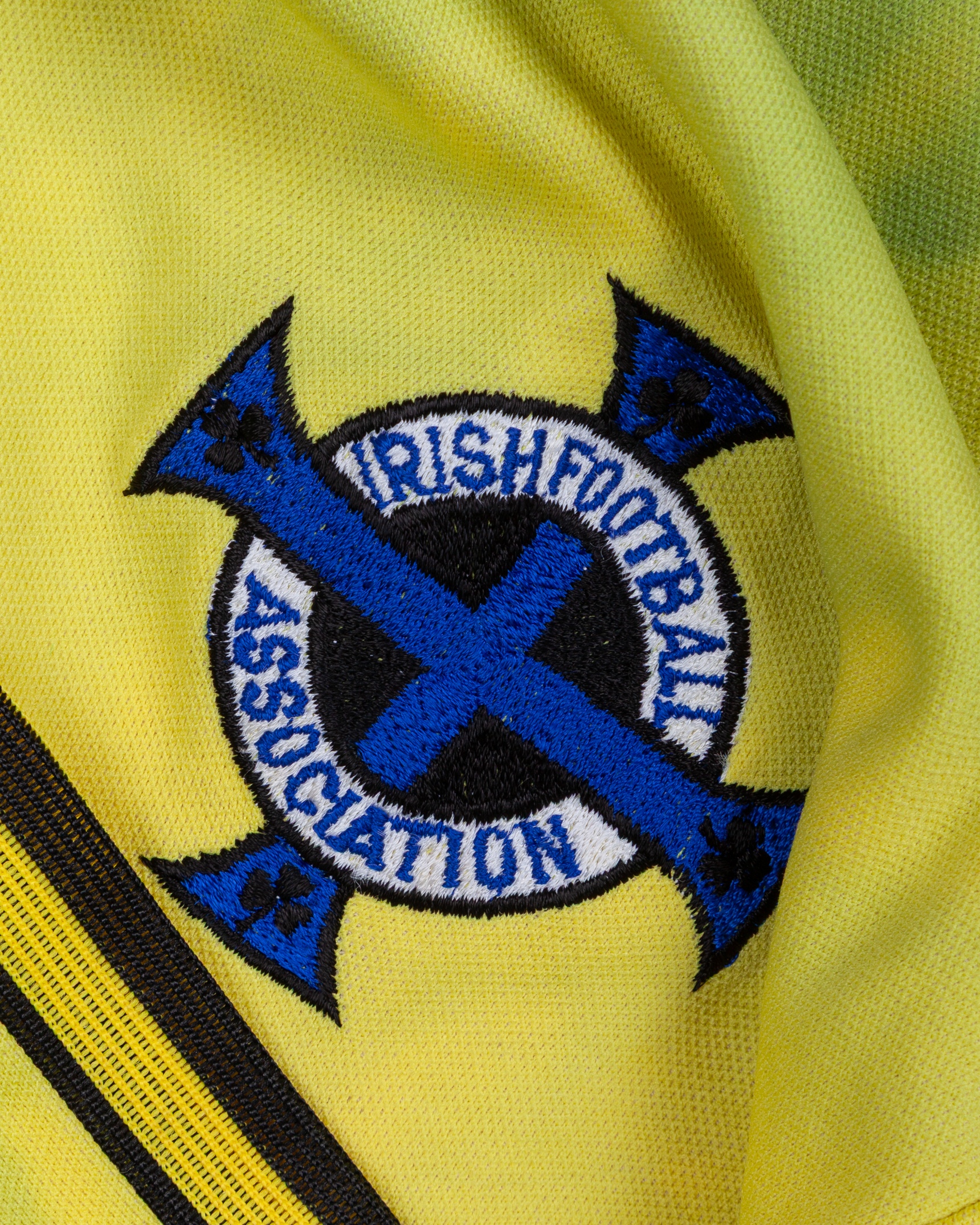 Pat Jennings yellow and No.1 Northern Ireland goalkeepers shirt, 1980-81, Adidas, L, with crew-neck collar and embroidered badge inscribed IRISH FOOTBALL ASSOCIATION, colour run and staining, with Pat Jennings Collection autographed COA