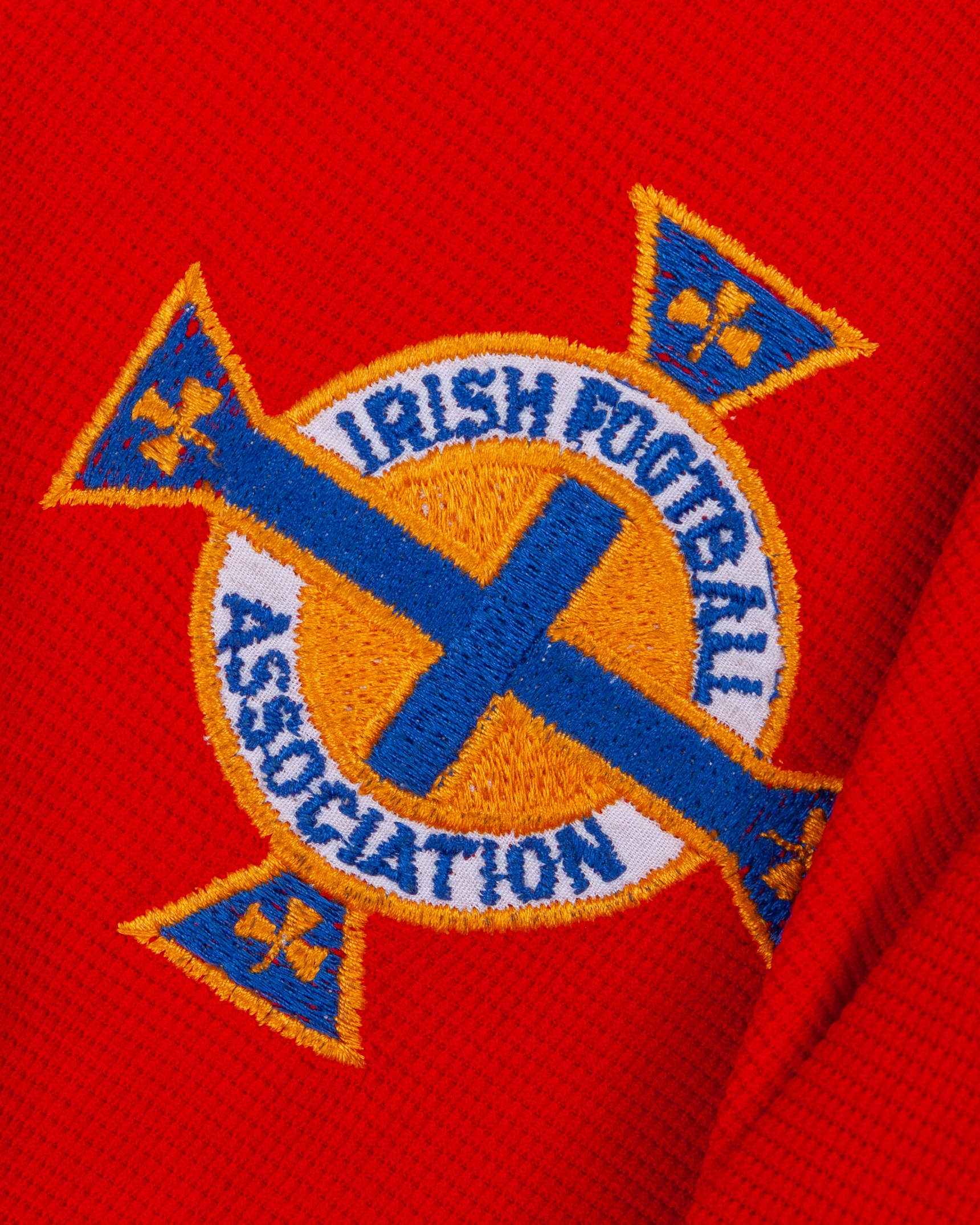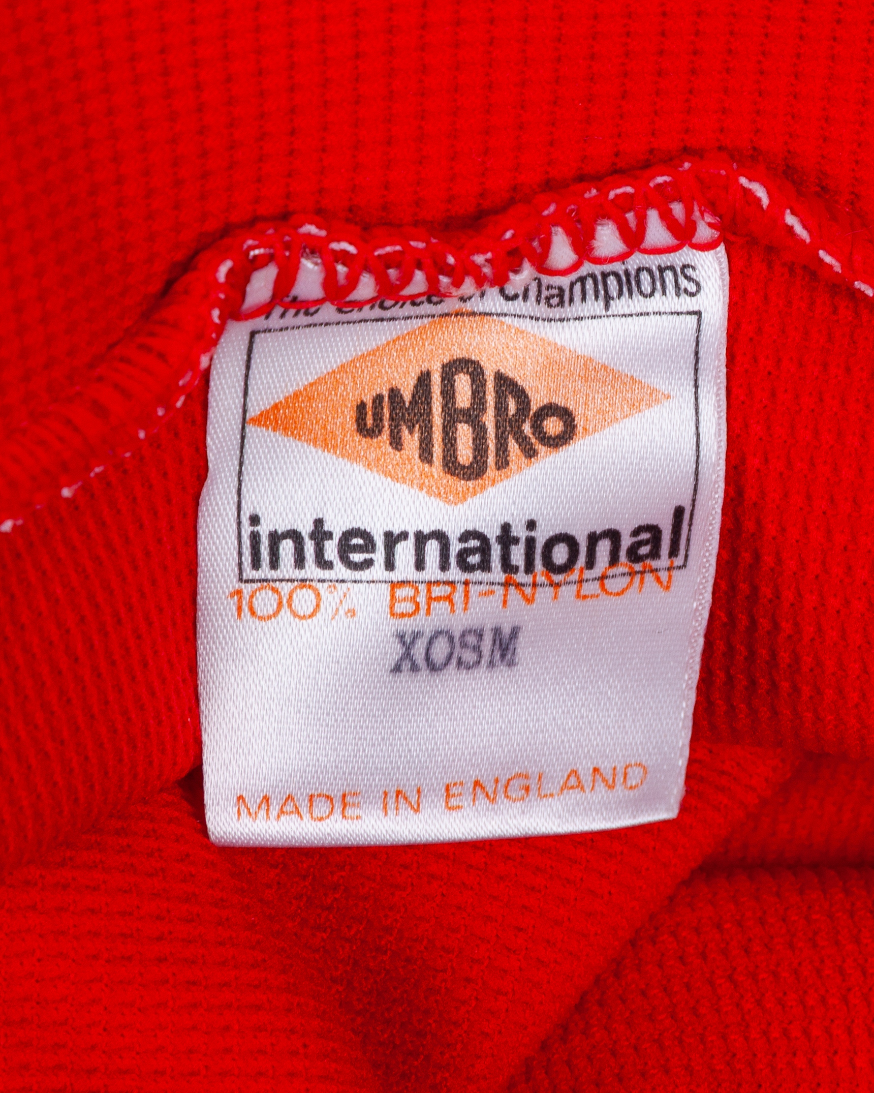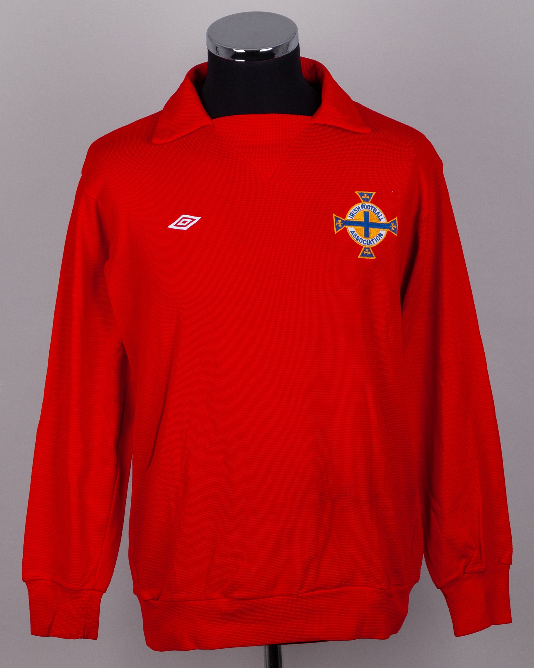 Pat Jennings red No.1 Northern Ireland goalkeepers shirt, Umbro, XOSM, with v-neck collar and embroidered badge inscribed IRISH FOOTBALL ASSOCIATION, with Pat Jennings Collection autographed COA