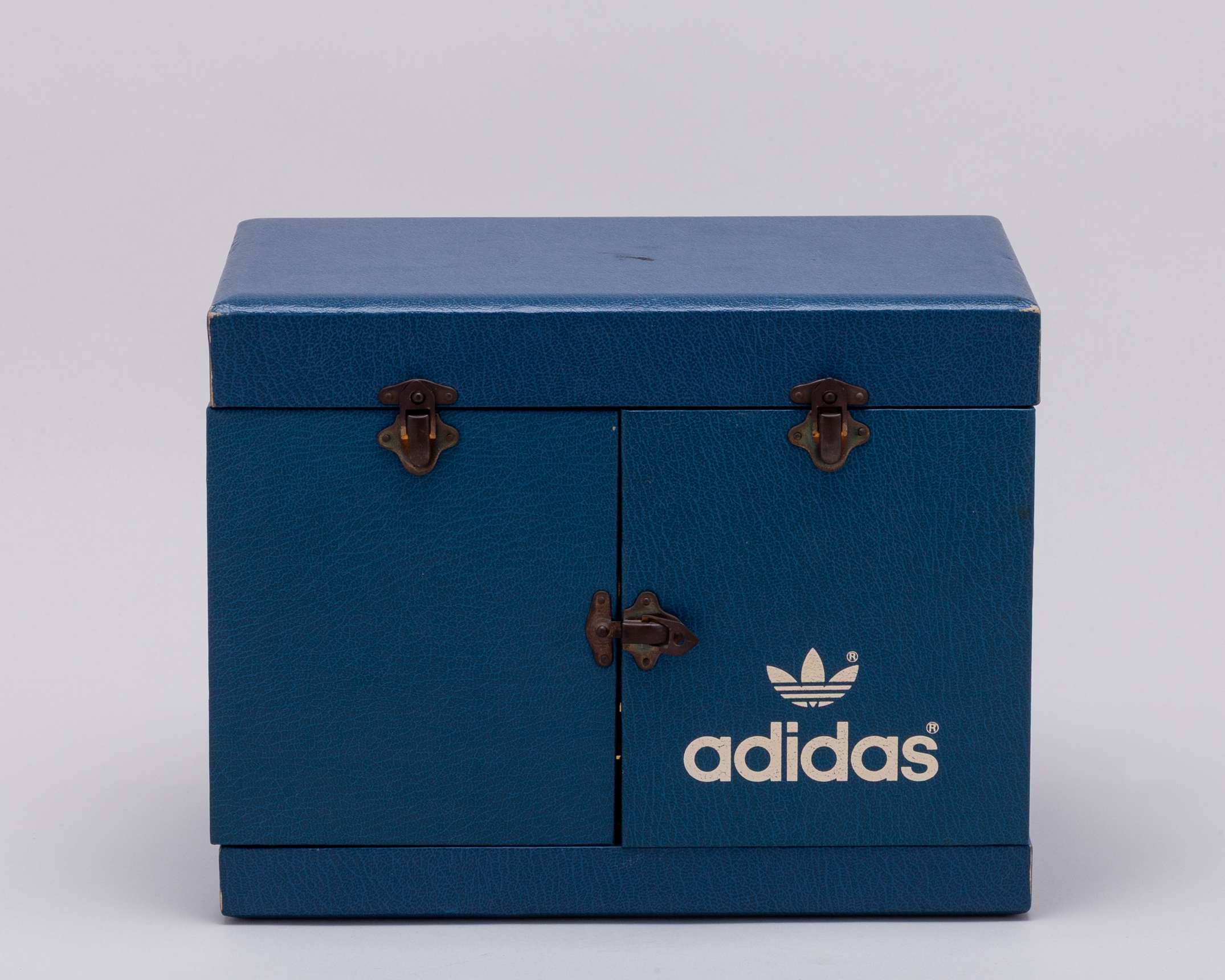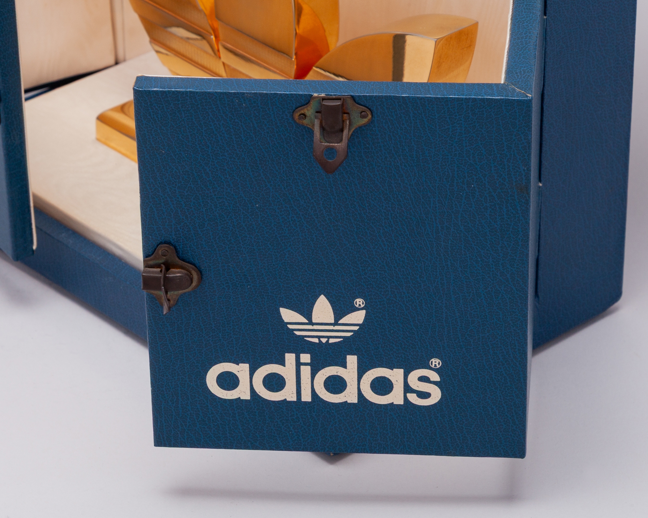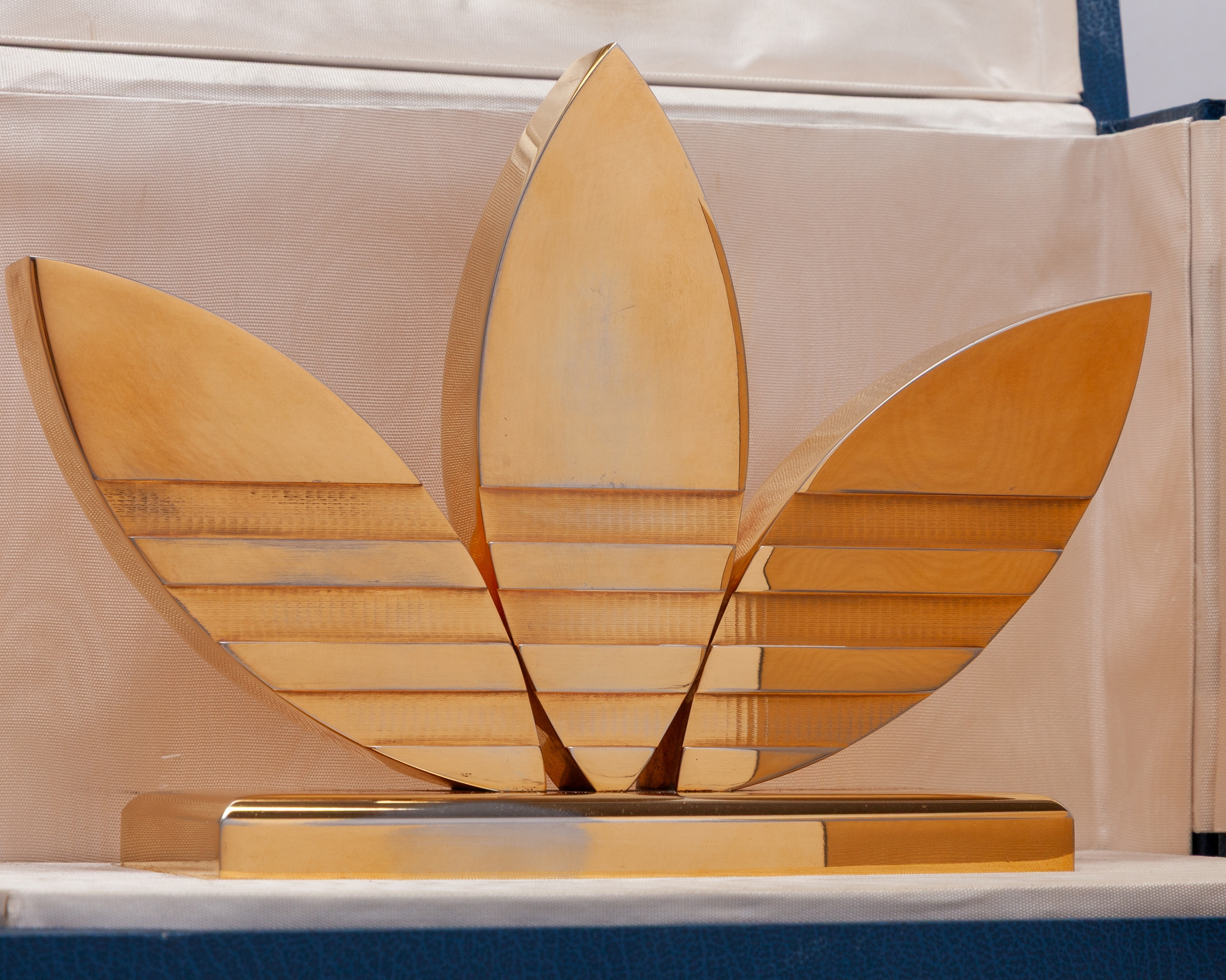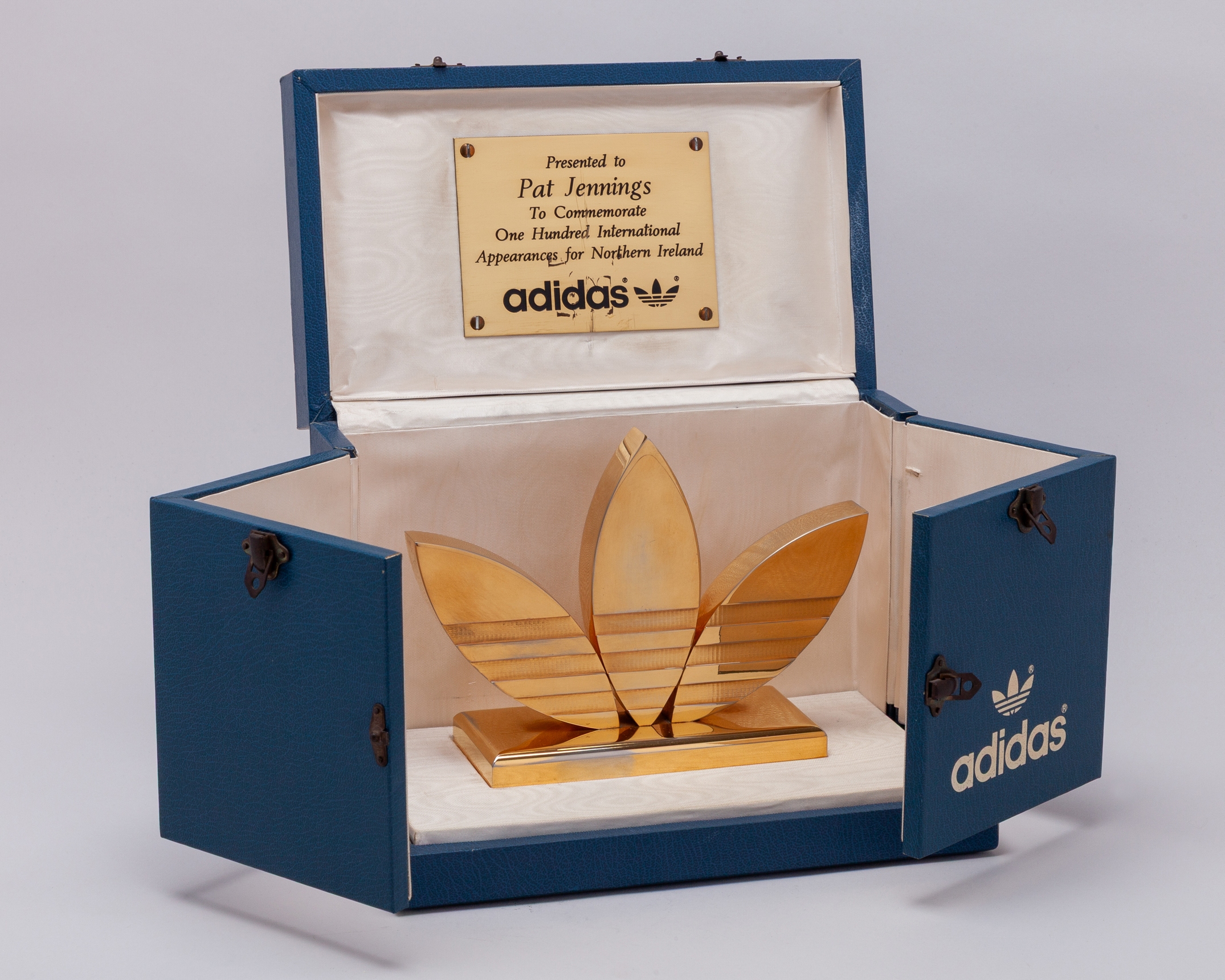 Pat Jennings rare yellow-metal Adidas 100 International Appearances presentation award, the trophy modelled as the Adidas trefoil logo, in original fitted case, with hinged lid and doors, with plaque inscribed Presented to Pat Jennings To Commemorate One Hundred International Appearances for Northern Ireland, adidas, 13 cm high x 18cm wide, with Pat Jennings Collection autographed COA