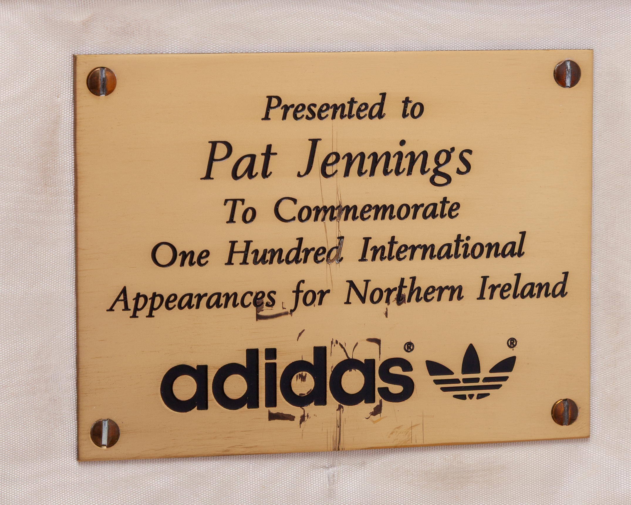 Pat Jennings rare yellow-metal Adidas 100 International Appearances presentation award