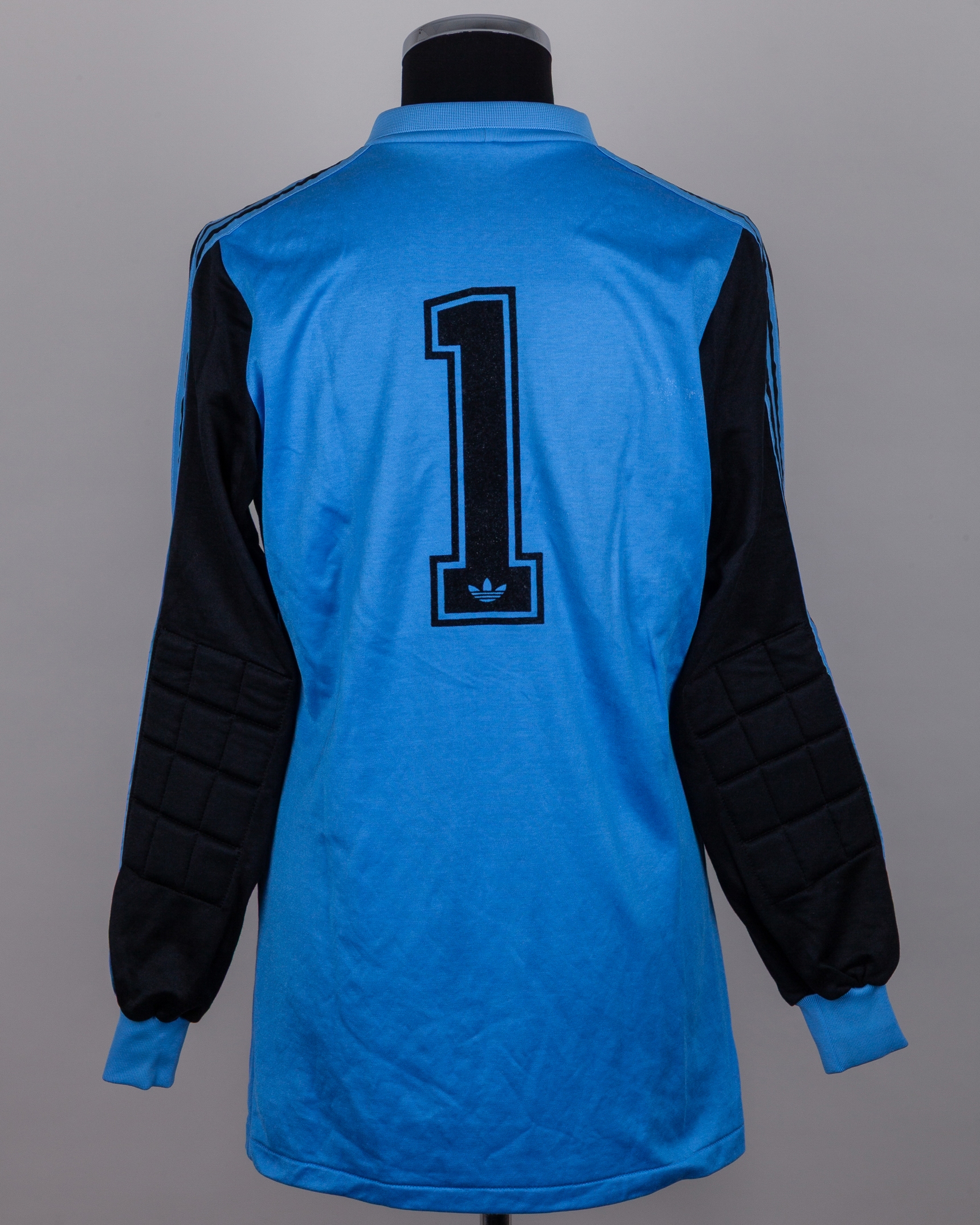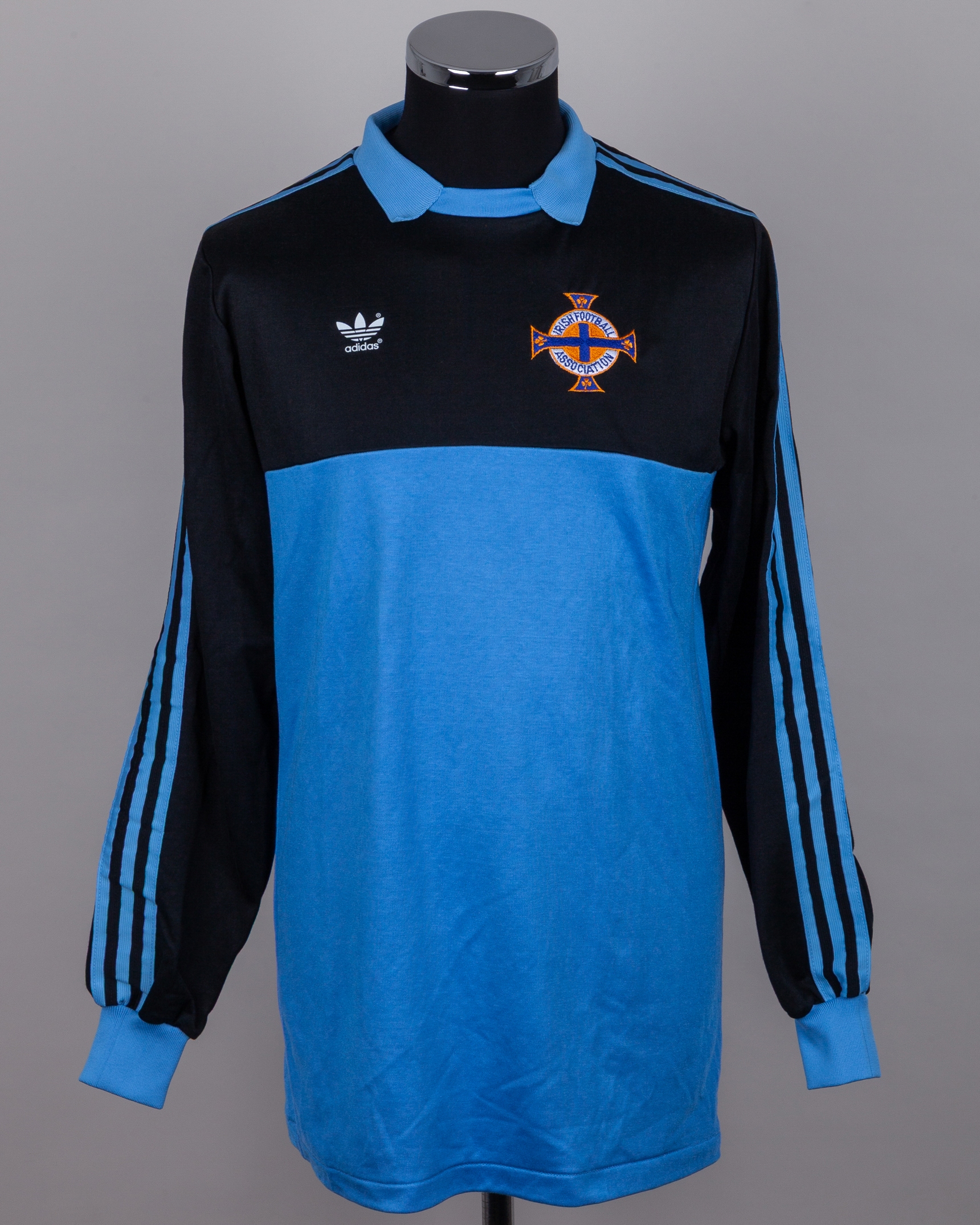 Pat Jennings blue and black No.1 Northern Ireland goalkeepers shirt, 1980s