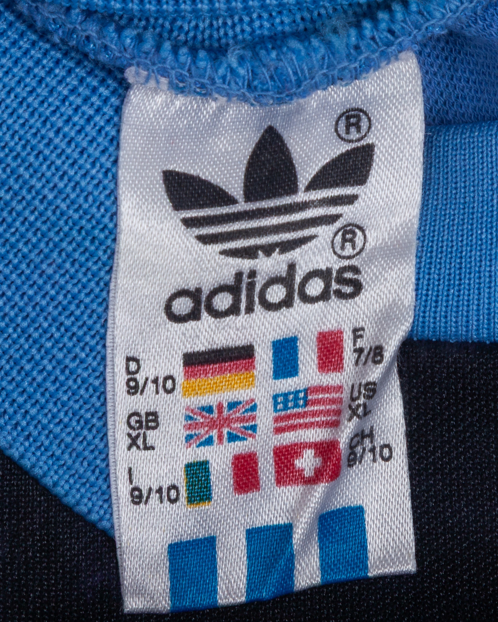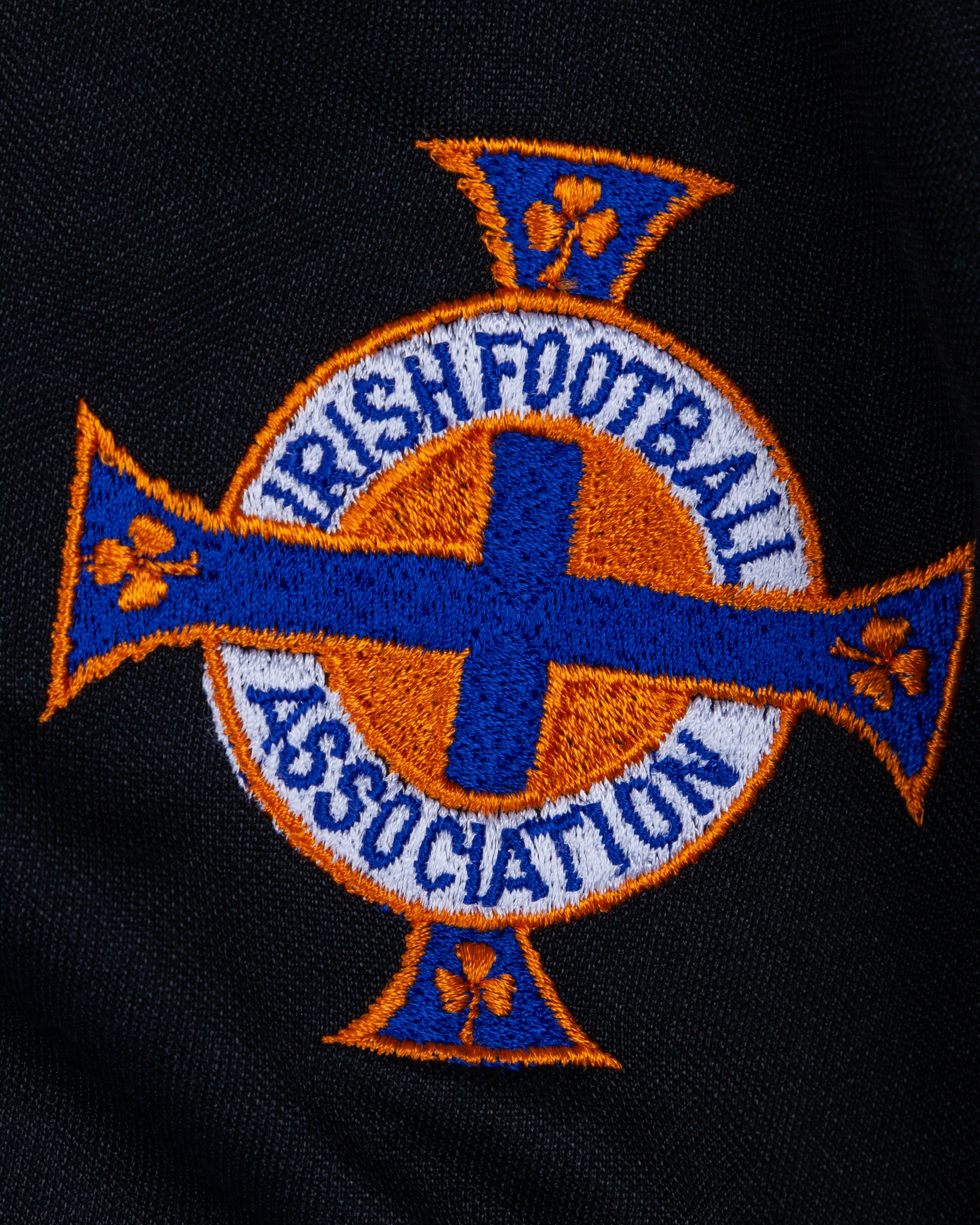 Pat Jennings blue and black No.1 Northern Ireland goalkeepers shirt, 1980s, Adidas, XL, with crew-neck collar and embroidered badge inscribed IRISH FOOTBALL ASSOCITAION, with Pat Jennings Collection autographed COA
