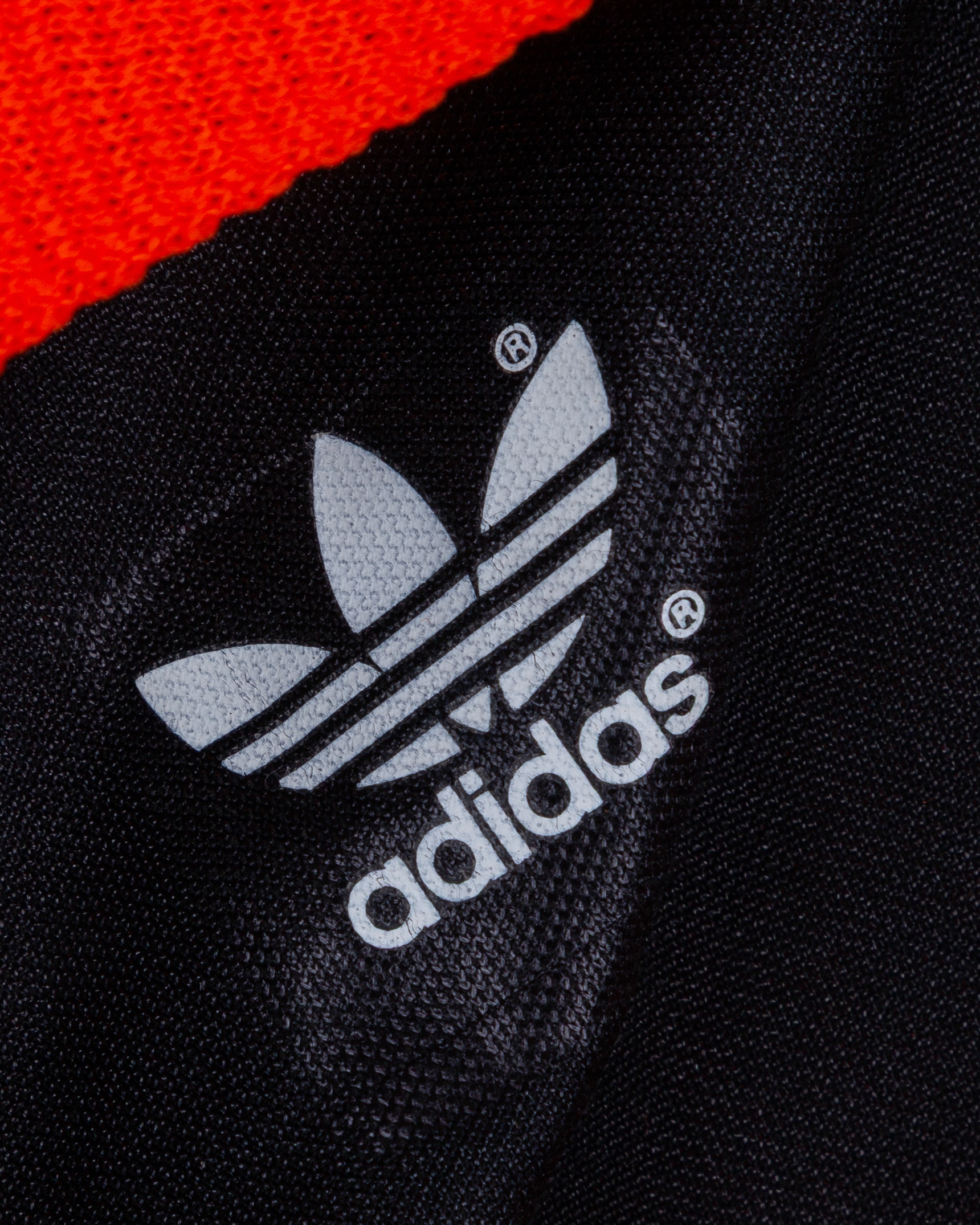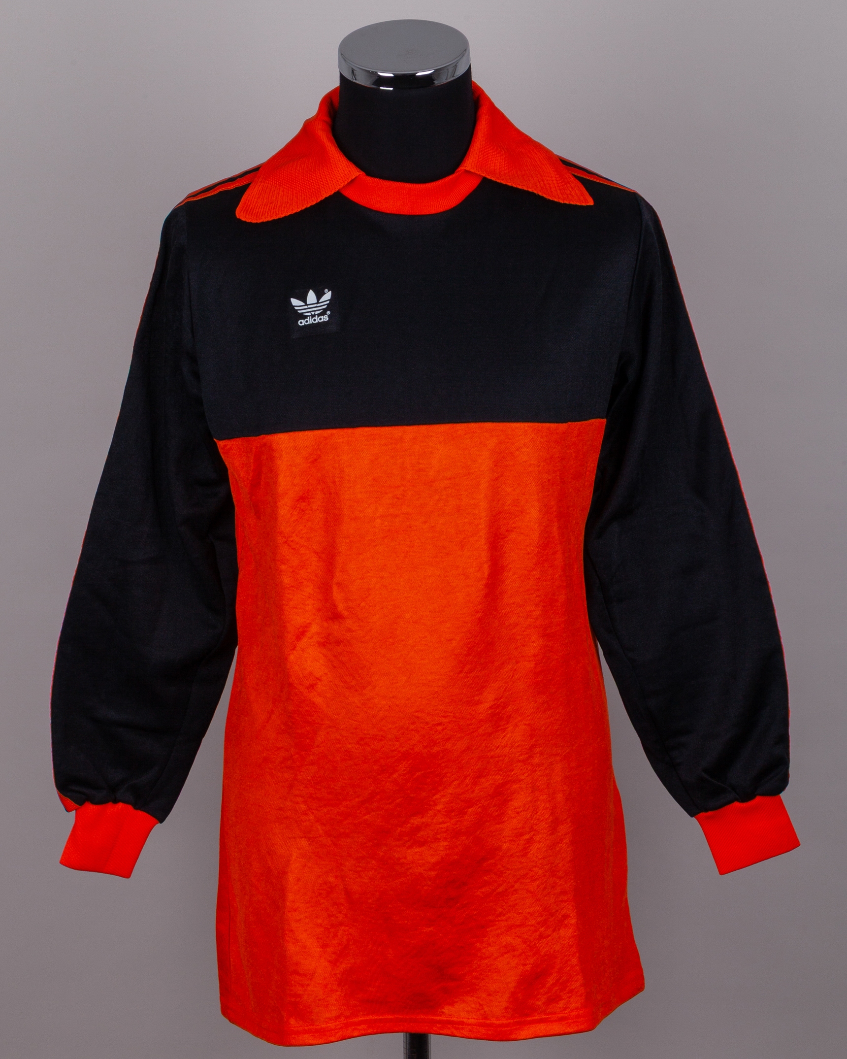 Orange and black No1. goalkeepers shirt, 1985, Adidas, Large, with crew-neck collar, with Pat Jennings Collection autographed COA