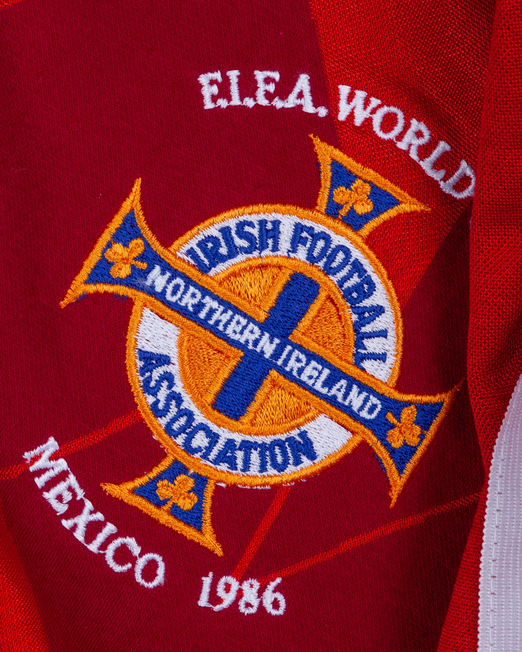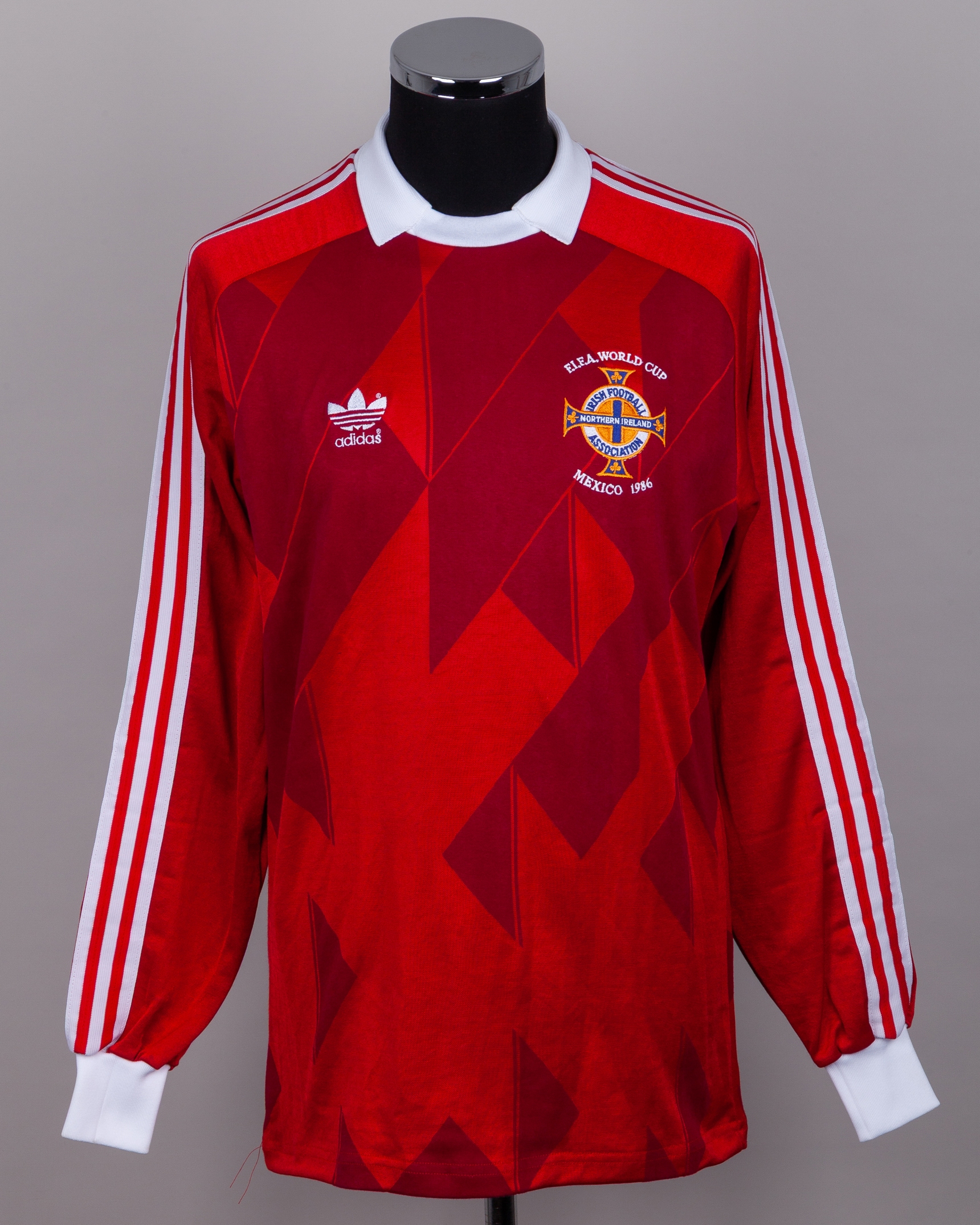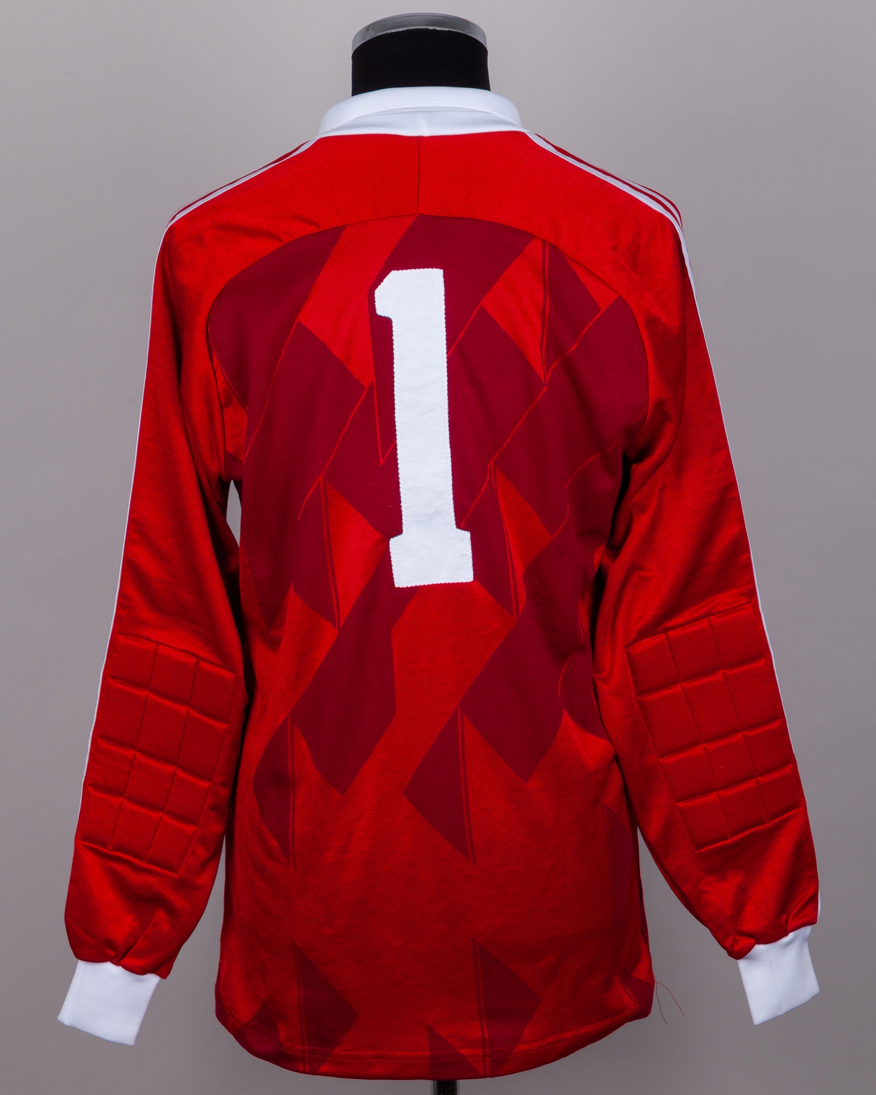 Pat Jennings red and white No.1 Northern Ireland World Cup goalkeepers shirt, 1986