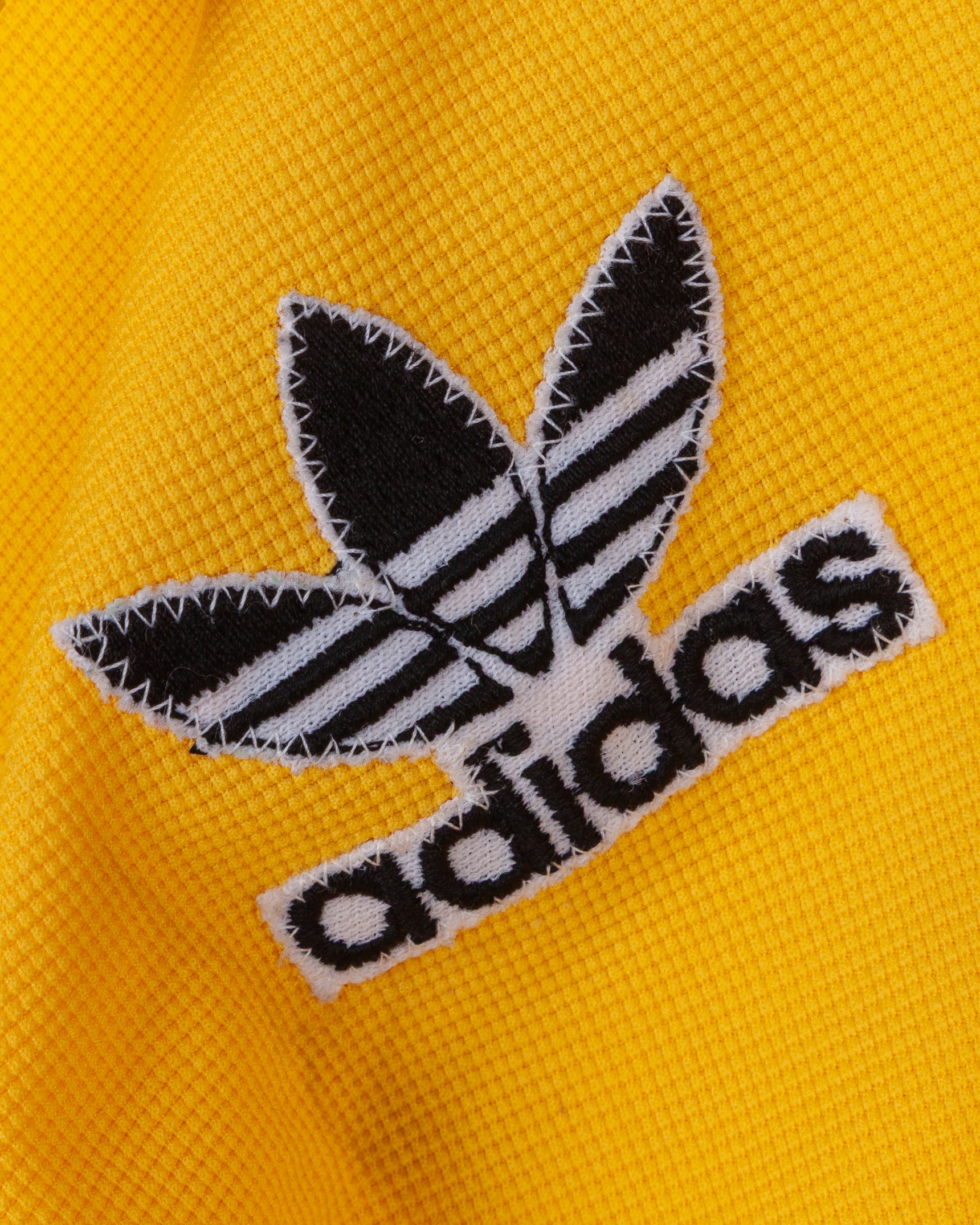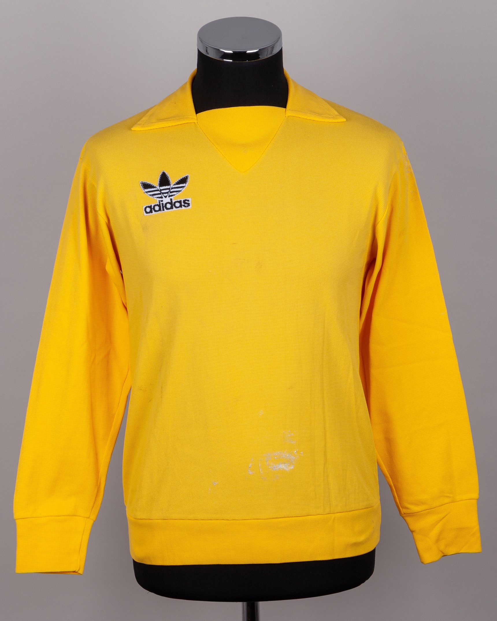 Pat Jennings yellow No.1 Northern Ireland goalkeepers shirt, Adidas, OSM, with v-neck collar, staining to front, with Pat Jennings Collection autographed COA