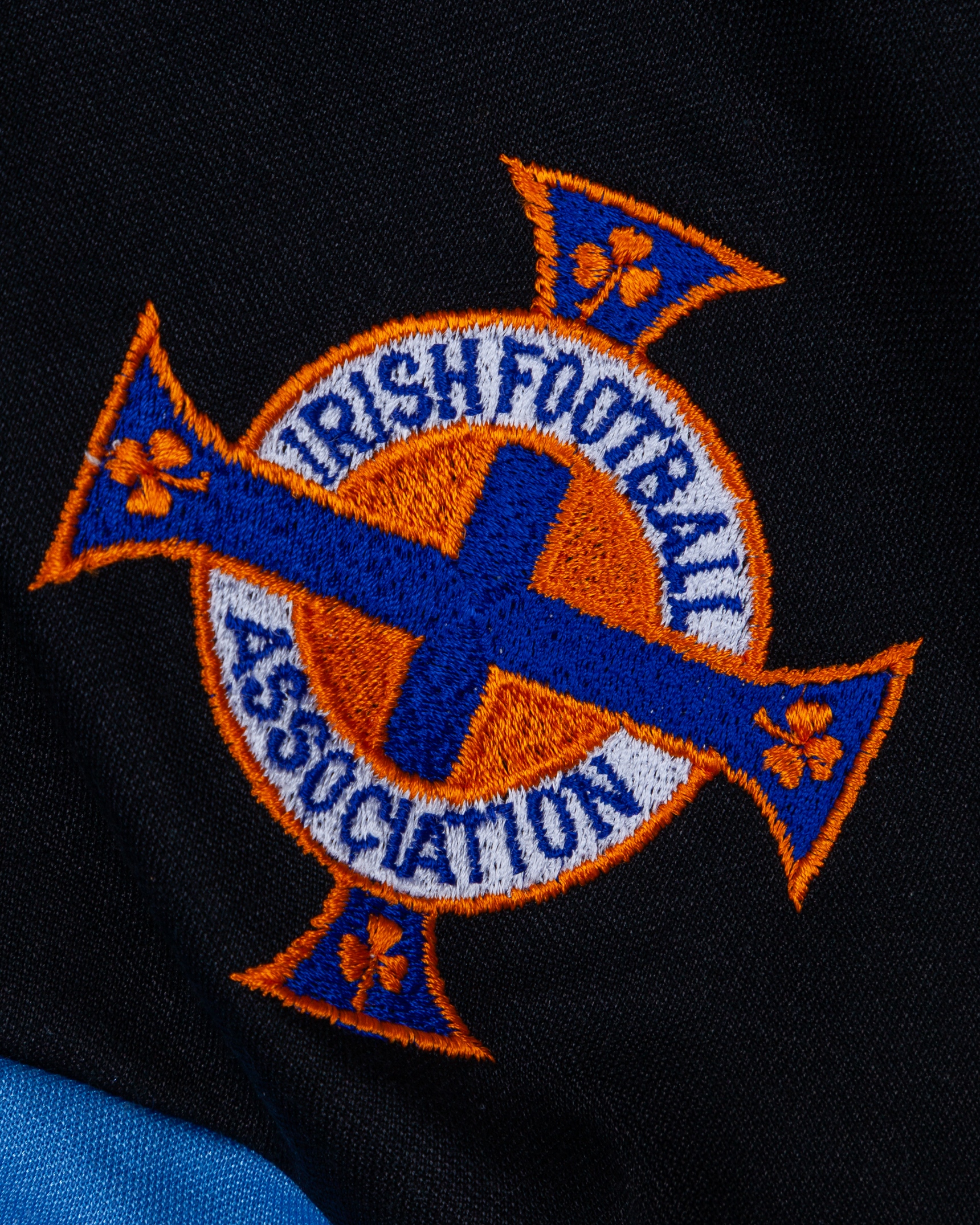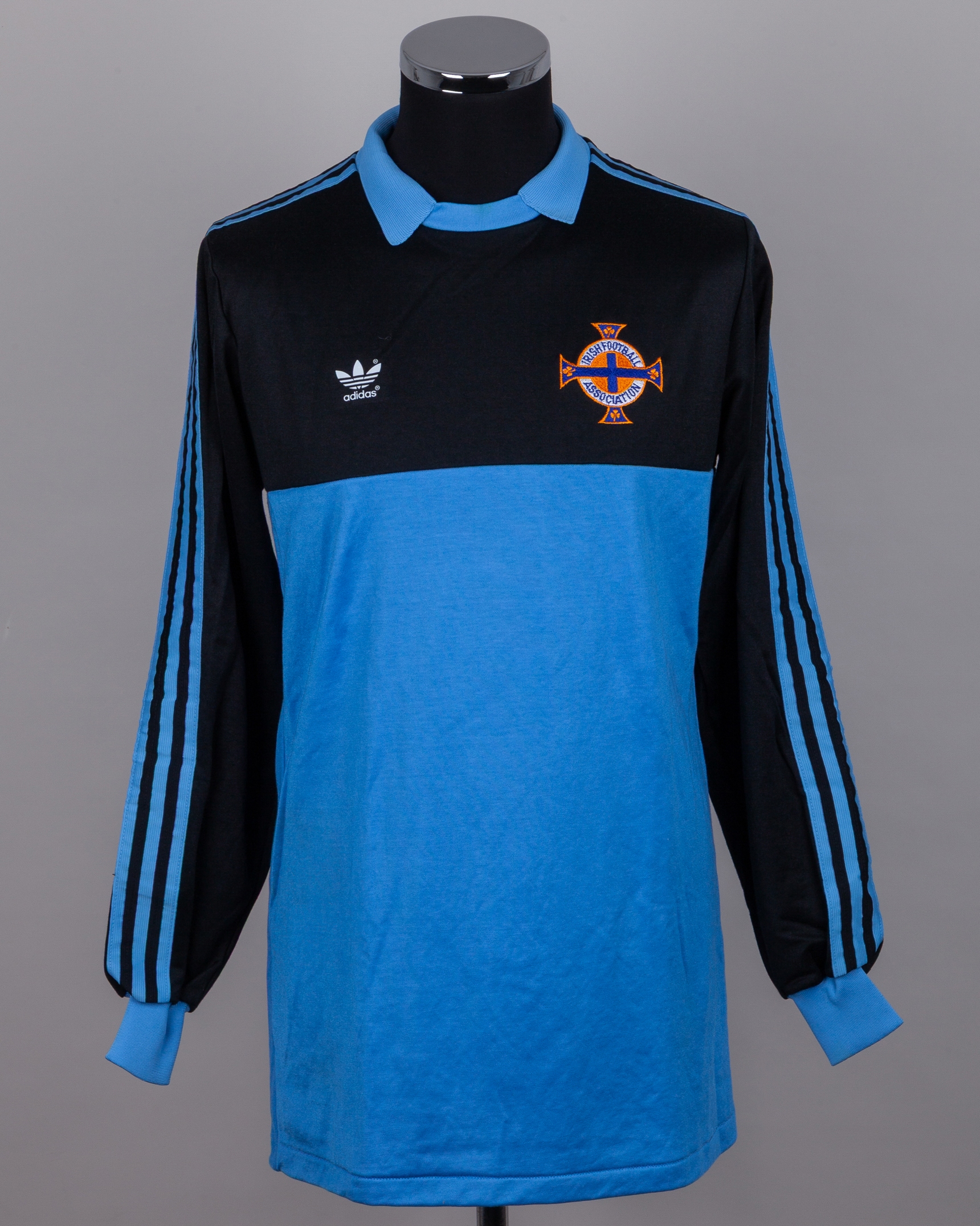 Pat Jennings blue and black No.1 Northern Ireland goalkeepers shirt, 1980s, Adidas, XL, with crew-neck collar and embroidered badge inscribed IRISH FOOTBALL ASSOCITAION, with Pat Jennings Collection autographed COA