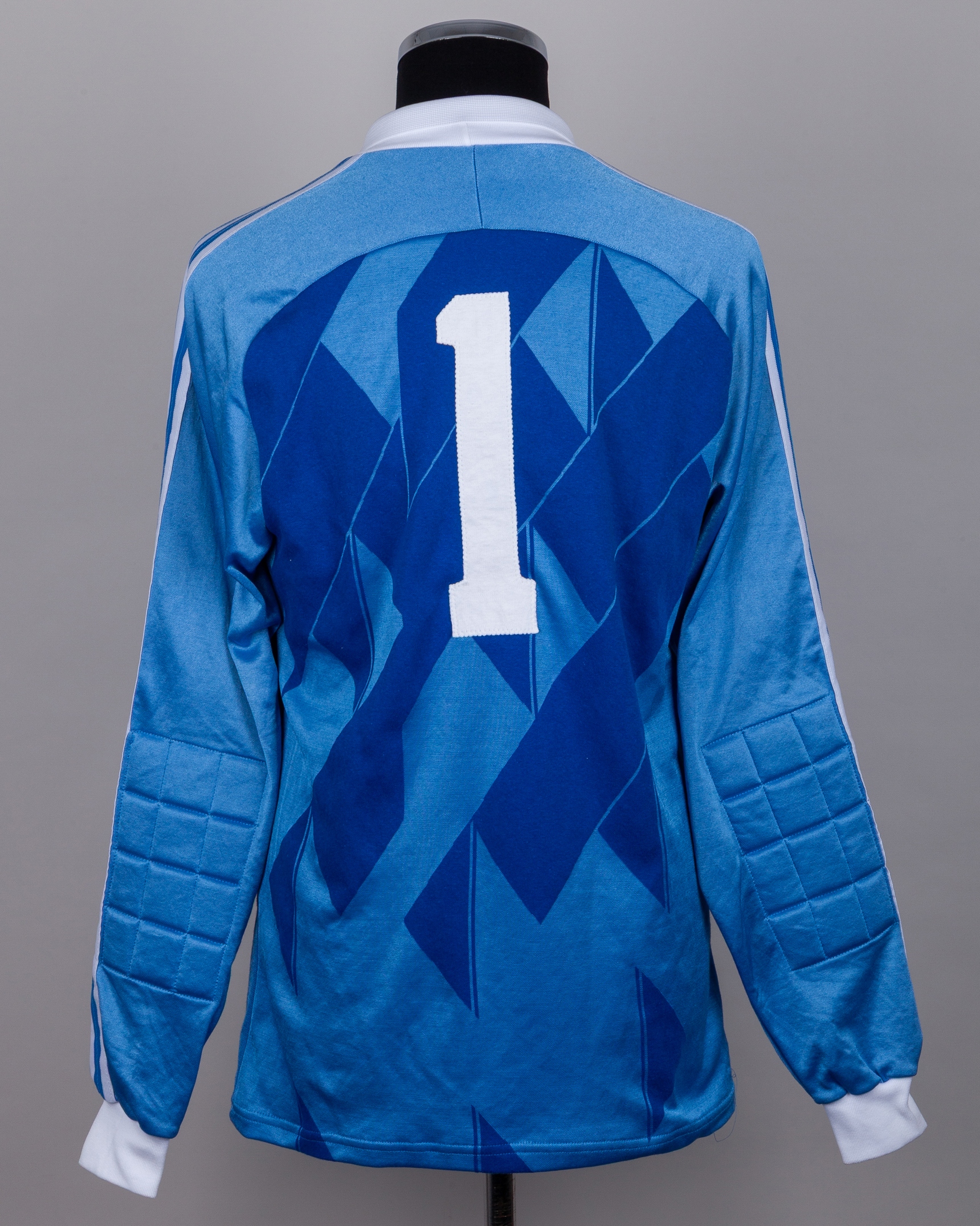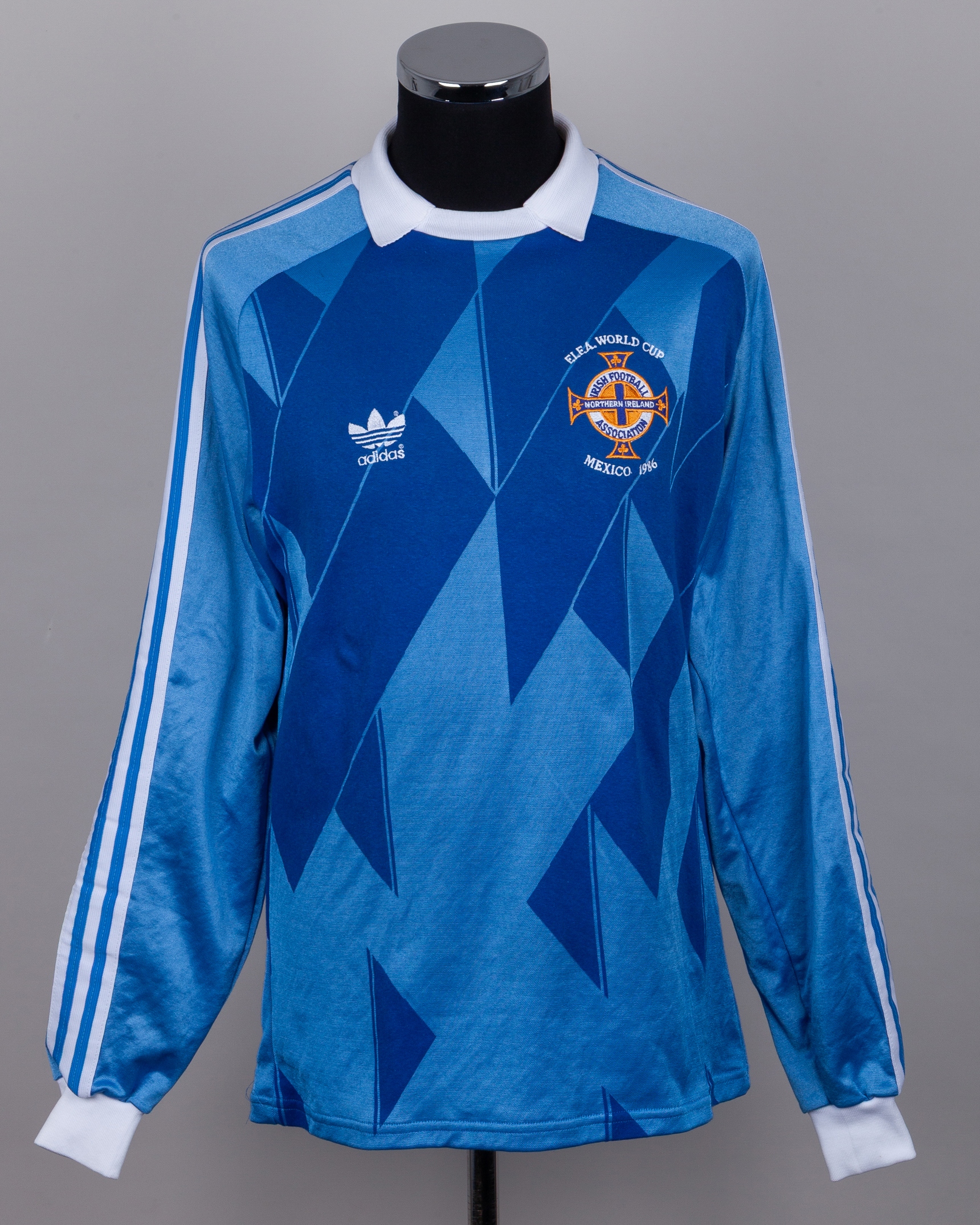 Pat Jennings - Final International Appearance: blue and white No.1 Northern Ireland v. Brazil World Cup match worn goalkeepers shirt, 1986, Adidas, XL, with crew-neck collar and embroidered badge inscribed NORTHERN IRELAND IRISH FOOTBALL ASSOCIATION MEXICO 1986, with Pat Jennings Collection autographed COA