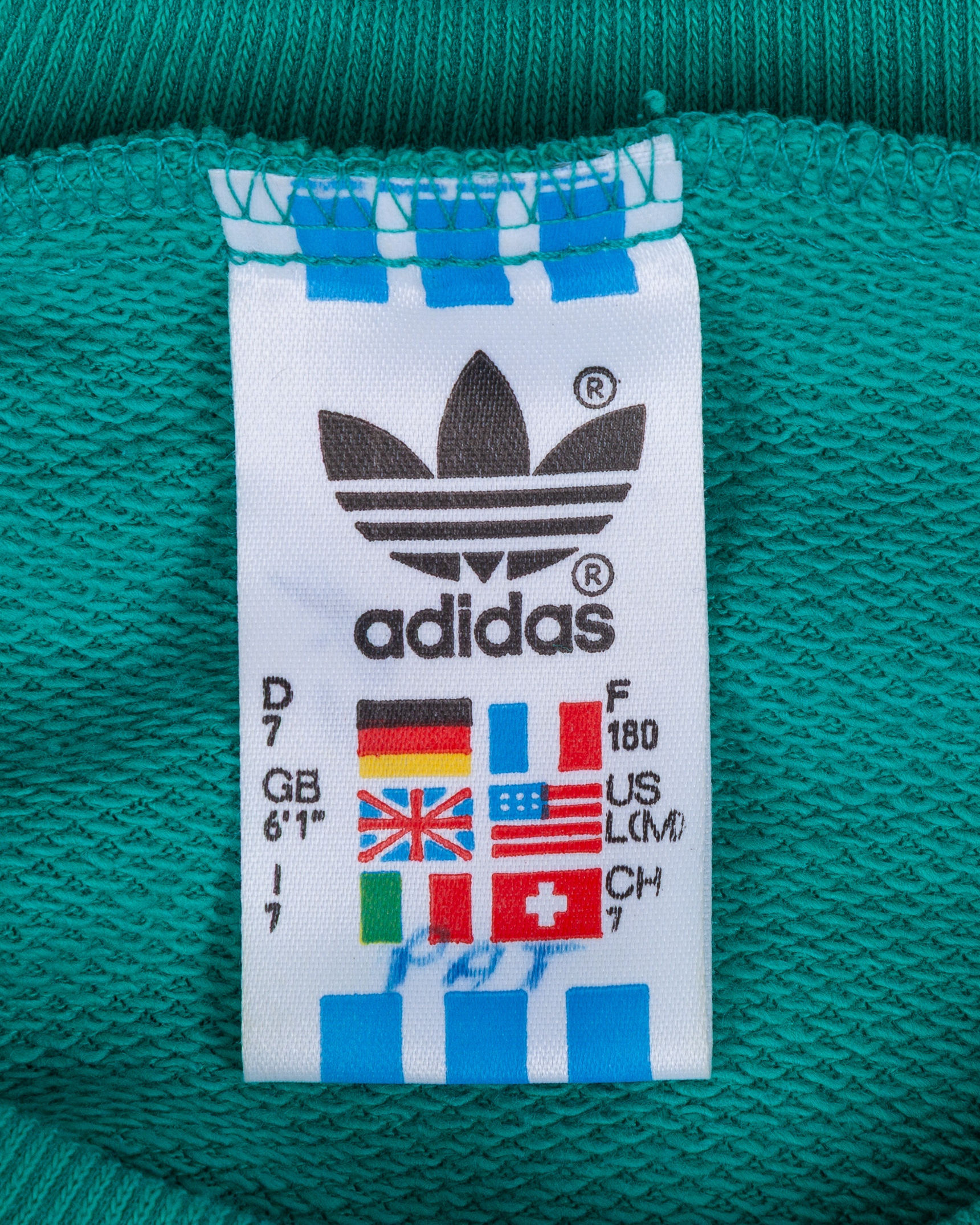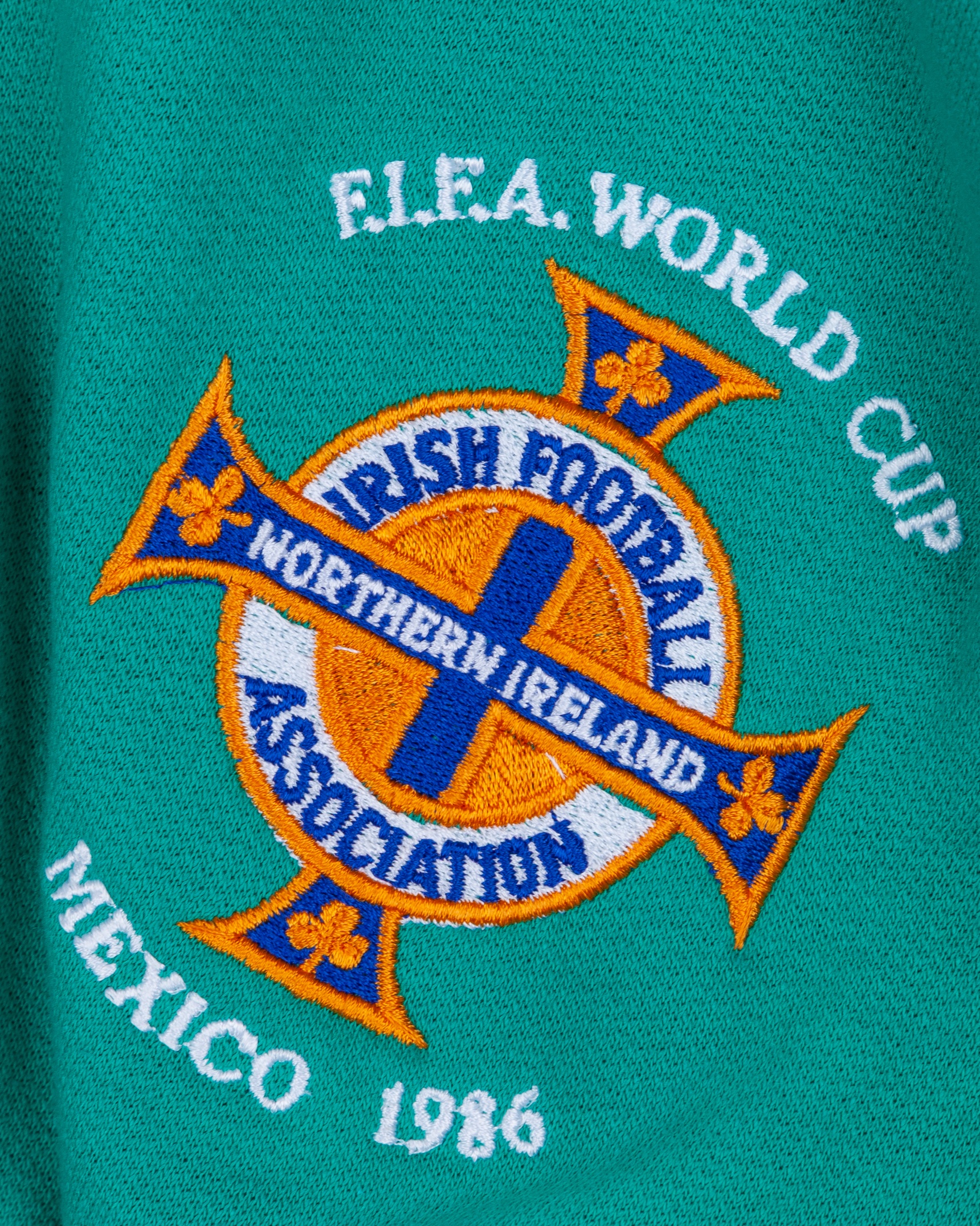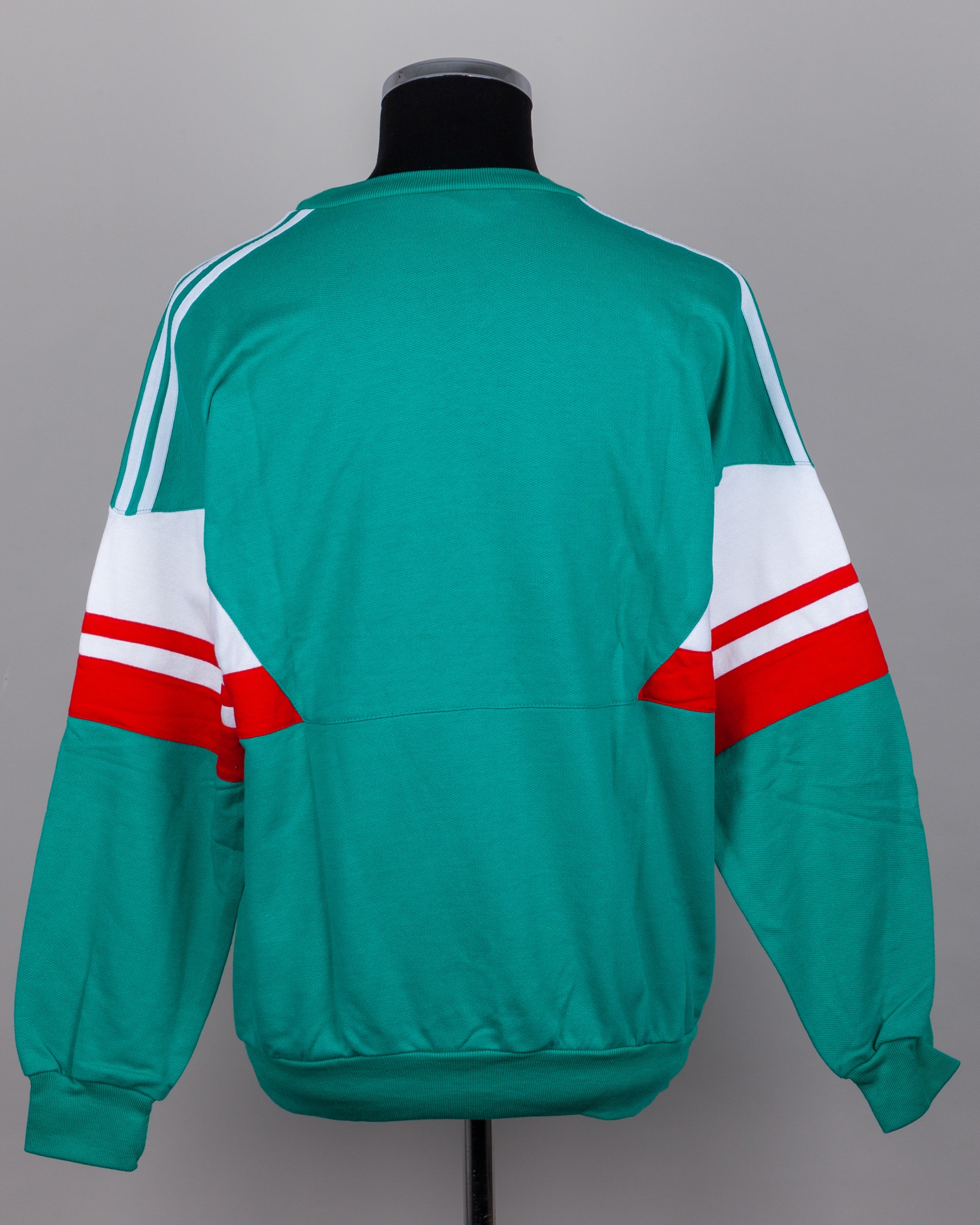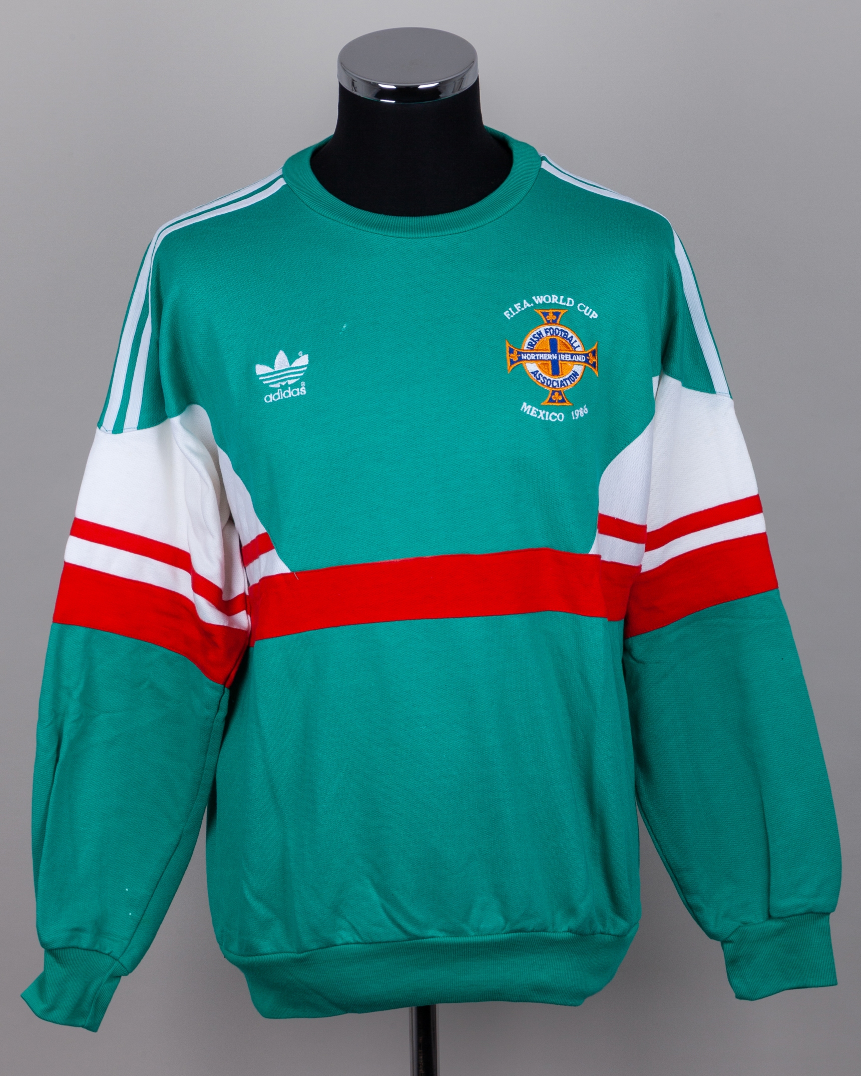 Pat Jennings green, white and red Mexico World Cup sweat shirt, 1986, Adidas, 6'1", with crew-neck collar and embroidered badge inscribed F.I.F.A. WORLD CUP MEXICO 1986 IRISH FOOTBALL ASSOCIATION, the collar label inscribed in ink PAT, with Pat Jennings Collection autographed COA