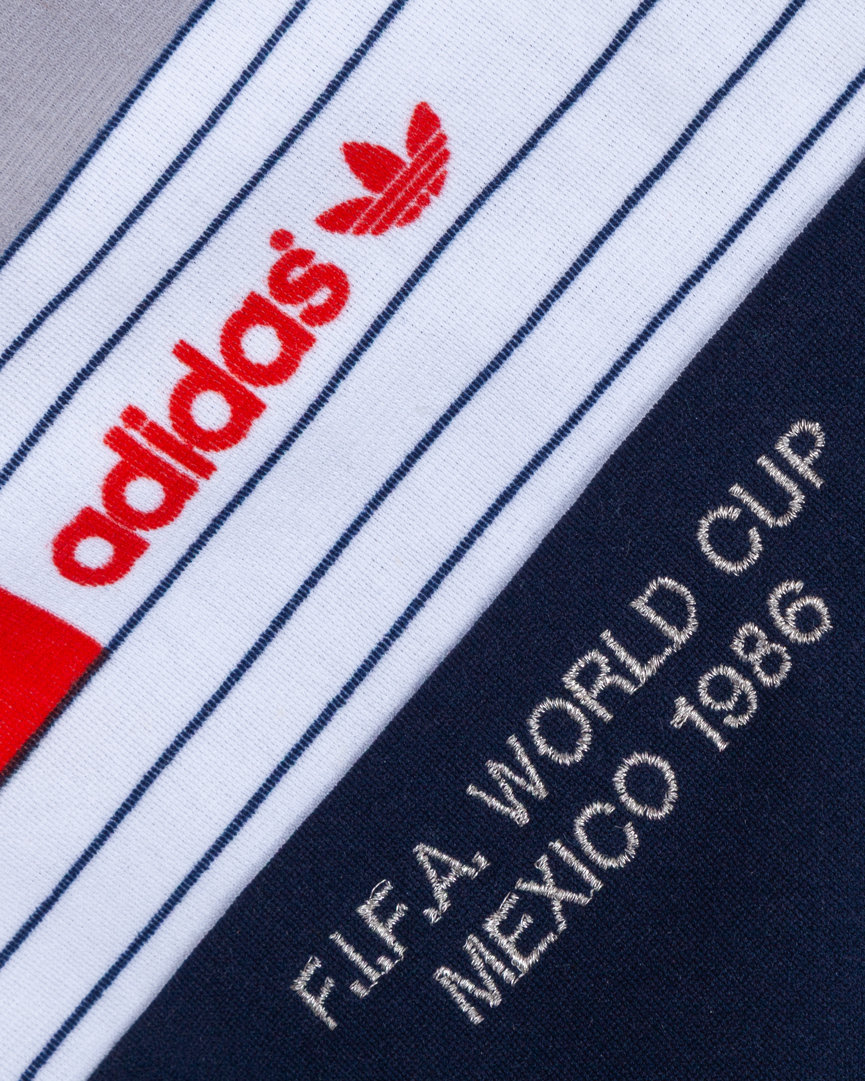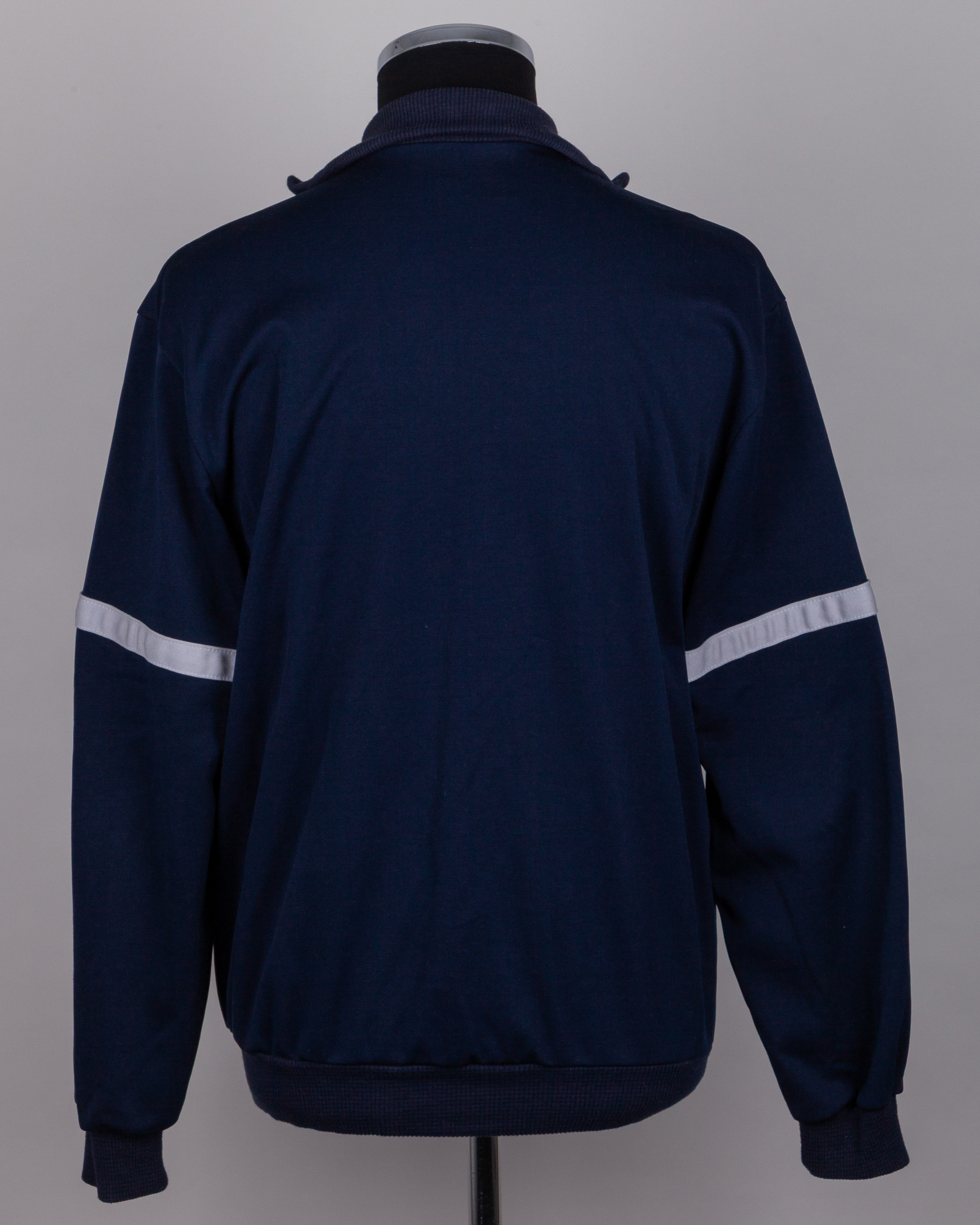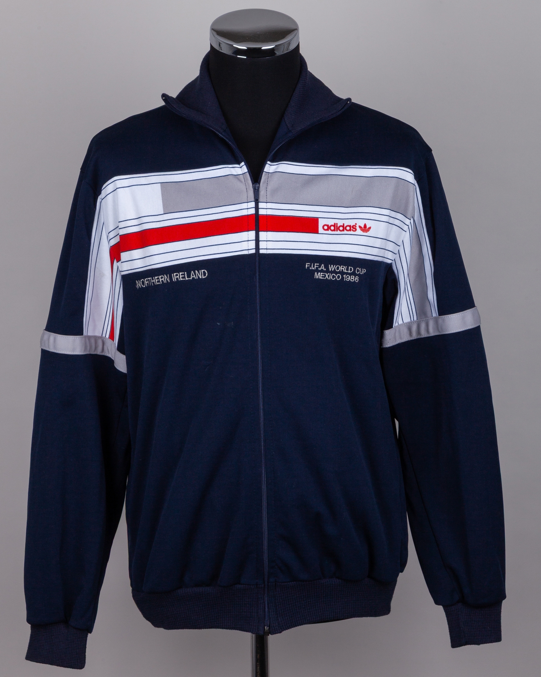 Pat Jennings blue, white and red Mexico World Cup tracksuit top, 1986, Adidas, L, with zip-up front and embroidered badge inscribed NORTHERN IRELAND F.I.F.A. WORLD CUP MEXICO 1986, with Pat Jennings Collection autographed COA